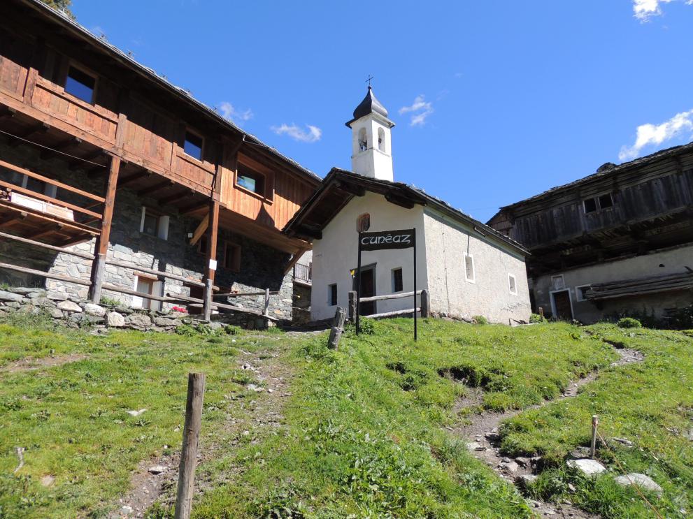Dal colle si scende nella comba di Cuneaz con segnavia 11a e con un paio di tratti molto ripidi agevolati da una corda si arriva al bel paesino di Cuneaz.