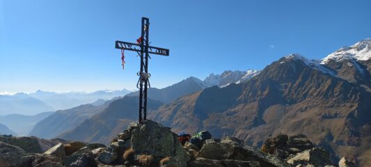 Lasciata l’auto al bivio per l’Alpe Promindoz. Abbiamo raggiunto la vetta con percorso ad anello, ricongiungendoci in salita con il sentiero proveniente dall’Alpe Layet e scendendo per l’Alpe Verser e Champlong. Dalla cima bel colpo d’occhio sulla conca del Breuil, dominata dalla gran Becca e dalla spettacolare barriera delle Grandes Murailles. Temperature piuttosto elevate e colori autunnali spettacolari.