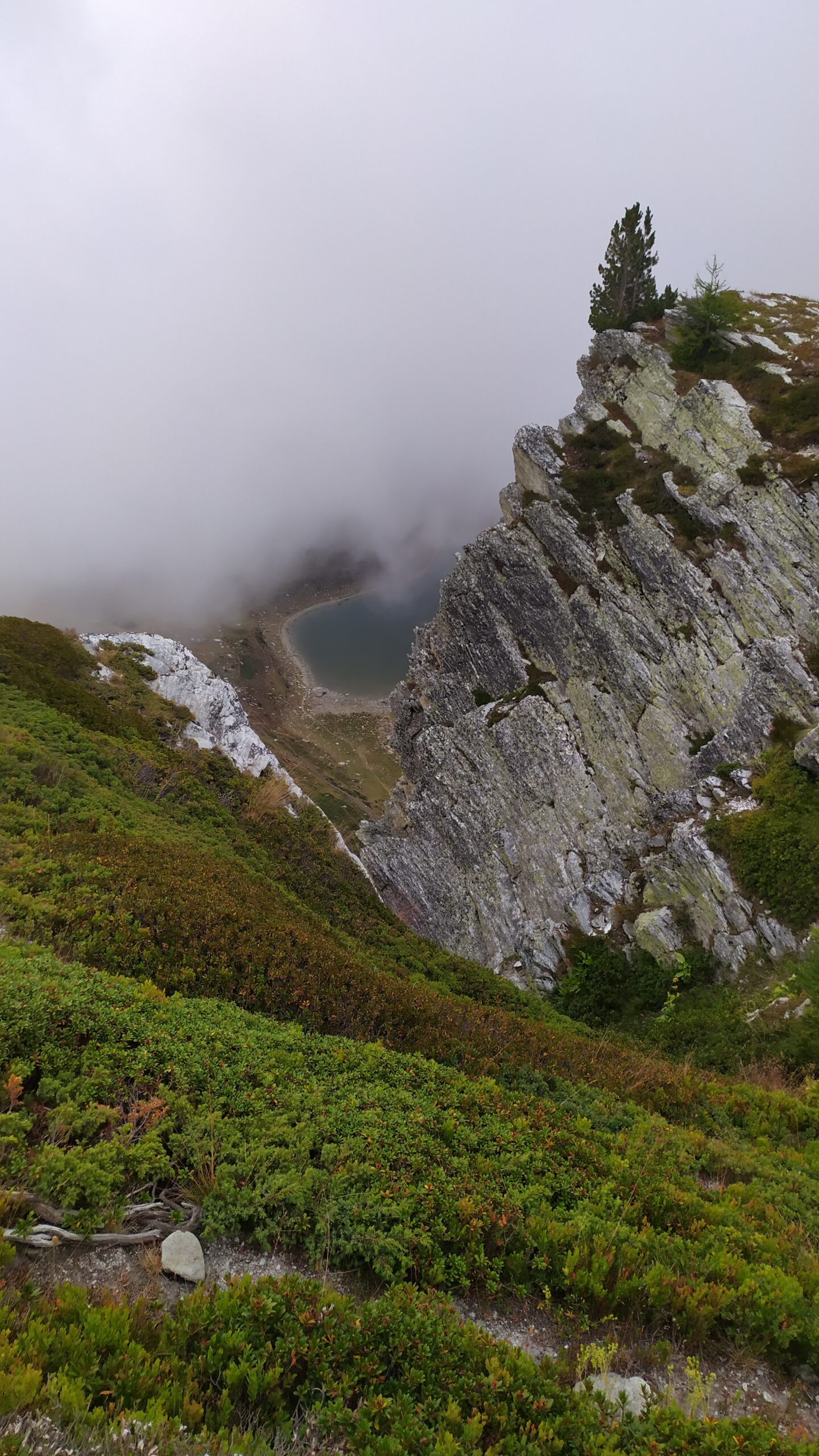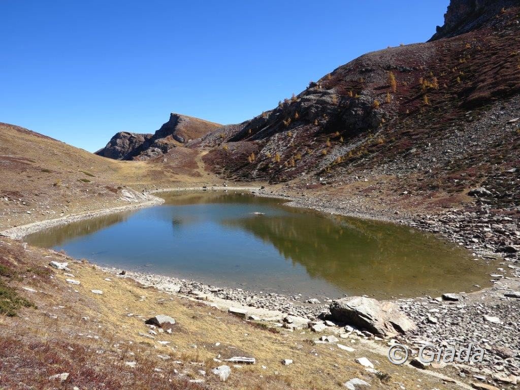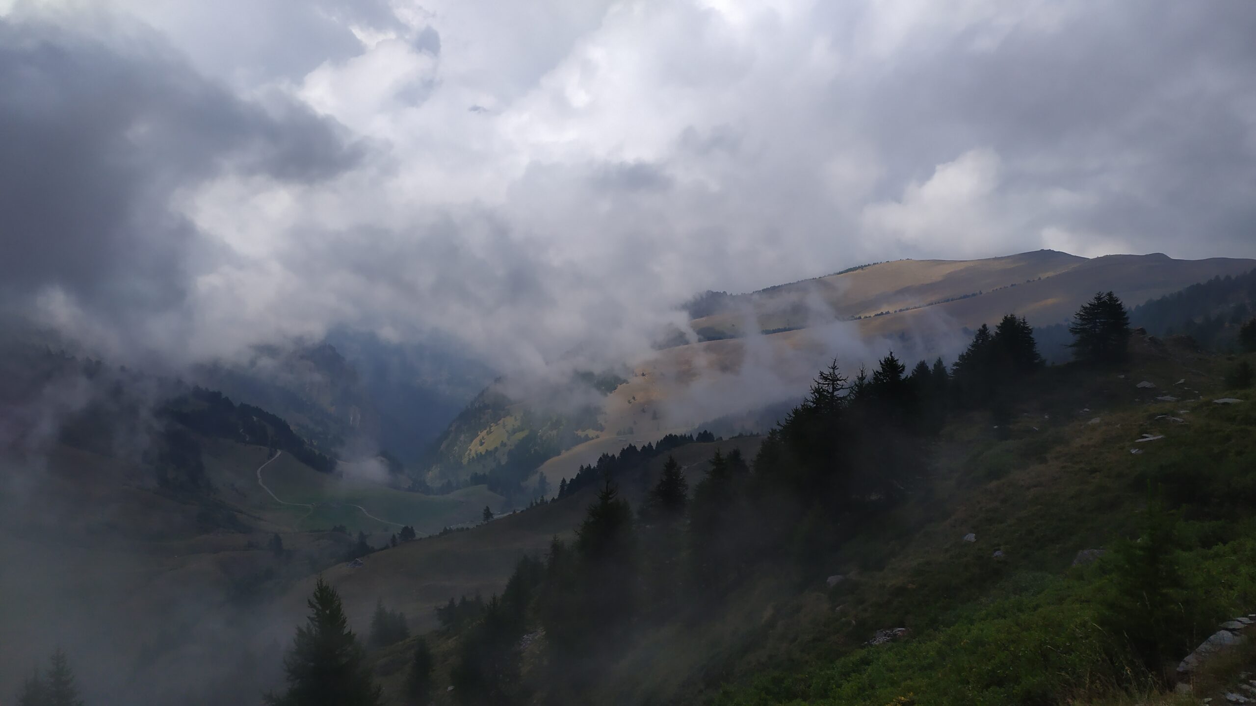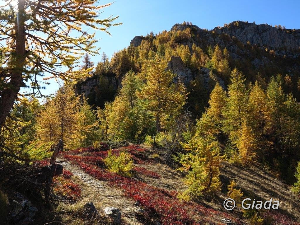 Dal Colle Intersile Sud si sale sulla costa erbosa in direzione Sud verso Punta La Piovosa, una traccia di sentiero si inoltra tra i larici fino ad un tratto quasi pianeggiante per poi inerpicarsi su pendii piu’ ripidi e scoperti fino a raggiungere l’ampia cresta sommitale della Punta La Piovosa m.2602 (croce bizzarra). Seguendo il pendio in direzione Est si scende alla meglio fino alla conca sottostante che ospita il Lago Tempesta m.2347 a nord della omonima cima. Dal lago si va in direzione est col sentiero fino ad andare a immettersi, cercando di perder meno quota possibile, sul sentiero segnato in bianco e rosso che dalle Grange Chiot va al Colle Intersile passando dal Badale Intersile. Poco dopo aver superato la Rocca della Comunetta si prende il sentiero a sinistra che torna indietro e va verso la Rocca, lo si lascia sul colle per salire a sinistra alla meglio il pendio erboso che porta sulla Rocca della Comunetta m.2487. Dalla cima si torna indietro a prendere il sentiero e lo si segue verso le Grange Tibert, si scende verso il pianoro delle Grange cercando una traccia senza scendere troppo, si traversa verso sinistra e si sale lungo il versante est della Rocca della Comunetta tra traccia e erba alta fino ad andare sulla dorsale che dalla Rocca va al Monte Cialmé. Tra vari sali e scendi sul crinale si tocca la quota m.2385, si scende il castello roccioso aggirando le asperità e si prosegue verso nord sempre sul crinale fino al Monte Cialmé m.2308 sfruttando una traccia. Dal Cialmé si scende verso ovest lungo la dorsale fino ad andare a prendere il sentiero/traccia delle mucche che ci riporta alle Grange Chiot m.1980. Da li con la sterrata si ritorna al Colle Intersile Sud all’auto concludendo l’anello.