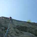 Un primo tiro facile ed aggirabile ci porta a una cengia e a fare sosta su un albero, poi il tiro da 50mt seguendo una fessura in parte verso sinistra. Trovato due chiodi vecchi ravvicinati a metà parete, quindi non siamo i primi a salire. Il passo più duro è a metà parete di 6a+…?. Utilizzati 3 chiodi a lama e un nut + 3 chiodi per la sosta.