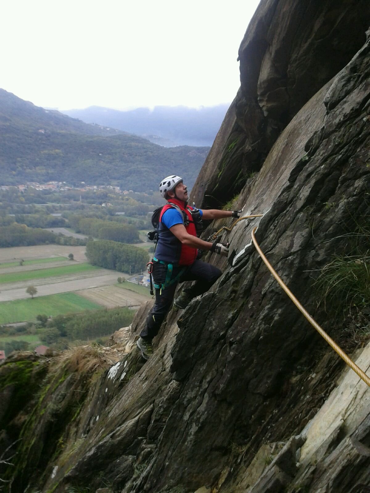 Oggi giornatina fresca ( 9 gradi al parcheggio) e relativamente coperta, tuttavia dopo un decina di minuti si inizia a scaldarsi è il problema della temperatura non è più rilevante: Roccia in alcuni tratti scivolosa, soprattutto nei tratti all’ombra. Dopo esattamente due anni, ritorno a fare la ferrata. Questa volta, forse con un po’ più di esperienza, ho potuto apprezzarla meglio. Specie il tratto intermedio dove vi sono pochi scalini artificiali e più appigli naturali, in questo modo ho cercato di più l’arrampicata che il traino del cavo. Bella e divertente che merita di essere percorsa, non solo per la ferrata in sé ma anche perché molto suggestiva come luogo. I cavi incominciano a deteriorarsi, in alcuni tratti sono stati sostituiti. Penso ,che la valutazione della gita PD sia un fuorviante, perché in alcuni tratti le difficoltà aumentano(AD forse sembra più appropriata come gita), questo non tanto chi normalmente pratica ferrate ma quando si porta un novizio. Mi sono portato il mio amico Mimmo ( 2° ferrata per lui) e le tre orette gli sono risultate un po’ stancanti, ma Lui grande come al solito non ha desistito. Rito finale: bar con un buon bicchiere di vino e un panino tomino piccante e acciughe al verde( sembra strano ma era una bontà, infatti alla fine ne abbiamo mangiati 2), da non far mancare.