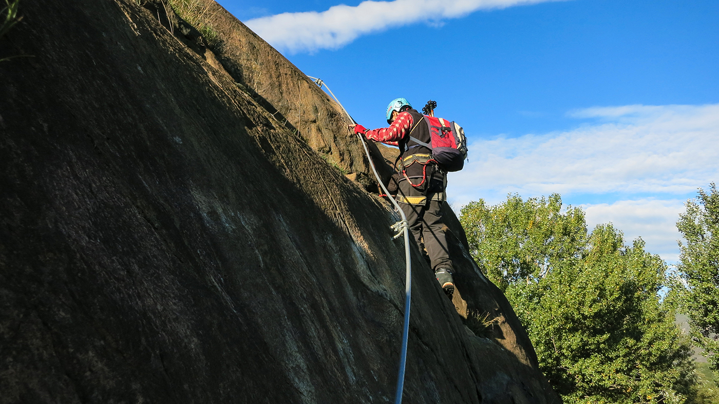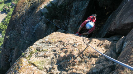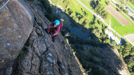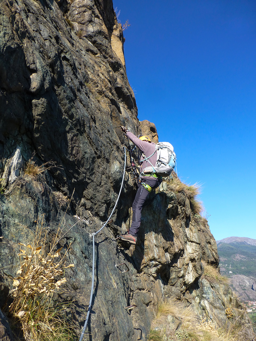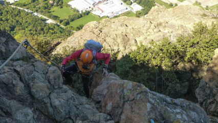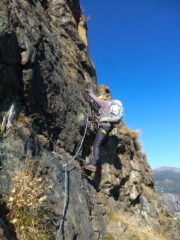 La ferrata è in ordine, la pioggia dei giorni scorsi ha anche contribuito a togliere un pò di untume e quindi direi che è quasi perfetta. Oggi il ponte tibetano era particolarmente ballerino ma la colpa probabilmente era del vento che ha iniziato a tirare proprio quando abbiamo iniziato l’attraversamento.