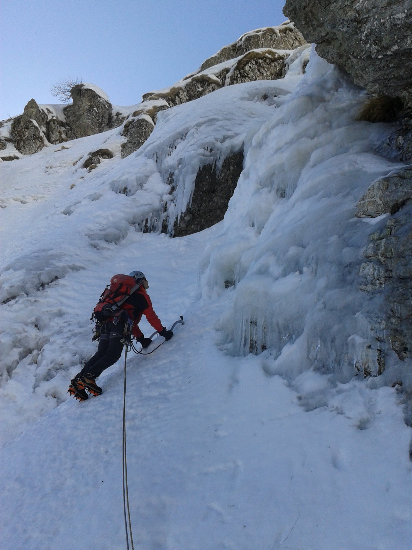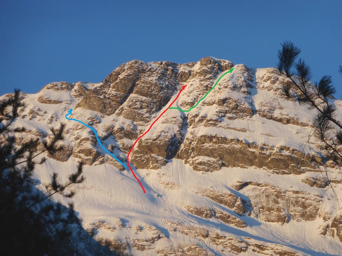 Vi si entra (45-50°) e lo si segue verso destra, incontrando dapprima una strettoia (60°, ghiaccio), poi il terreno si allarga (50°) e si giunge a una specie di spalla esposta (45°). Si sale dritti (protezioni su alberelli più o meno esili) superando dapprima un salto molto delicato (65-70°, spesso scoperto con erba e cespugli affioranti) e poi un breve pendio nevoso, che porta alla vetta.