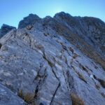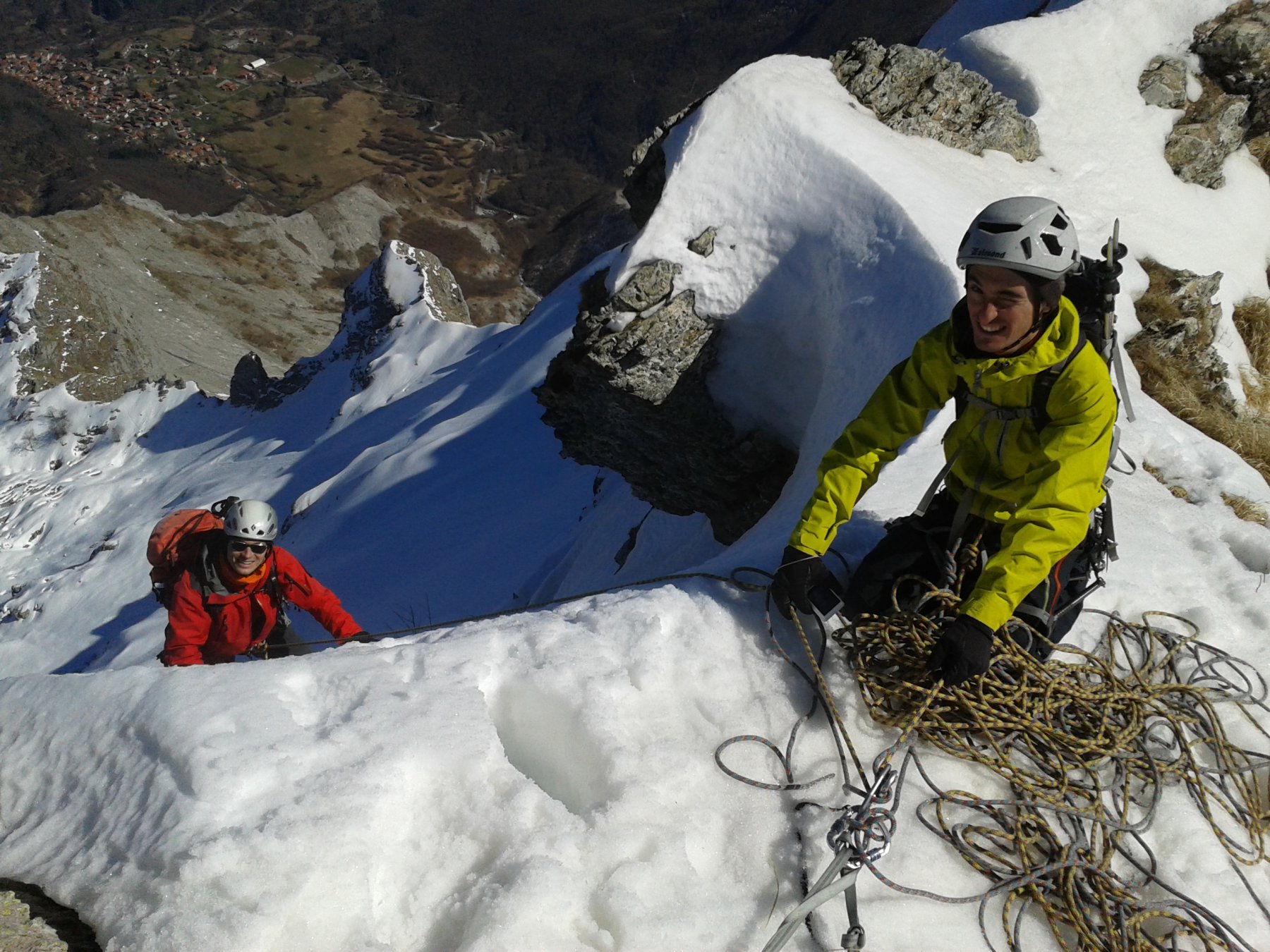 Discesa per la via normale dal Canale delle Rose (sul versante opposto; rientro molto lungo) oppure sul versante di salita, scendendo dalla parte alta della cresta della Mirandola (possibile doppia su albero) per poi ricongiungersi con l’itinerario dell’avvicinamento.