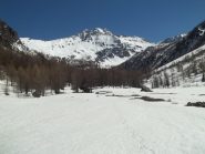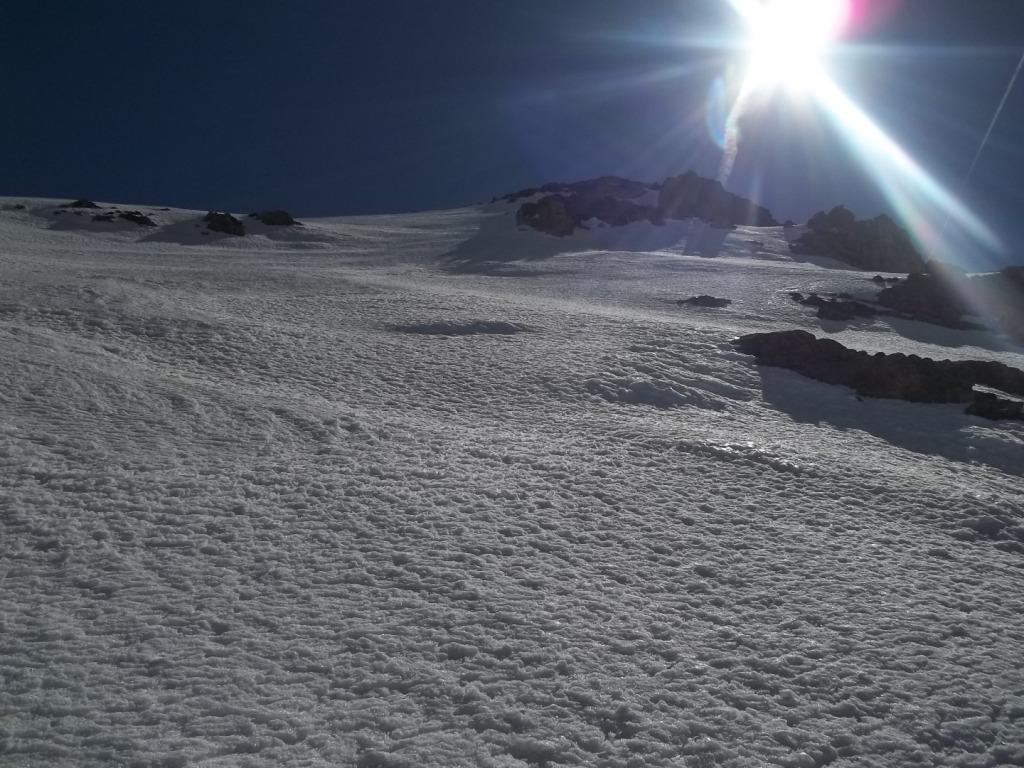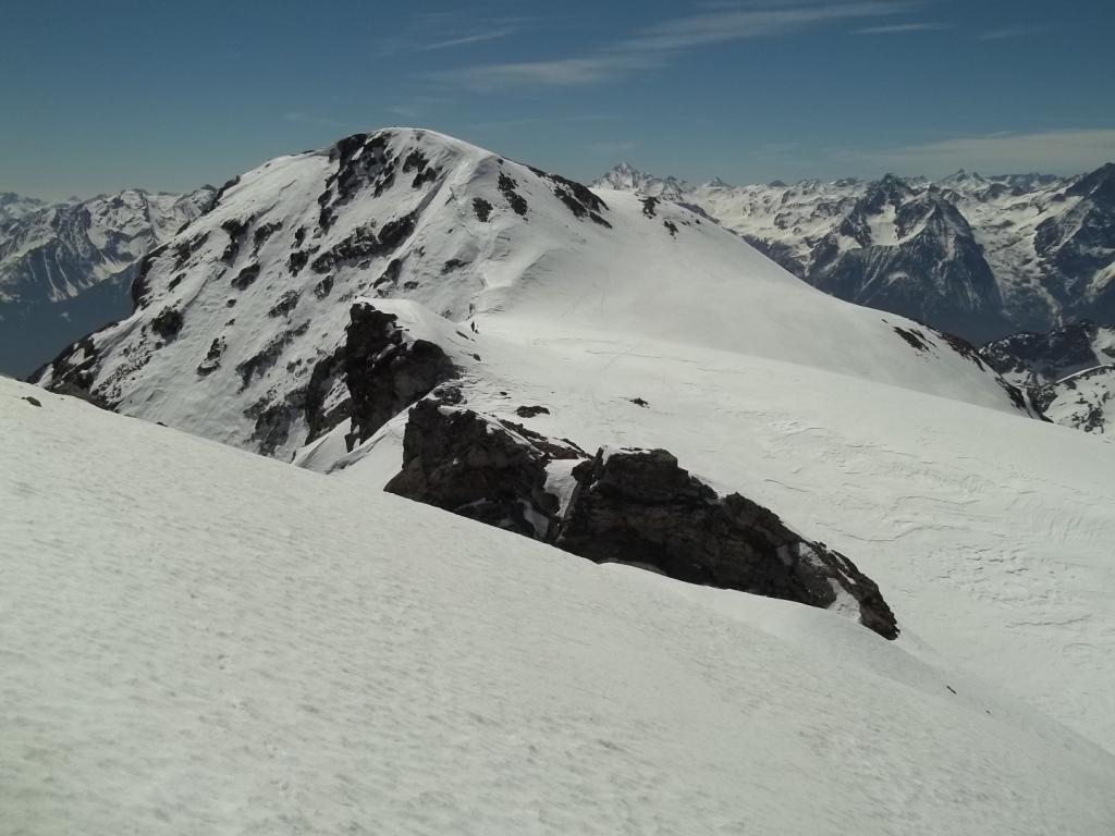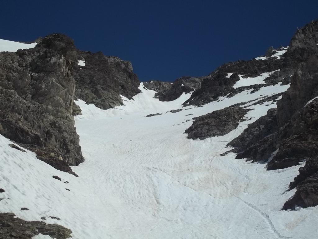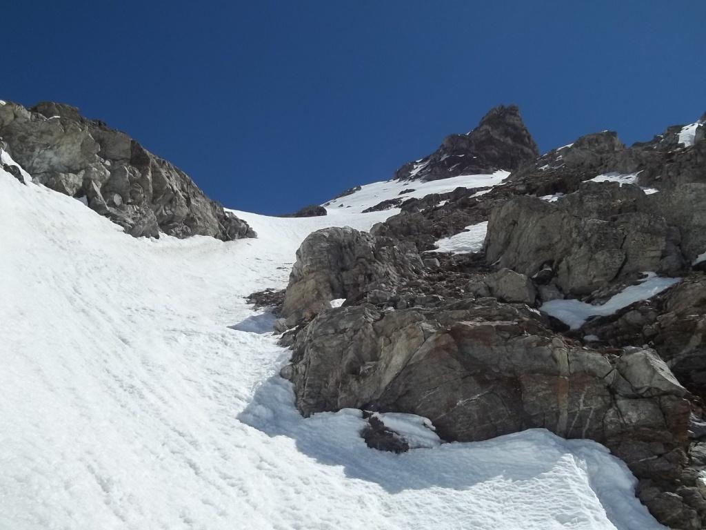 Usciti sul pianoro soprastante si piega decisamente verso est in direzione del bel canale che porta alla conca che si apre tra il Pisonet ed il Dente Settentrionale di Vessona (3080m). Raggiunta la conca si piega leggermente verso sinistra e si superano gli ultimi ripidi pendii che difendono l’ accesso alla sommità del Pisonet.