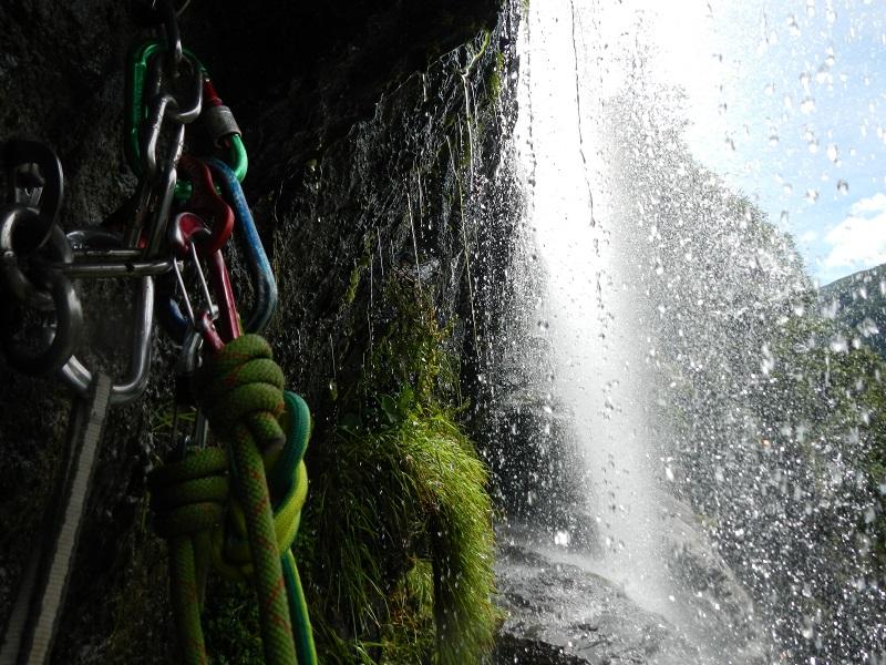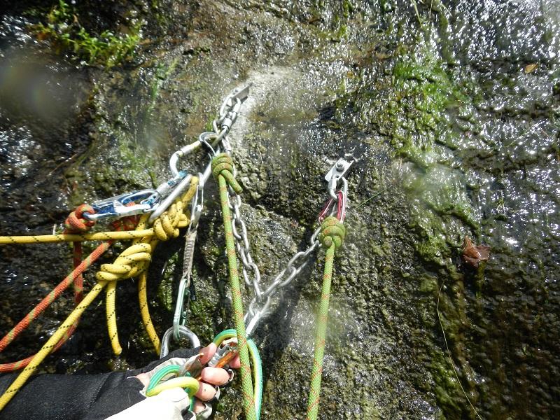 Concluso il riarmo sulla verticale centrale del cascatun. Dalla sosta dell’albero spostarsi in diagonale verso l’acqua per raggiungere una solida catena con due attacchi, c15 delicata, calare nella polverizzata cascata fino a raggiungere la cengia mediana (c38), dove abbiamo aggiunto una nuova catena inox. La calata seguente (c75) è una sinfonia potente tra goccioline e arcobaleni. pit-stop all’eva d’or ancora immutati poi Vallungo integral.