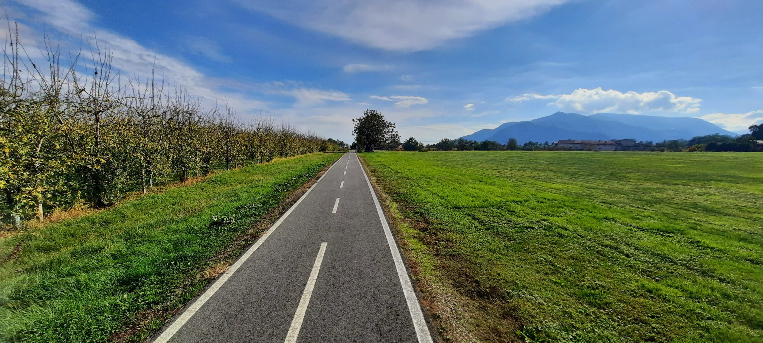 Lunghezza percorso 11 km interamente su ciclabile dedicata passando per campi coltivati a frutteto lungo il sedime della vecchia ferrovia Bricherasio-Barge.