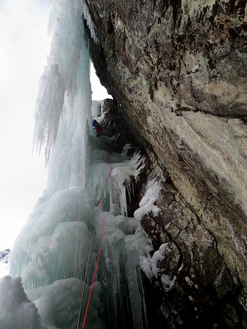 Dopo la prima lunghezza, parzialmente verticale, seguono due facili lunghezze a risalti fino ai piedi del free-standing finale. Due tiri, di cui il secondo spesso su ghiaccio complesso e non sempre ben proteggibile.