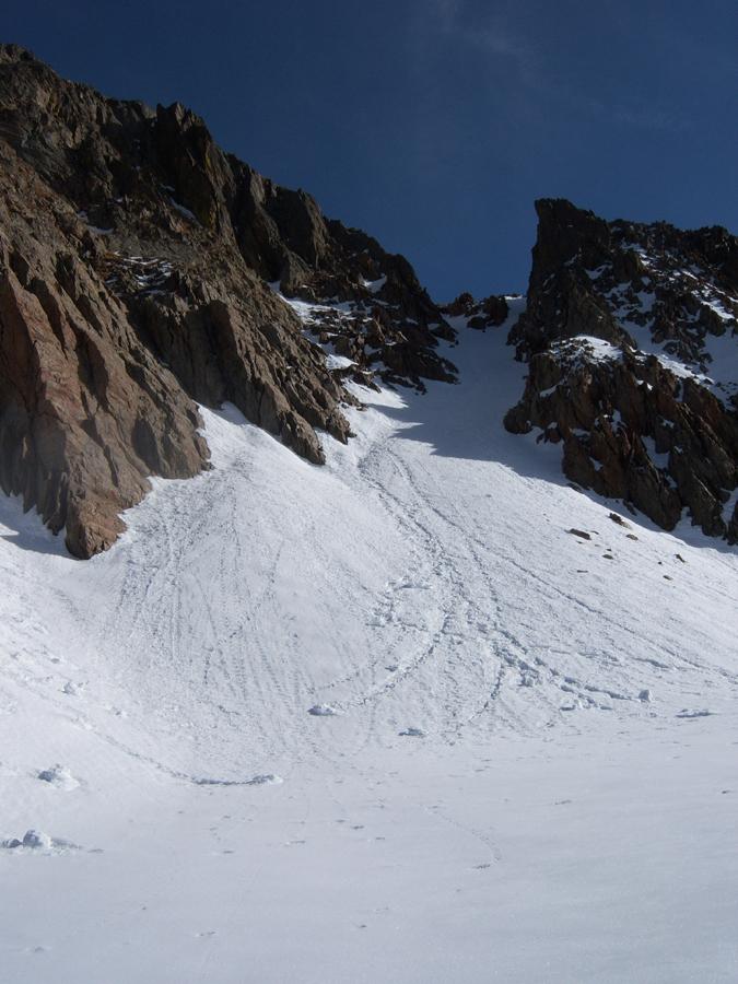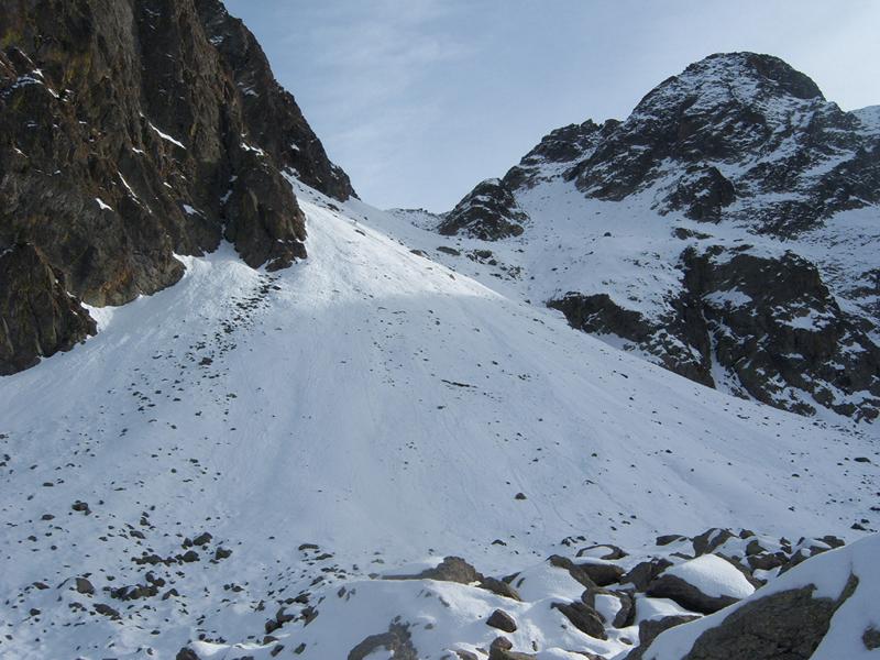 Qui occorre abbandonare la traccia verso il rifugio della Lausa (ben visibile sopra alla nostra destra) per attraversare il fondo del vallone e risalire il ripido pendio-conoide a sinistra. Tenendosi prima al centro con ampi zig-zag e poi traversando con prudenza verso dx si giunge in una zona di pendenza moderata.