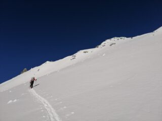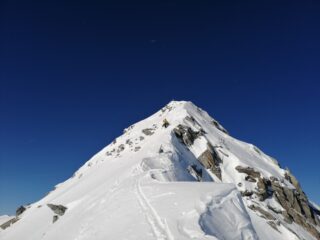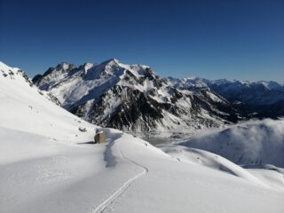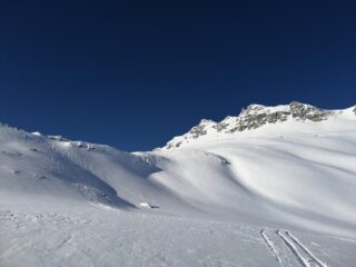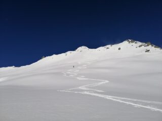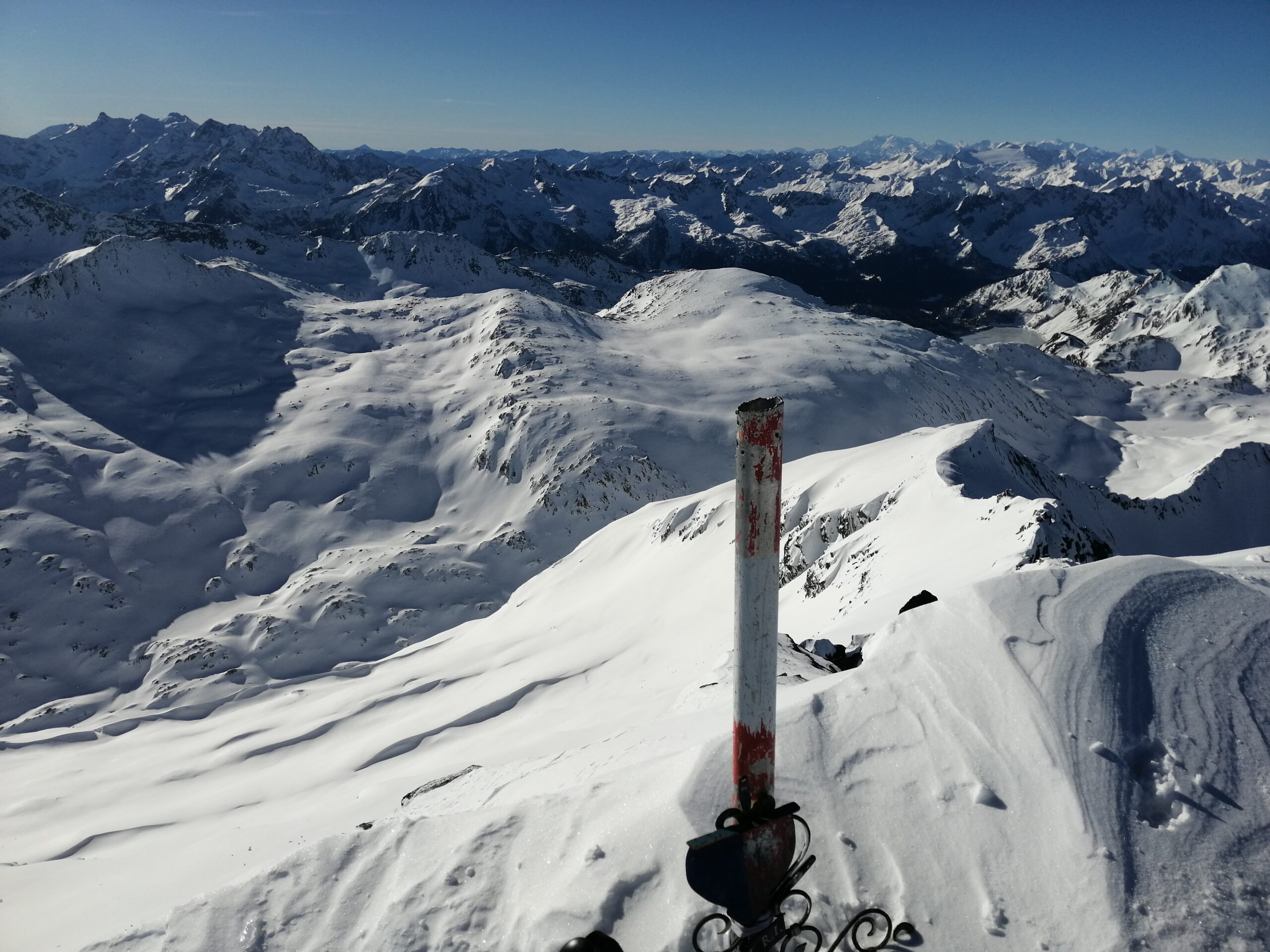 Attenzione che in salita bisogna seguire il lago senza mai salire fino al fiordo. Tornando alla macchina è necessario un ripello. Da quota 2200 circa ho ritracciato, per fortuna un ticinese mi raggiunto e poi ha battuto gli ultimi ripidi 100m per accedere allo Skidepot. In cima con picca e ramponi, occhio all’esposizione. Vetta flagellata dal vento, per fortuna non troppo gelido. Al deposito ancora più aria e preparativi di discesa fatti nel freezer. Tratto ripido eccezionale su neve leggera, poi scendendo aumenta la densità ovvero la pesantezza della materia prima. Appare poi il trasformone primaverile ma è sempre dura anziché no. Tutto facile fino al lago e ripellata defaticante, sarà un km e mezzo e 50 m di dislivello.