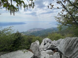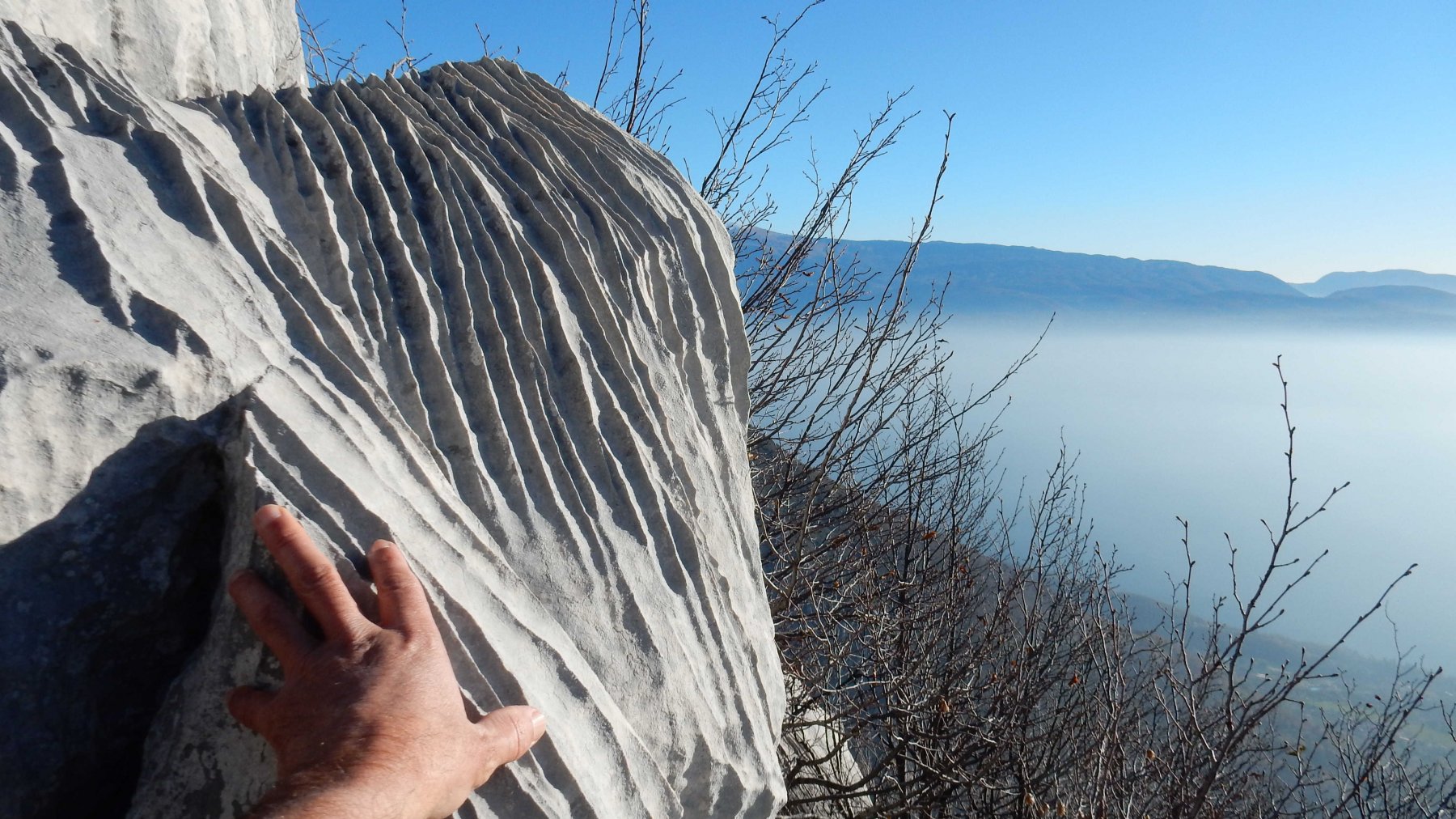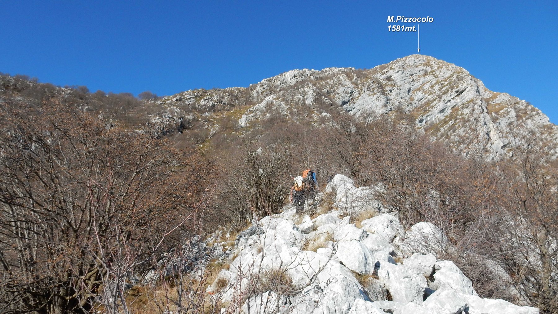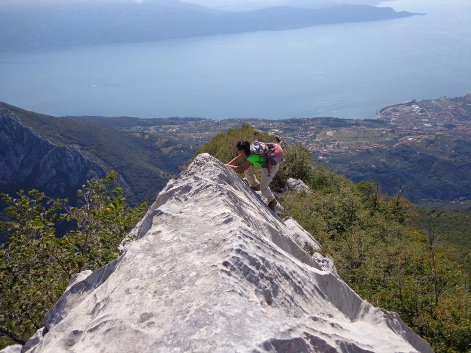 Si seguono le indicazioni, dapprima su strada sterrata e poi su sentiero, lasciano a sinistra la deviazione per la cresta sud (escursionistica). Si prosegue diritti fino ad un capanno con nicchia votiva. Subito dopo si prende il sentiero in discesa (quello in salita si esaurisce dopo pochi metri nel bosco). Si traversa senza guadagno di quota fino a raggiungere le prime roccette della cresta sud-est e poi il primo balzo di una quindicina di metri in buona esposizione. Lo si vince sfruttando i numerosi appigli (clessidre, svasi, lame) che caraterizzeranno anche il proseguo di quest’itinerario. Seguono tratti più semplici intervallati da qualche muretto verticale fino a portarsi sul filo di cresta dove l’esposizione rimane costante, sia pure attenuata in qualche tratto dall’invadente vegetazione. Ottimo panorama sul Lago di Garda e sul vicino Monte Castello di Gaino. L’attenuarsi delle difficoltà è preludio ad un tratto di ripido sentiero nel bosco che raggiunge un’ultima bastionata rocciosa, che, volendo, può essere facilmente aggirata sulla sinistra (ometti), per poi seguire l’ultimo tratto di cresta di roccette miste a erba che conducono alla vetta del Pizzocolo (anemometro, croce, chiesetta oltre ad un piccolo bivacco poco sotto). Tempo: 4h