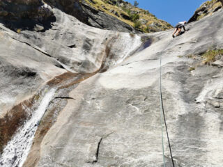 L2 5a (dopo il primo resinato salire un lungo tratto schiodato sino al muretto a lato della cascata alta)