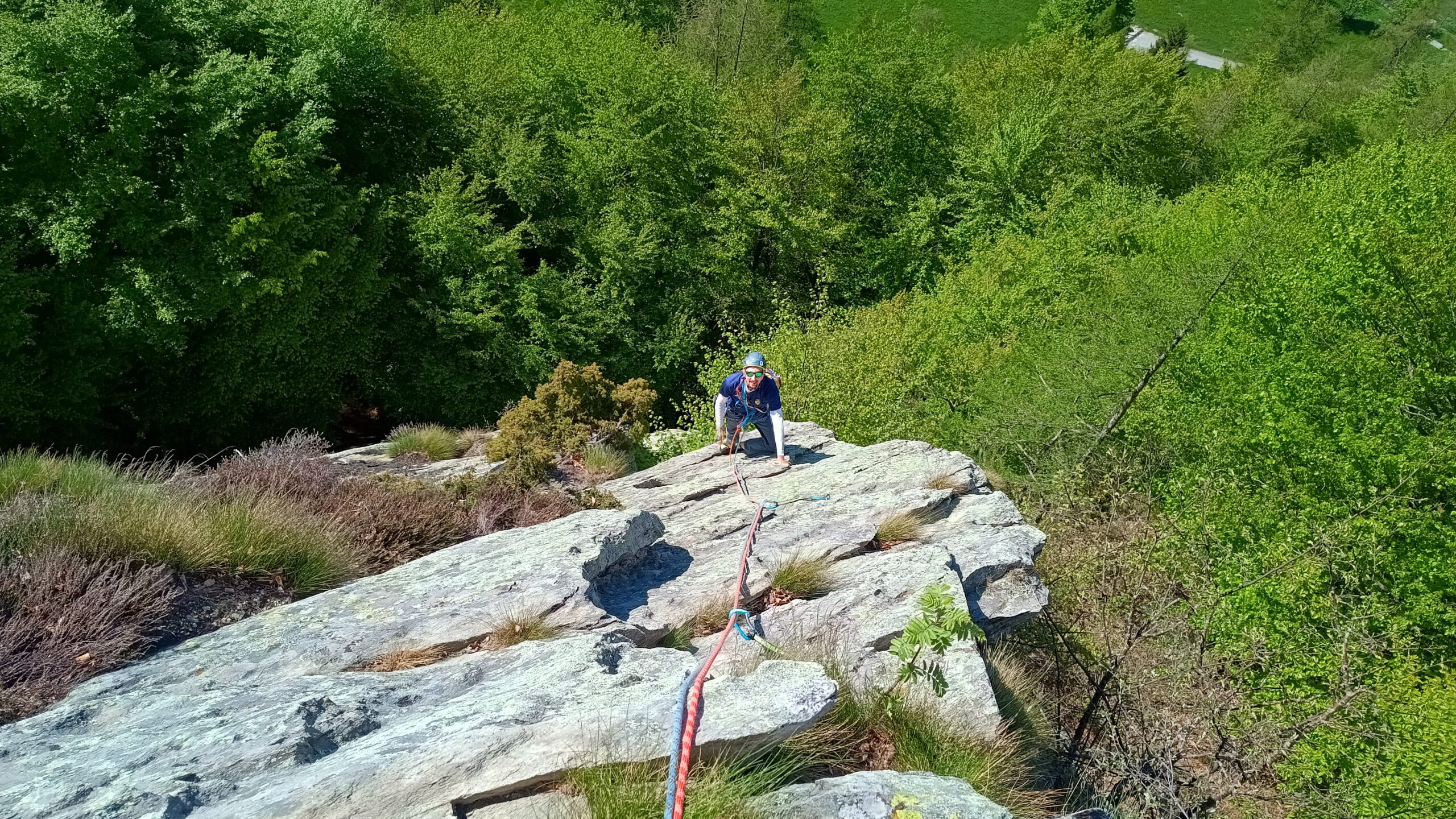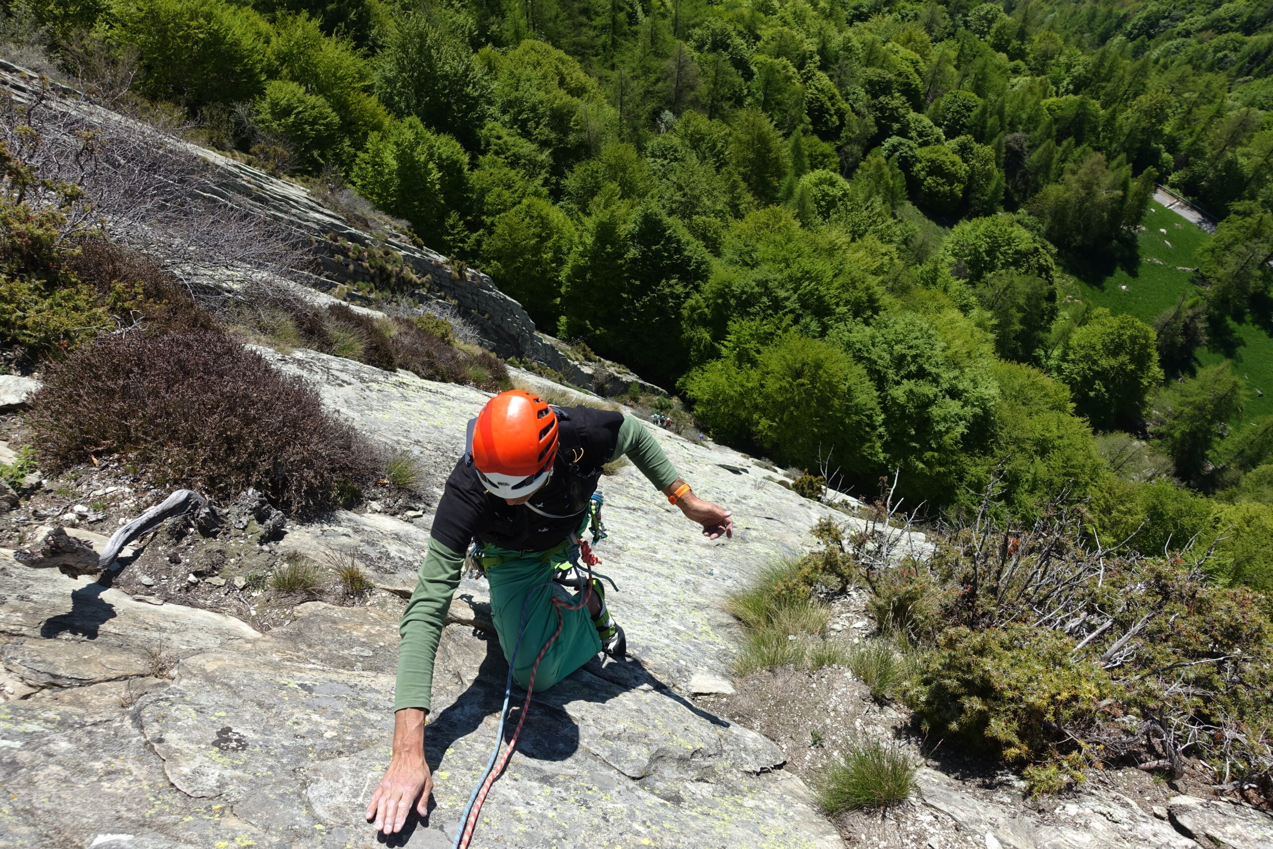 L2 : superare un breve tettino, proseguire su spigolo poi attraversare a sx un diedrino. Uscita su placca 25 m. 5°