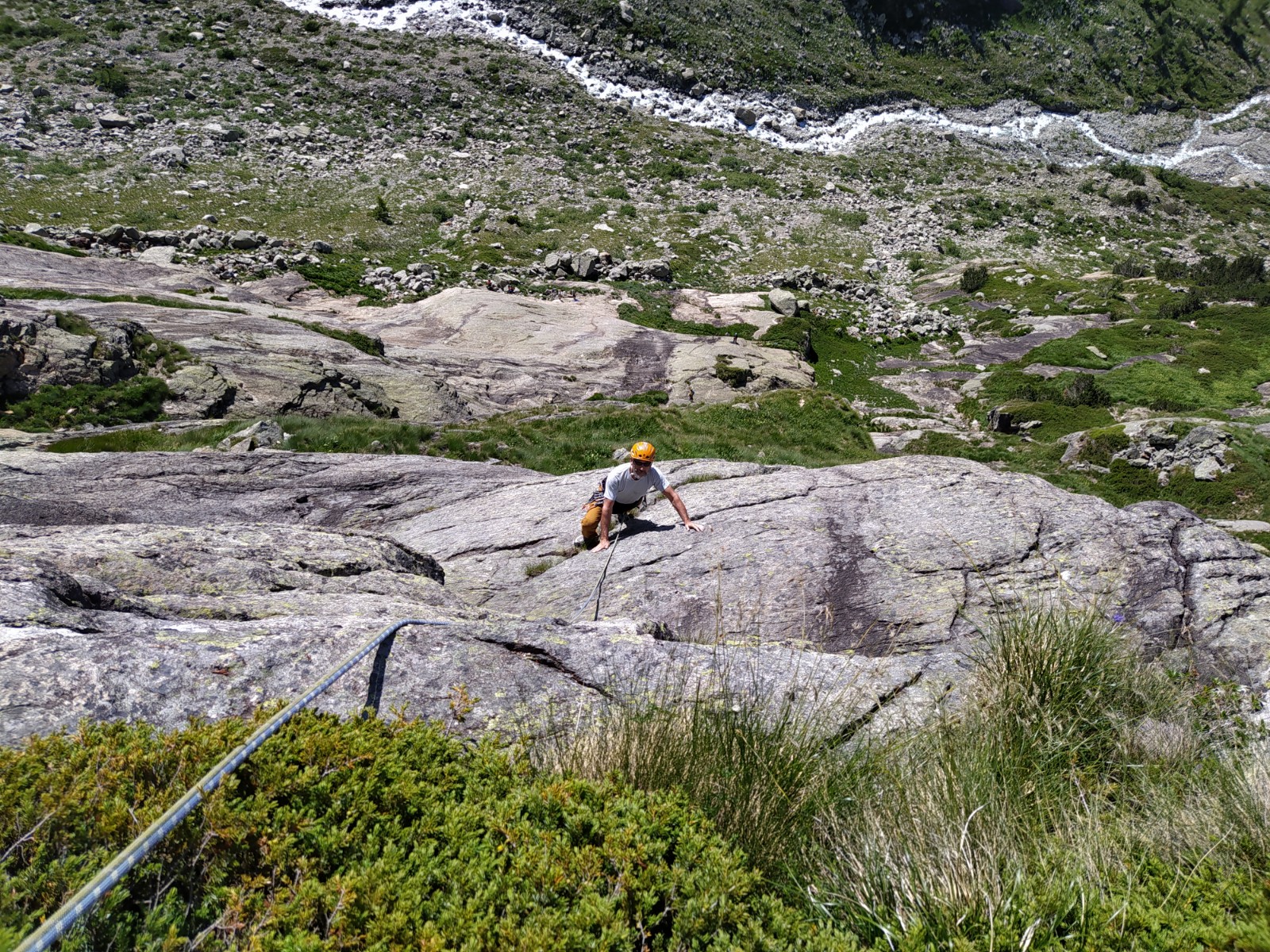 - L4: lunghezza piu’ impegnativa, ben chiodata, su roccia nera, qualche terrazza erbosa e qualche strapiombino. 5c. 30 m.