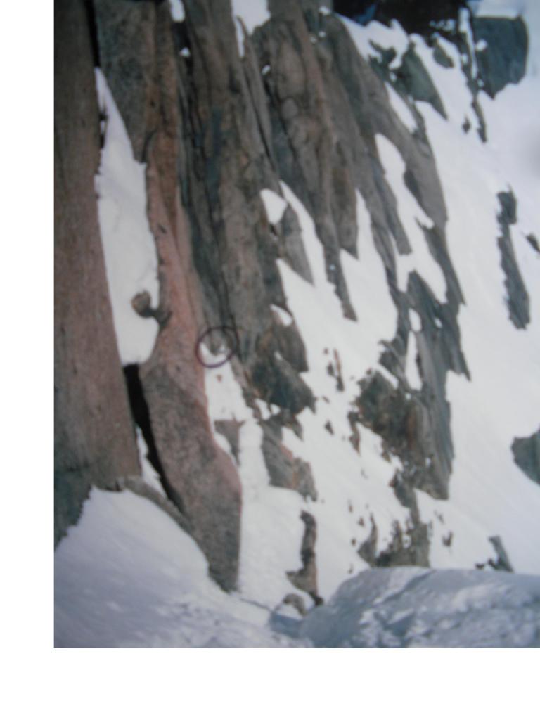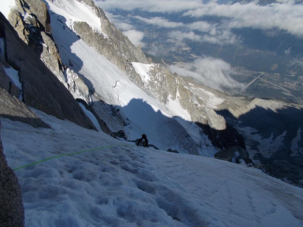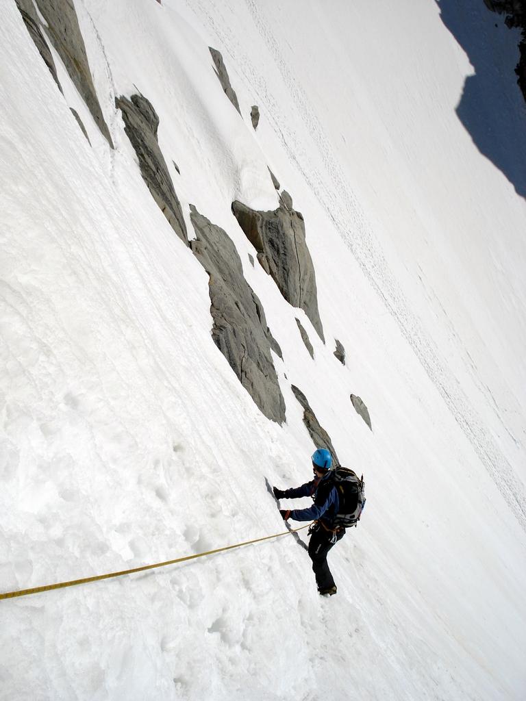 dopo il tratto in piano scendere a dex (versante envers du plan) prima corda doppia 30mt (attrezzata la sosta) da qui spostarsi per un terrazzino a dex (spalle a valle) per una ventina di metri (2 possibilita’: 2 doppie da 30 mt con soste attrezzate o una diretta da 60 mt molto aerea) si continua alla base delle rocce fino al colle superiore e per cresta nevosa ripida fino alla base, aggirando sul versante chamonix per canalini, fessure e passaggio atletico finale si guadagna la punta dell’ aiguille .