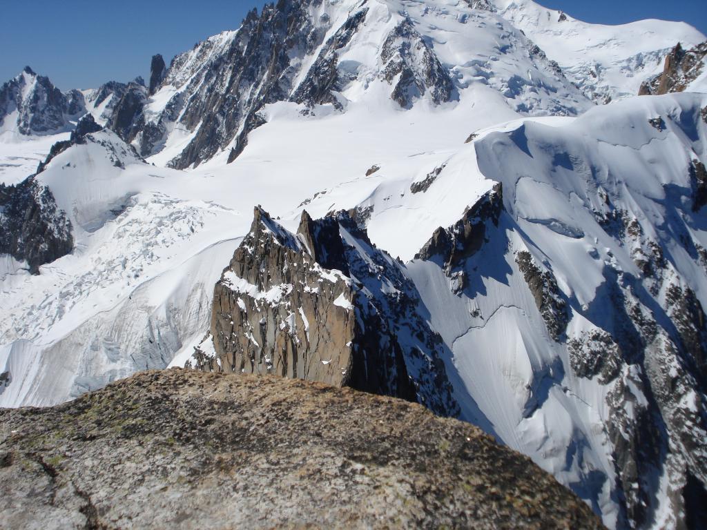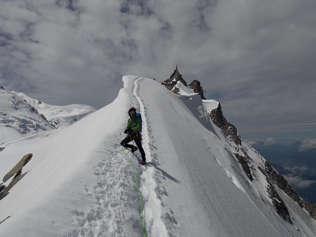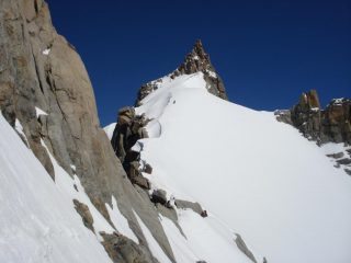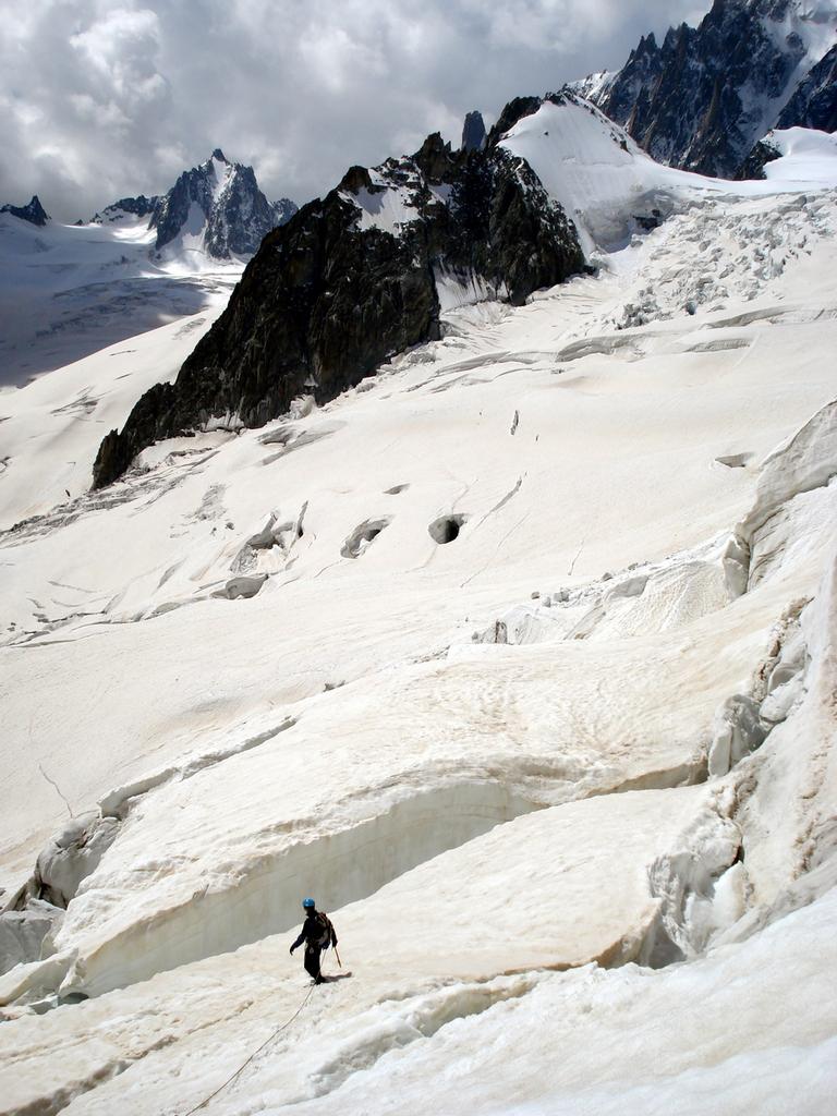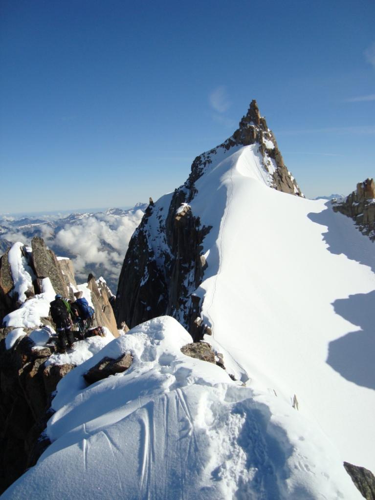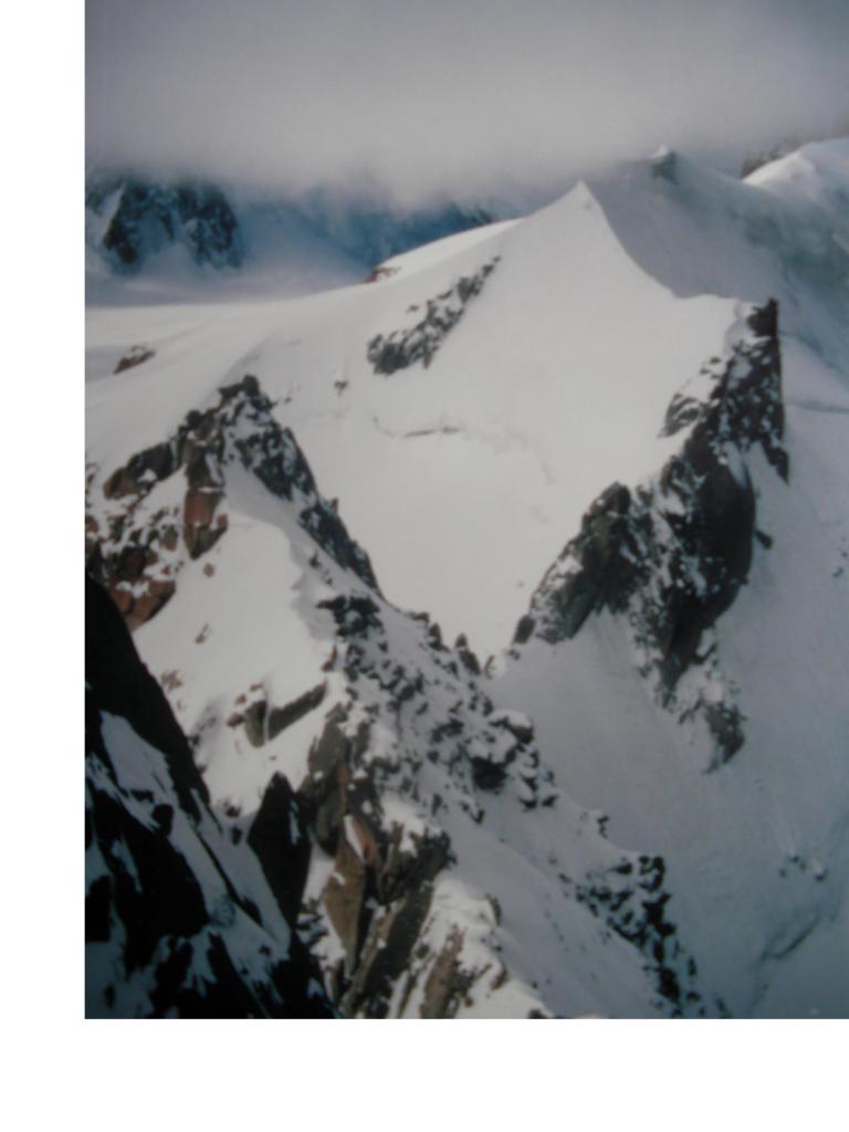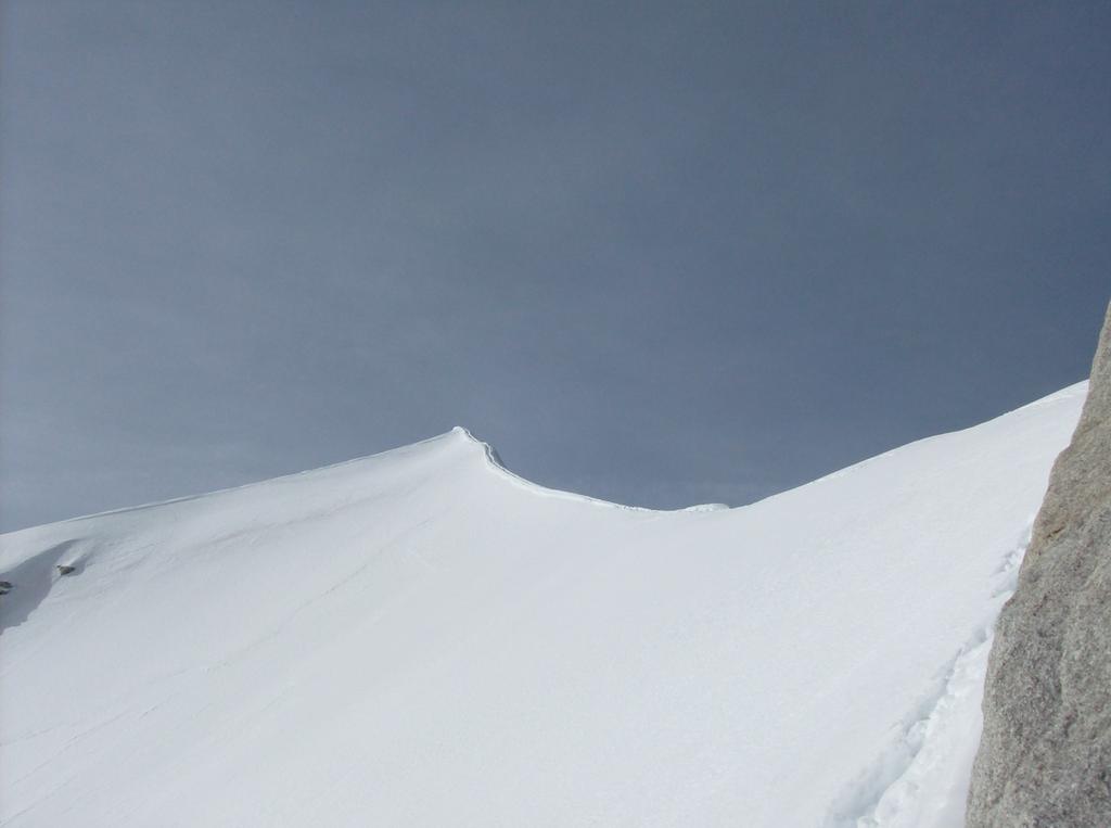 commento: via di cresta anche se non ha molto dislivello non è banale, le condizioni erano buone, se la visibilita non lo permette consiglio il ritorno dalla cresta, l’attraversata verso il rifugio del requin completa un bellissimo itinerario ma le condizioni del ghiacciaio sono proprio al limite, zone molto tormentate con rischio di trovarsi a tornare indietro o finire in crepacci molto profondi, dal colletto subito l’impressione del plateau che si raggiunge sembra buona poi quando la pendenza aumenta l’aspetto cambia e diventa molto difficile scendere (sempre se la visibilita’ è piu’ che buona) guadagnato l’arrivo al rifugio dopo una breve sosta si scende con sentiero ben attrezzato fino al ghiacciaio, per tracce di paletti e qualche ometto si cammina tutto su ghiacciaio fino alla base dell’ultima balza attrezzata con scale di ferro e sentiero per arrivare al trenino di montenvers
