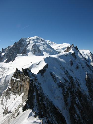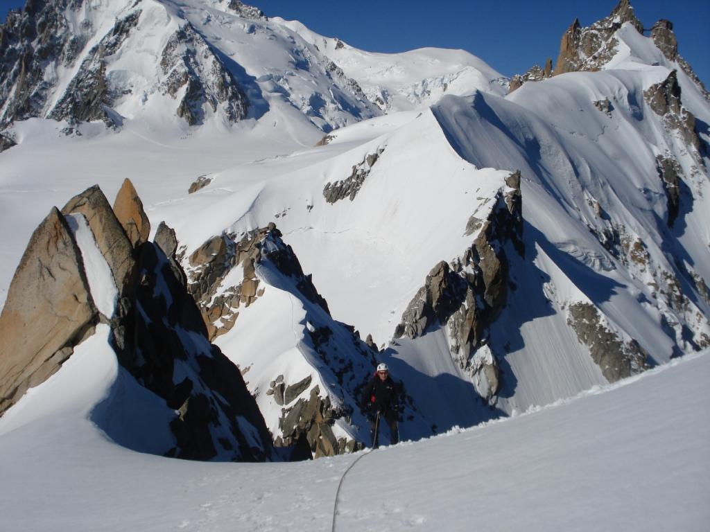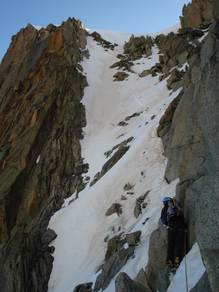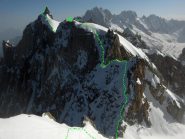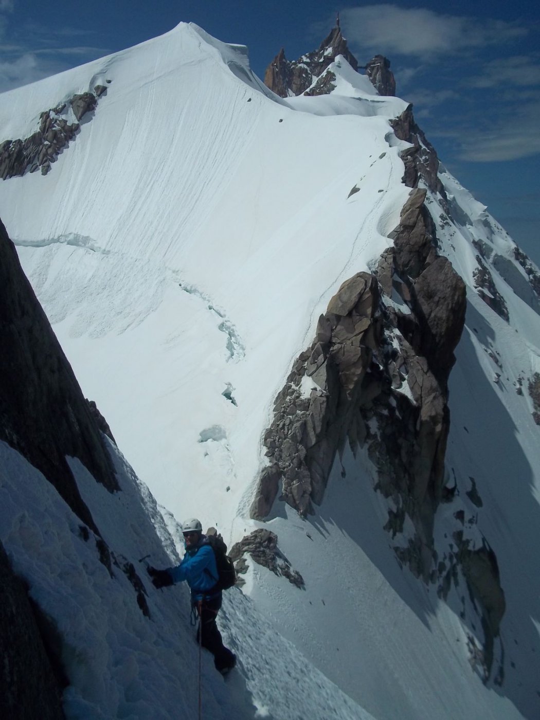 dall’ aiguille du midi scendere la cresta ne (tracce,pendio ripido) fino ad un plateau, per cresta dapprima larga , poi stretta fino al col du plan (ripido alla fine) dal colle seguire la cresta fino alle rocce aggirarle sul versante chamonix e ritornare in cresta, seguirla fino ad una sella nevosa, ripassare sul versante chamonix salire un canalone (nevoso e roccioso) per arrivare ad un ripiano nevoso e continuare in cresta.