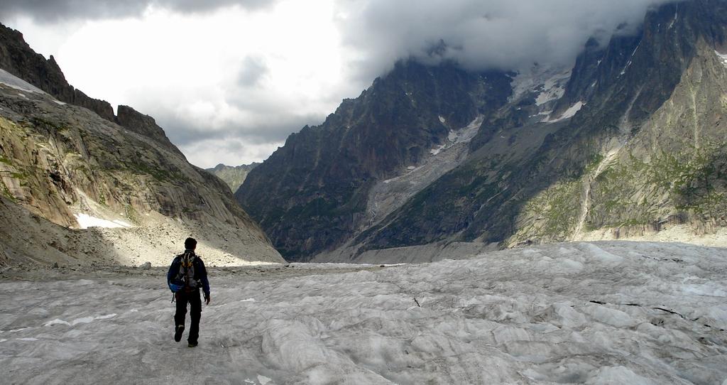 scendere il primo pendio fino al colletto e scendere il ripido pendio fino alla crepaccia terminale, segue un plateau, poi quando la pendenza aumenta bisogna cercare i passaggi migliori nelle zone crepacciate, che possono cambiare rapidamente, si arriva fino all’altezza della dent du requin girando a six, scendere una bastionata rocciosa (placche e diedri anche attrezzati, il rifugio è visibile seguire anche delle frecce bianche e ometti) dal rifugio subito per comodo sentiero poi tratto attrezzato con pioli e scale fino al ghiacciaio della m. de glace dove ci si porta sopra (tracce con ometti e bolli verdi) sentiero fa tutto il pianoro del ghiacciaio (attenzioni ai buchi e tratti di ghiaccio vivo) arrivando dopo 8 km risalendo sulla six delle scale in ferro che portano verso il trenino di montenvers (dal rifugio calcolare minimo 2 ore)