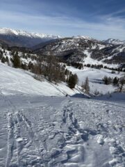 Gita con lo Sciamano, siamo scesi da un canale tra il colletto verde e la plane. Primi 50 metri polvere, poi il vento ha fatto il suo lavoro. Tutto sommato non troppo male.