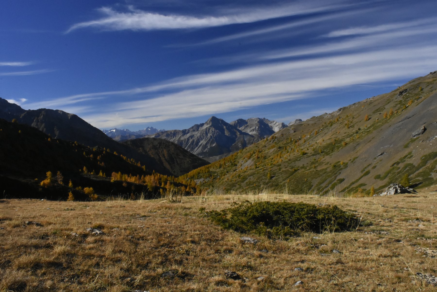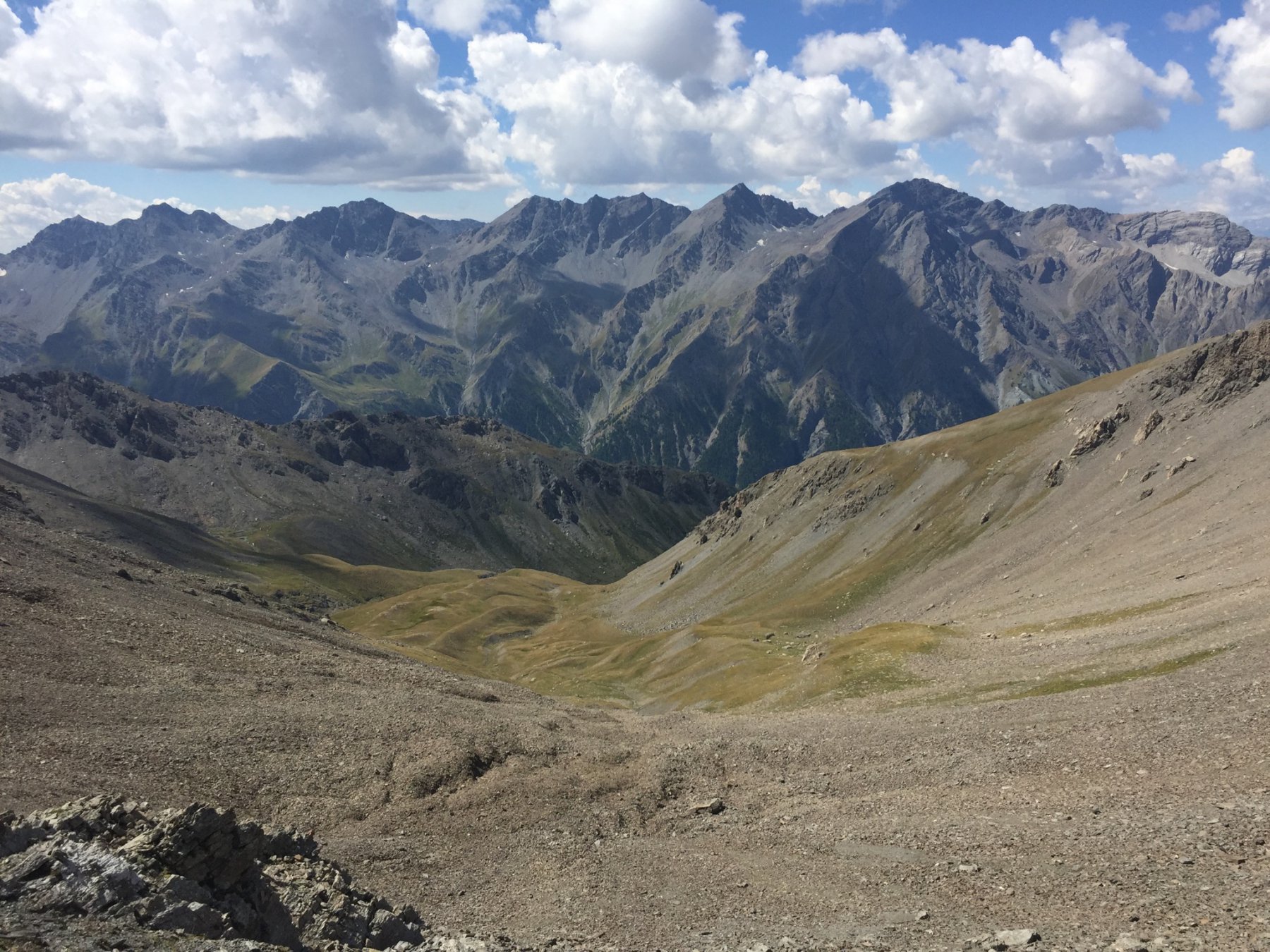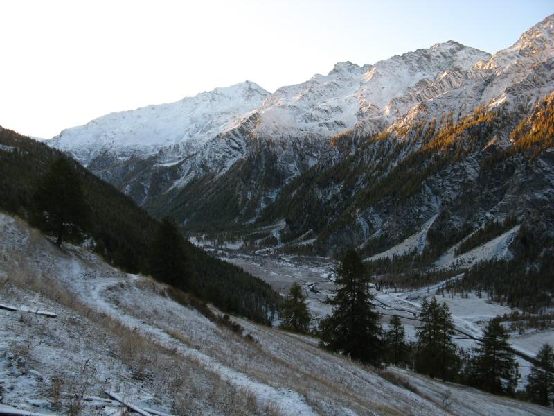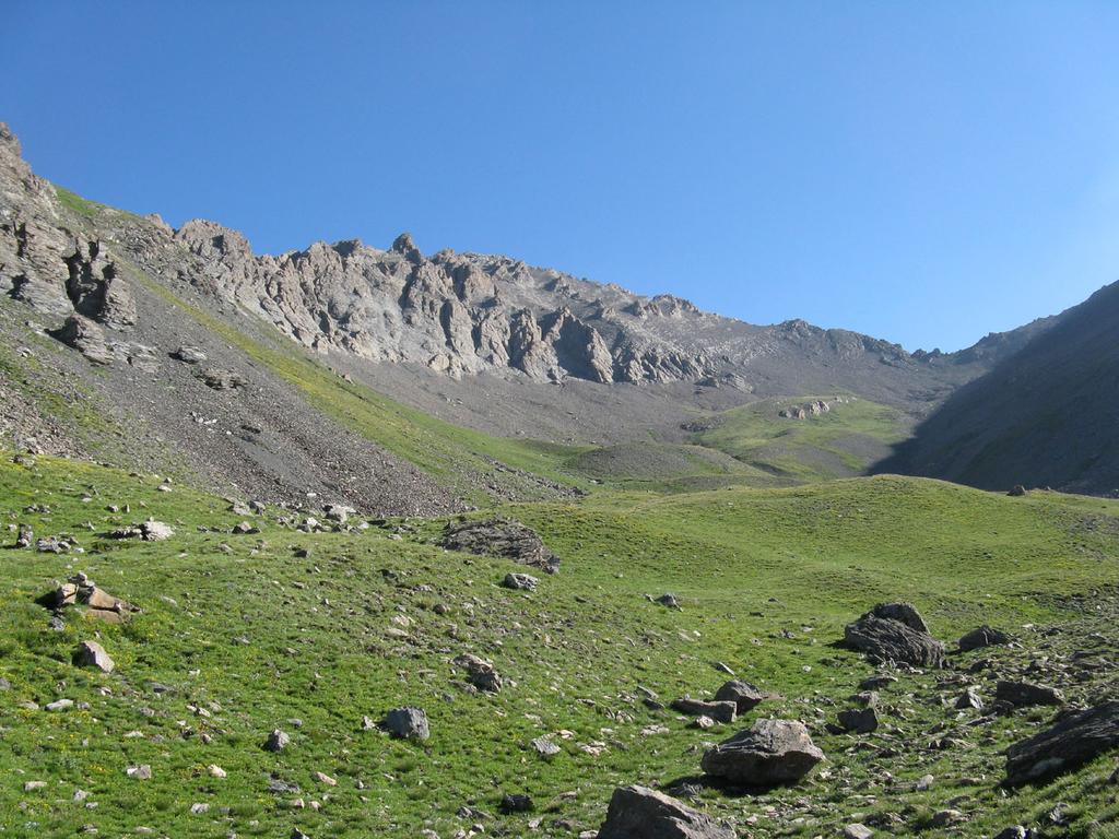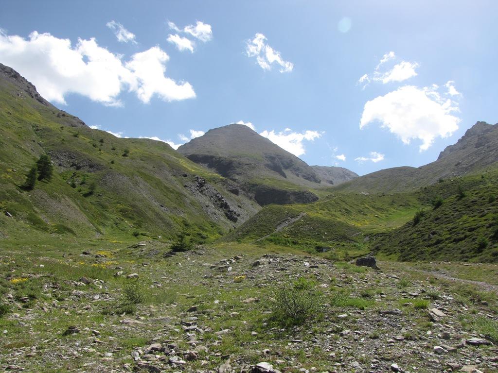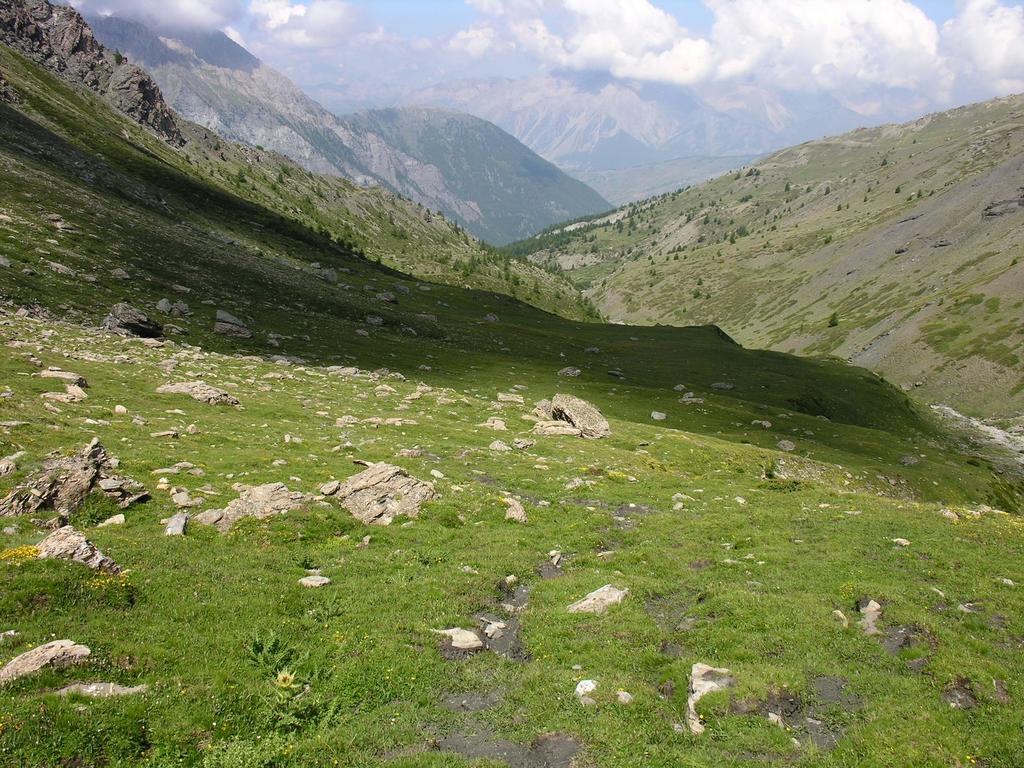 Giunti nella piana dove si trovano alcuni fabbricati credo dell’acquedotto e dove giunge una carrozzabile proveniente da Bessen Hautes, si segue fedelmente il sentiero ben evidente per il colle delle Rocce Platasse fin sotto il Giornalet, a quota 2600 circa, dove il vallone principale piega a destra (e non a sinistra) ed alcuni ometti portano ad attraversare il rio e seguire una traccia che sale il pendio erboso prima entrando in un valloncello tra Giornalet e Platasse, e poi in quello giusto, tra le Rocce del Rouit ed il Platasse.
