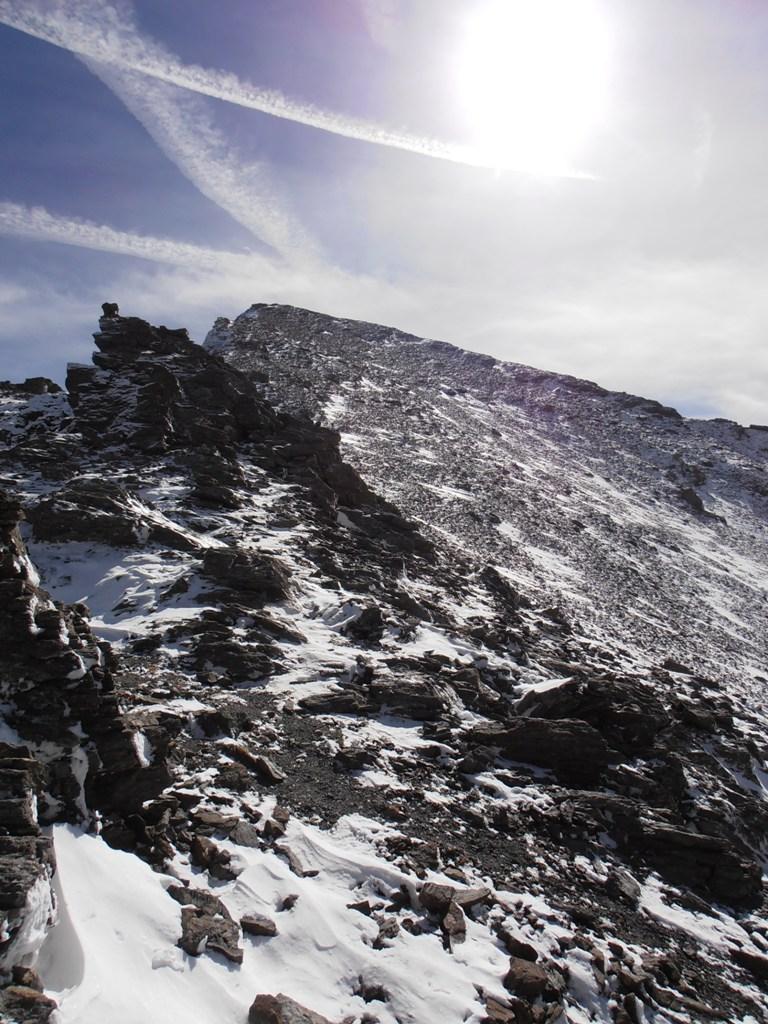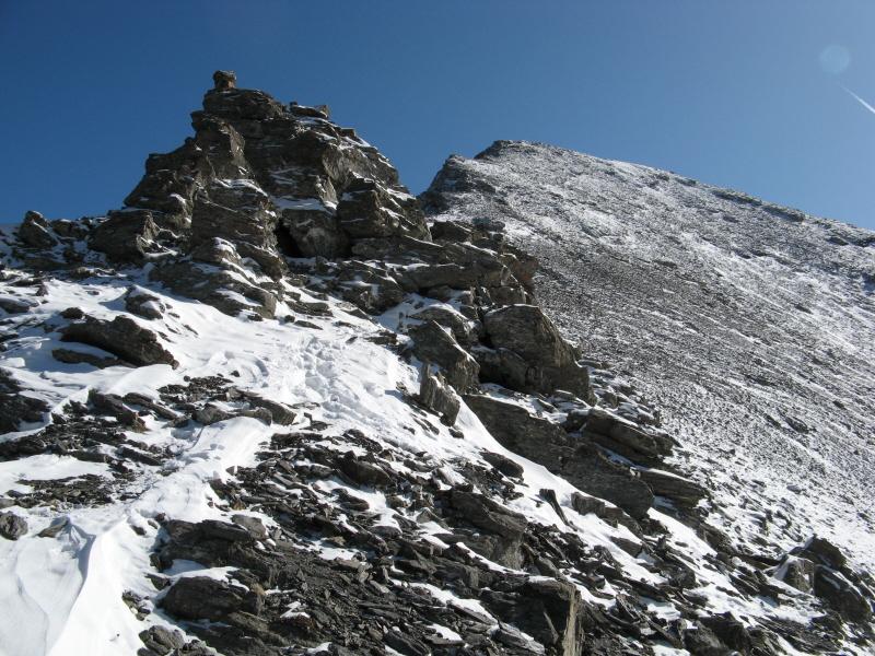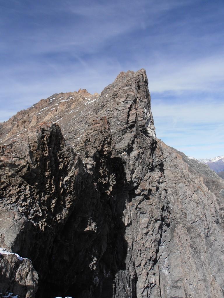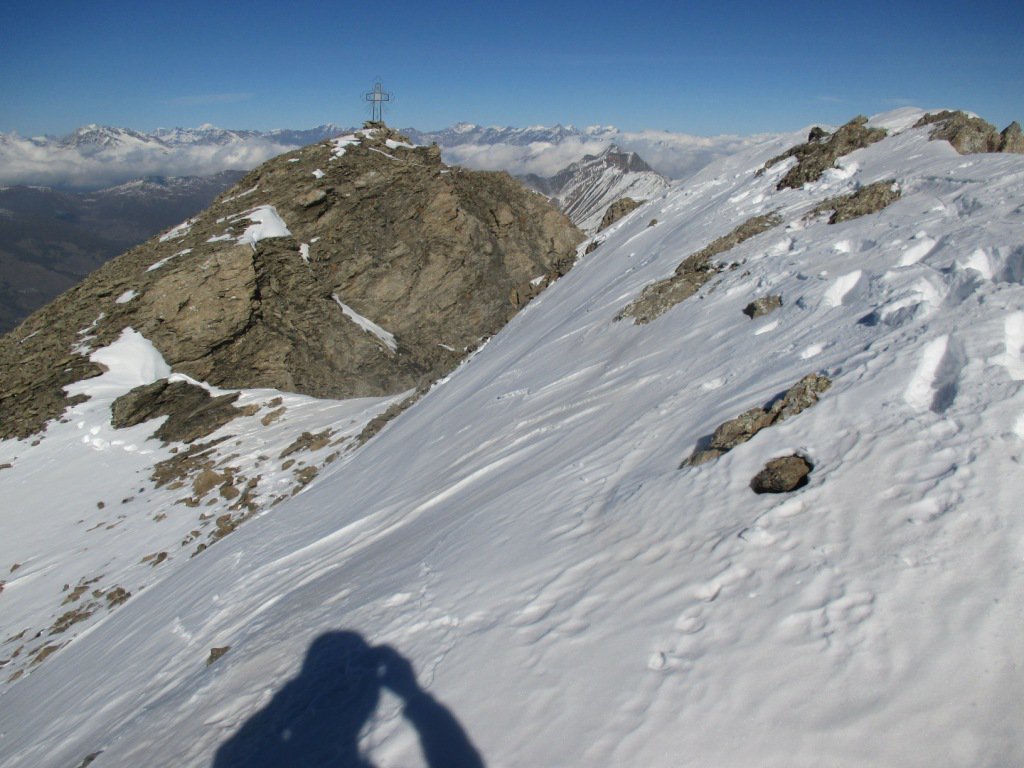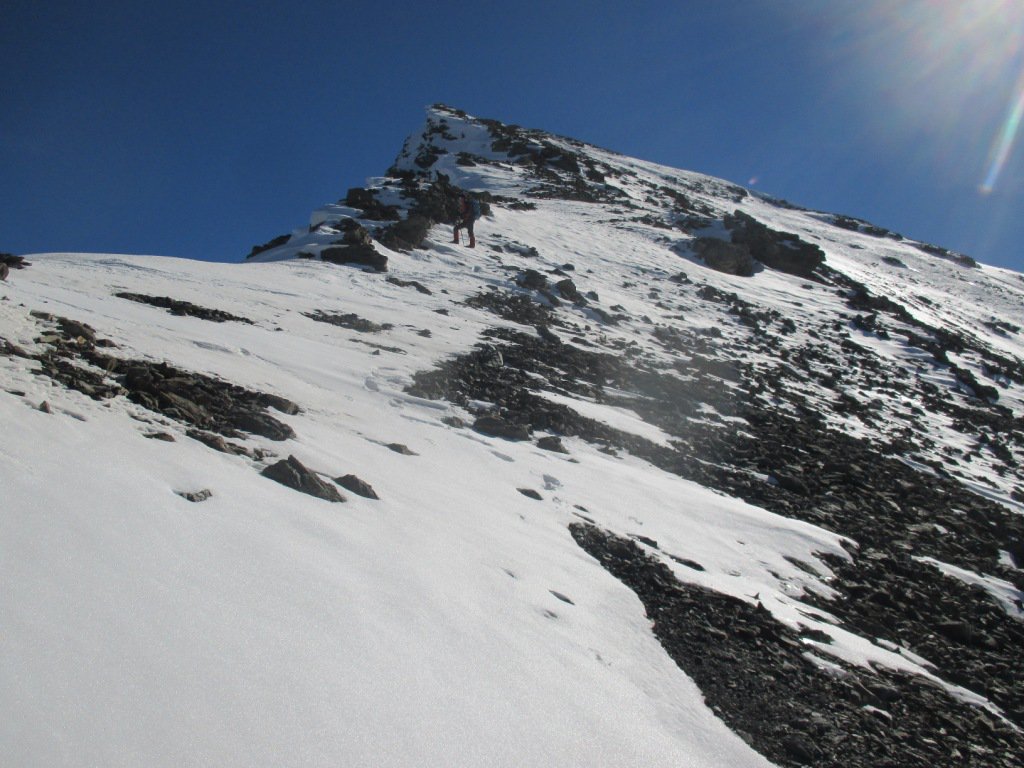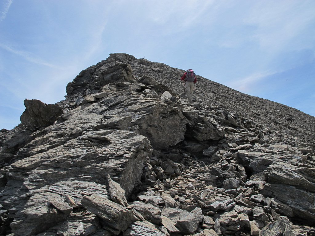 Giunti al colle, abbastanza verticale sul lato della Val Troncea, si sale per cresta ampia ed elementare, oppure per una traccia poco sotto il filo fino alla cima raggiungibile in 15-20 minuti.