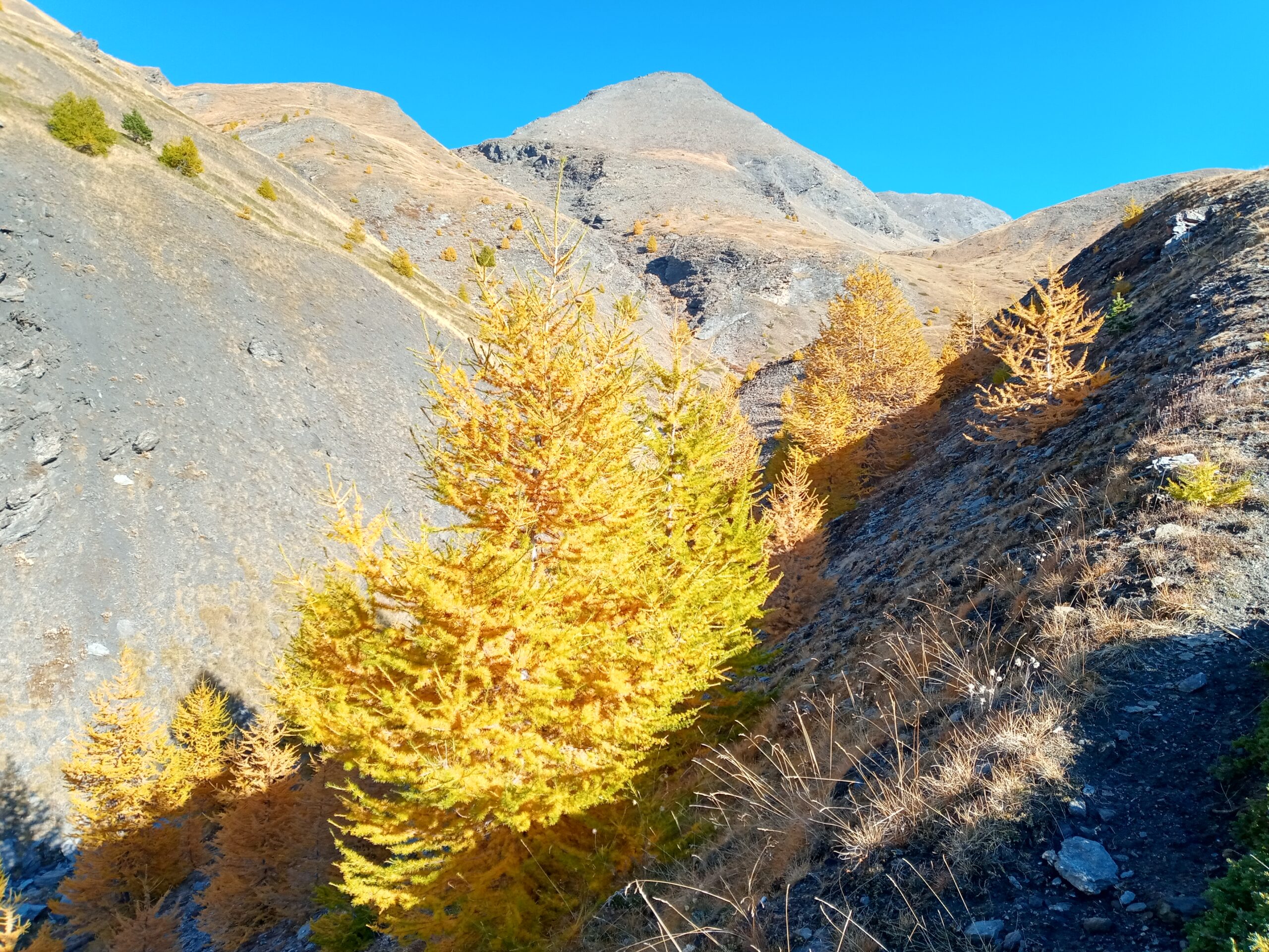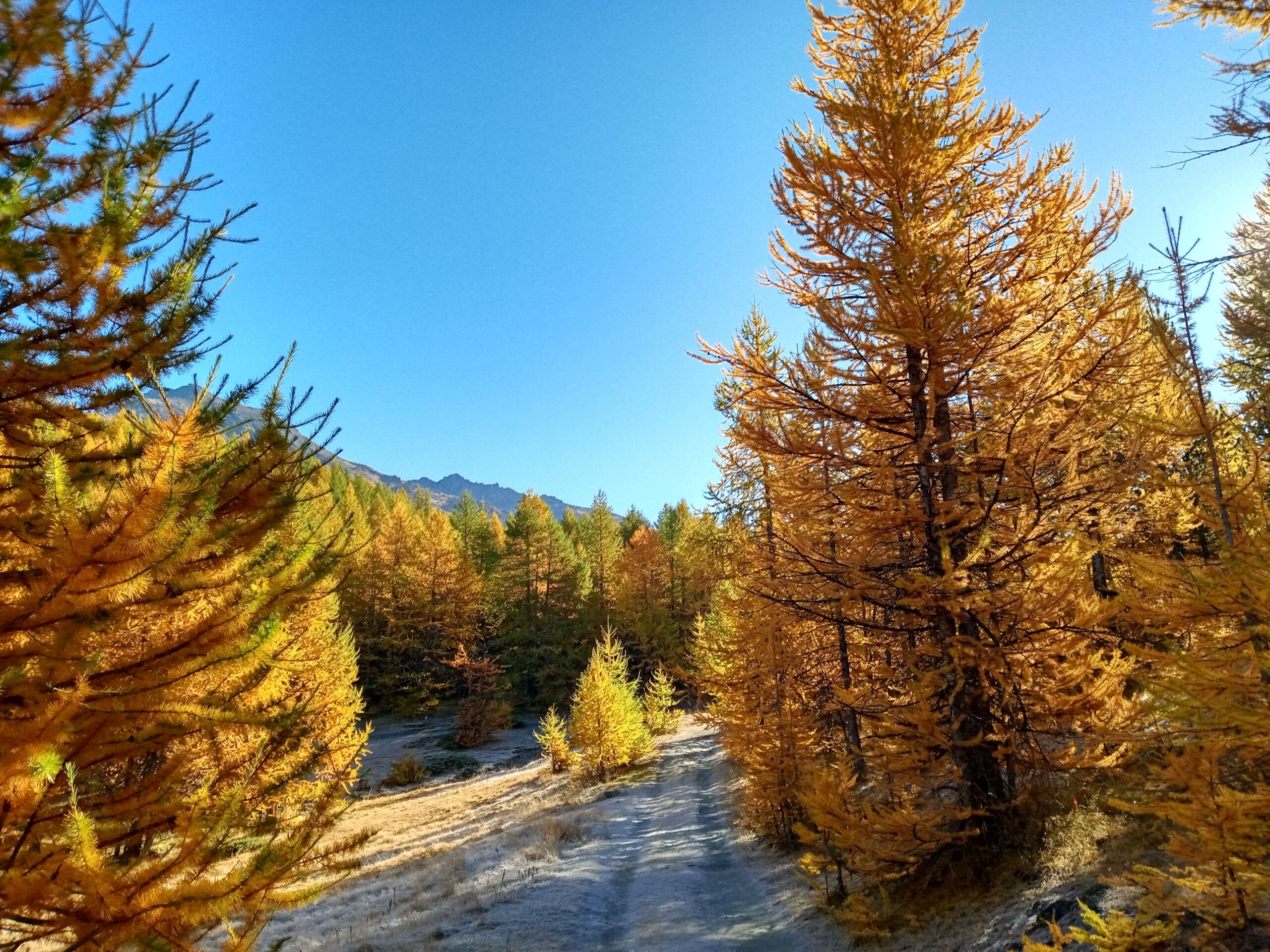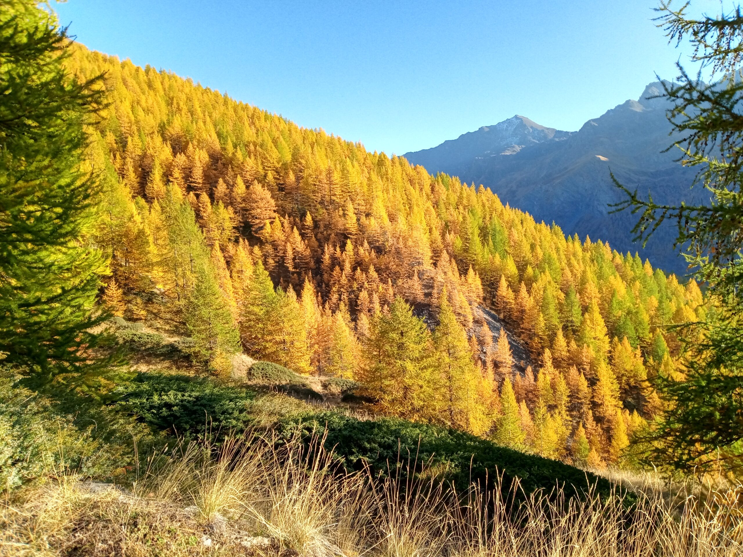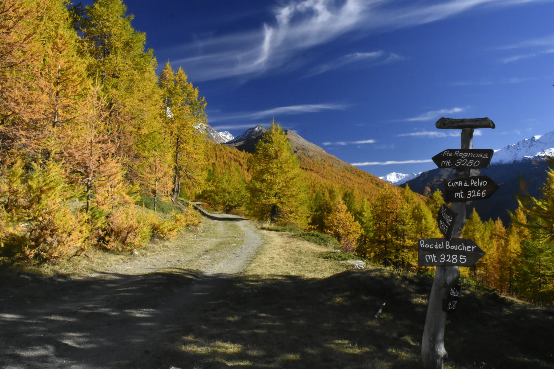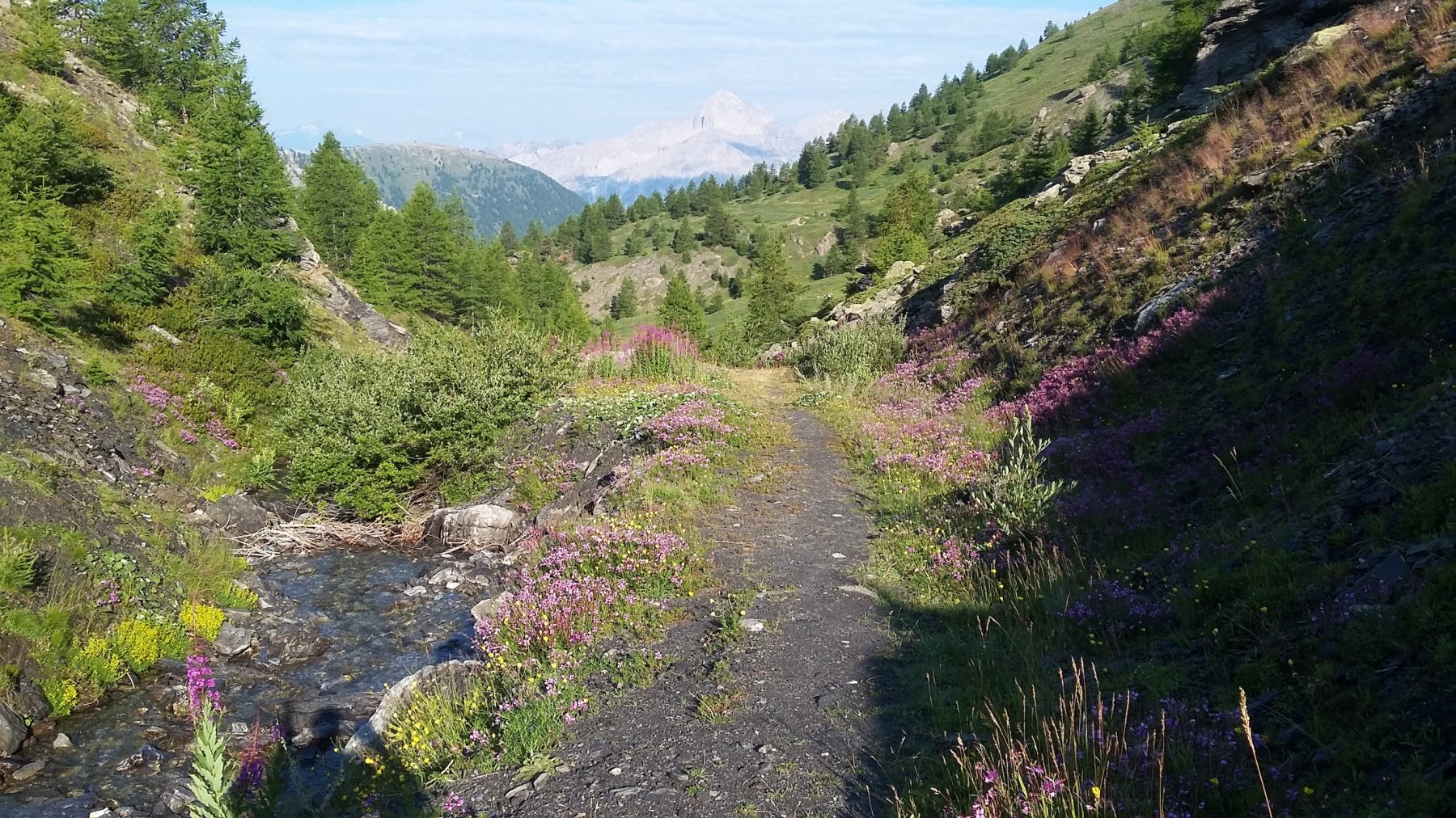 Ci sono due possibilità: o si segue la carrozzabile cha parte dalla sinistra della cappella oppure ci si dirige in direzione del Rio Colombiere e dopo averlo attraversato si incrocia una traccia che sale lungo la sinistra idrografica del torrente. Inizialmente il sentiero è evidente poi va a perdersi, probabilmente a causa dei dissesti delle recenti alluvioni. Conviene allontanarsi un po’ dal margine del ruscello per risalire i pendii nel bosco dove sono meno ripidi. Ci si deve ricordare di ricongiungersi al Rio in corrispondenza del finire degli alberi, cioè allo sbocco del Vallone Colombiere.