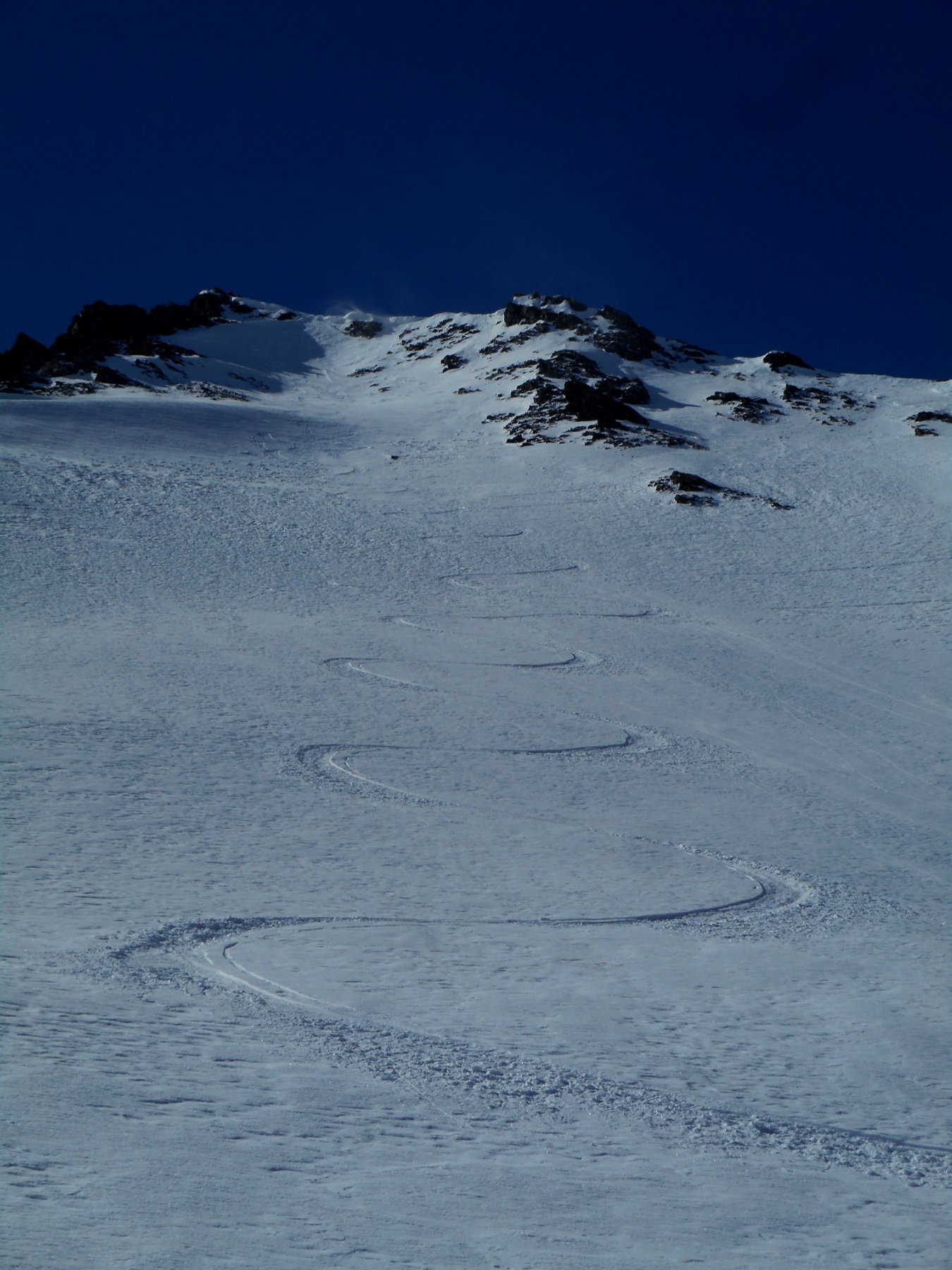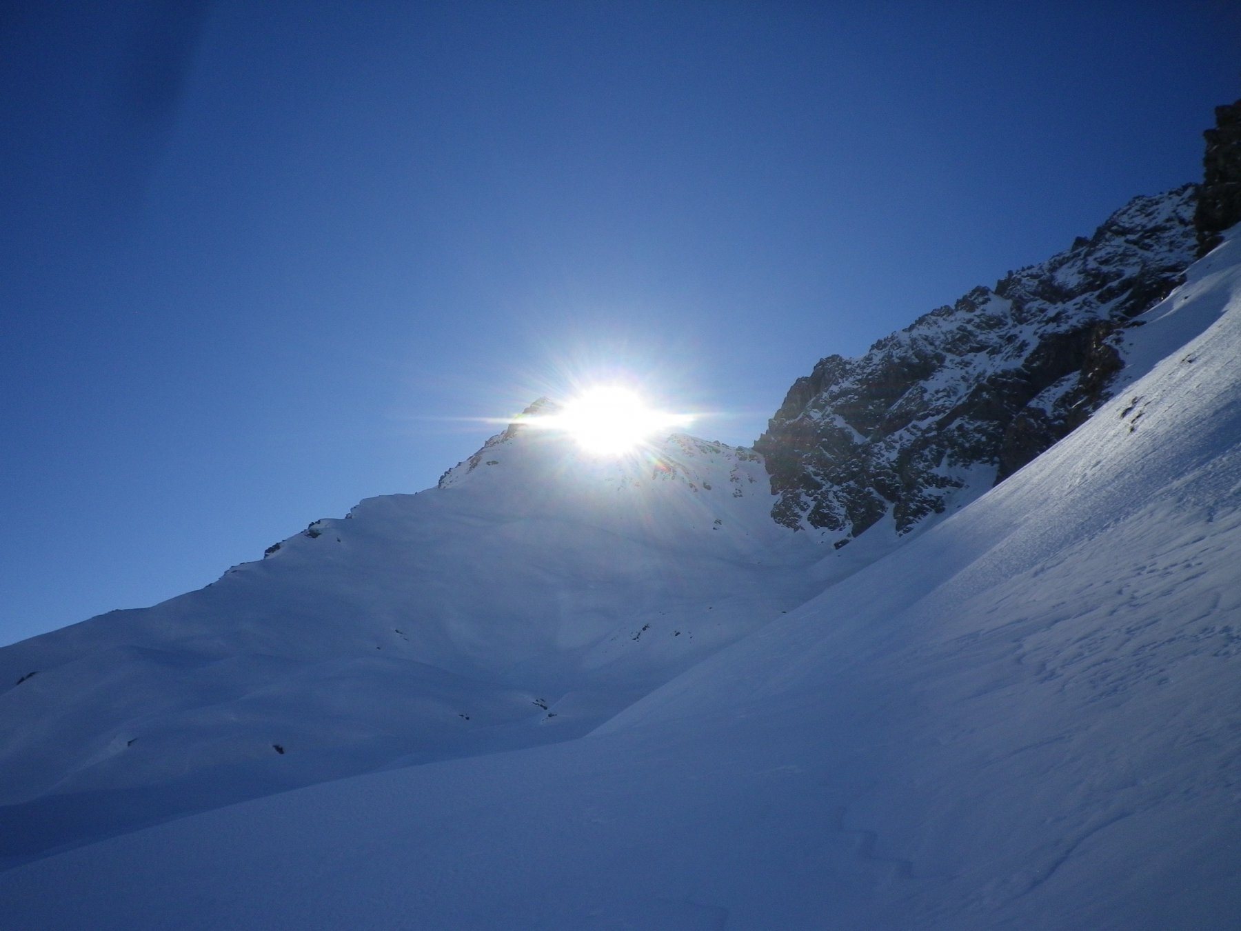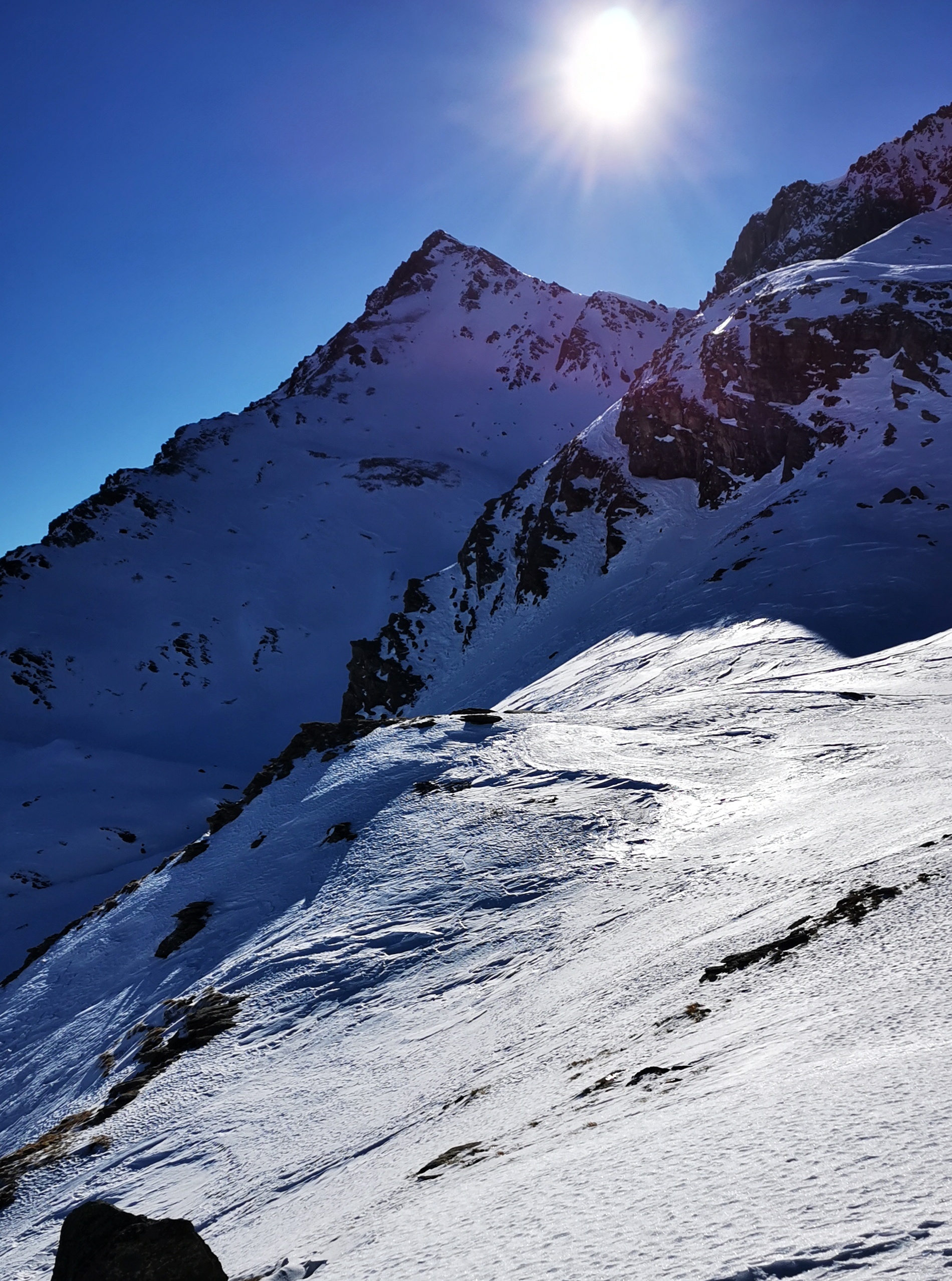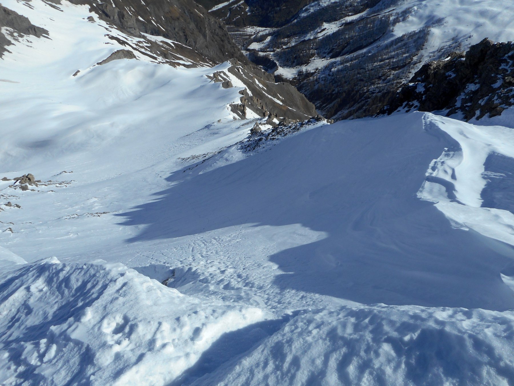 In discesa prestare attenzione ai primi metri che a causa della azione del vento possono diventare molto ripidi anche oltre i 45°.