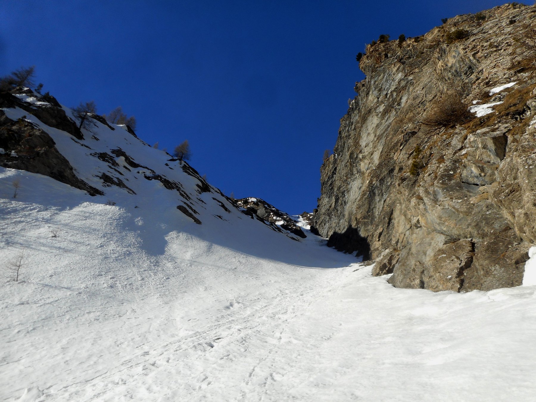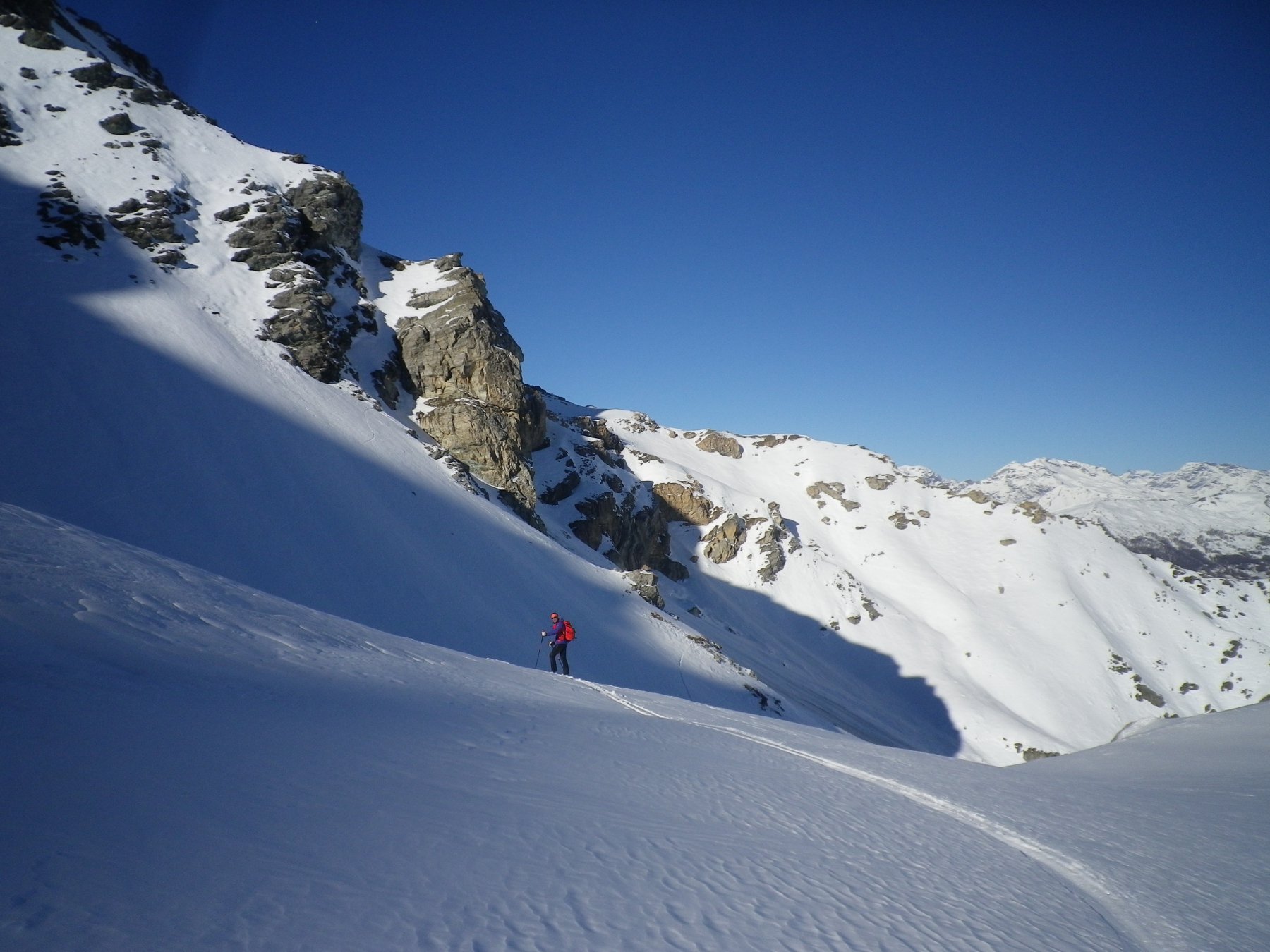 La discesa è inizialmente a 45° pieni per quasi 100 metri poi si porta sui 40° per altri 300 metri. Al termine di questi primi 400-500 metri non proseguire la discesa secondo la linea di massima pendenza poichè i bellissimi pendii che si originano dalla conca del monte Platasse terminano su salti di rocce e cascate, quindi verso la fine del vallone quando il pendio si livella risalire verso le rocce della Rognosa e ridiscendere verso la bergeria Lendiniere ripercorrendo il percorso fatto in salita.