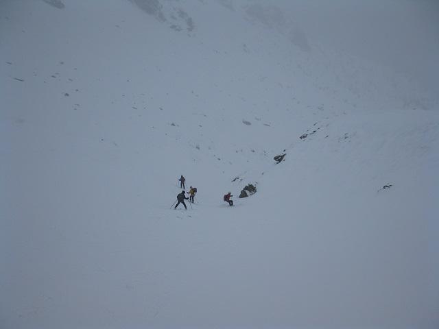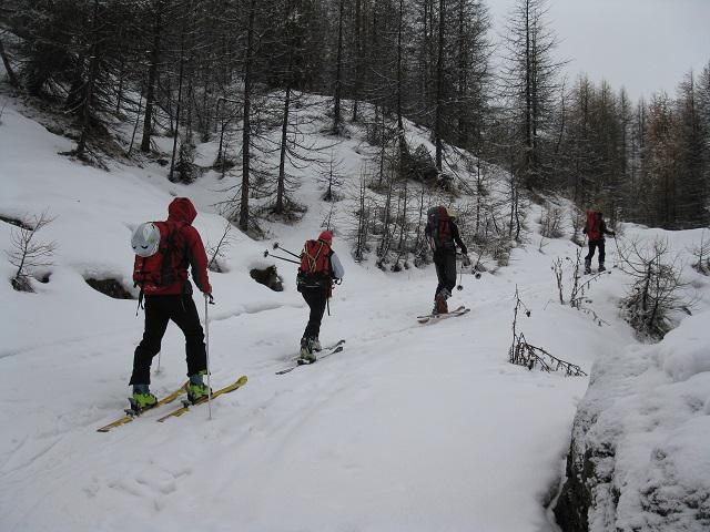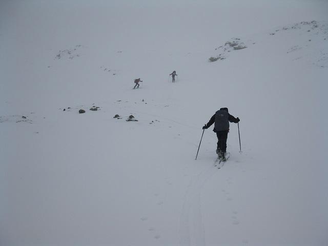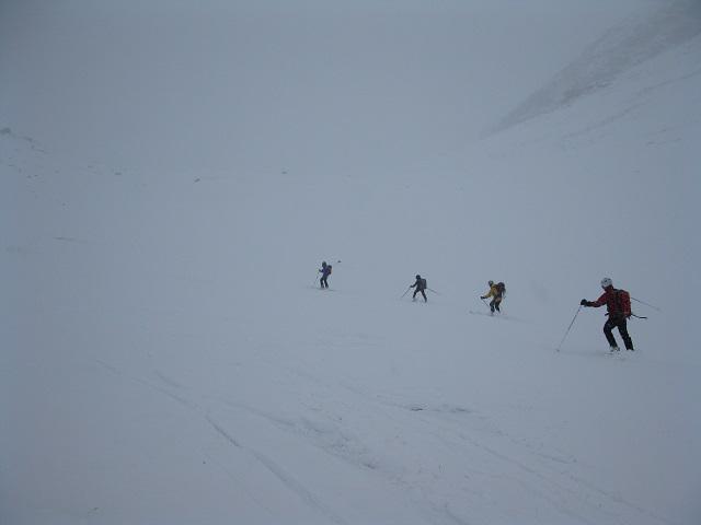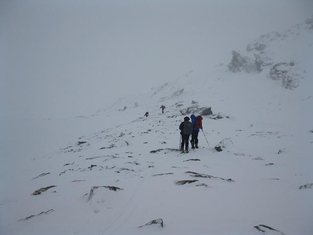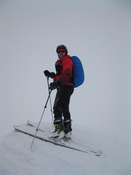 Saliti sotto una bella pioggerellina autunnale (si fa per dire) portando gli sci per circa 15 minuti prima di trovare un pò di neve, poi a singhiozzo tra neve, acqua e terra fino a trovare continuità dai 2200 metri in su. Parte alta sotto una bufera tremenda che ha ventato molto la neve, lasciandola comunque abbastanza sciabile.