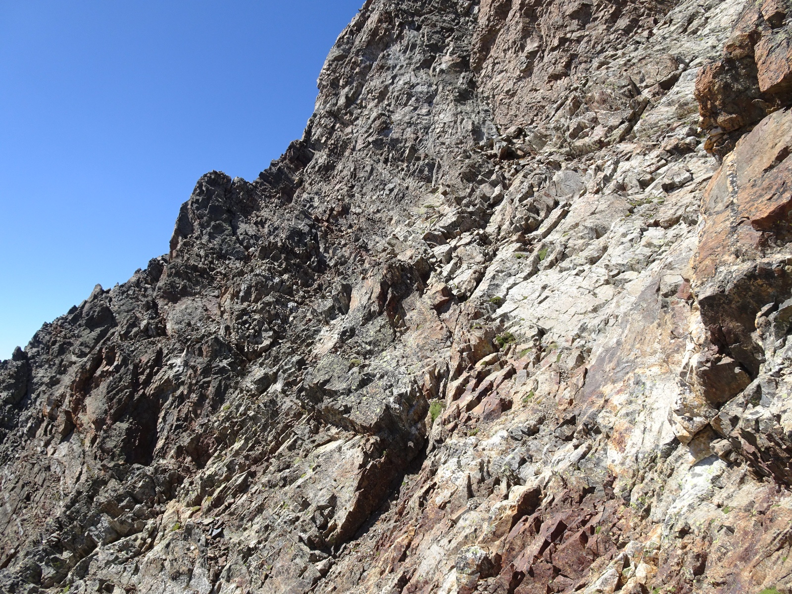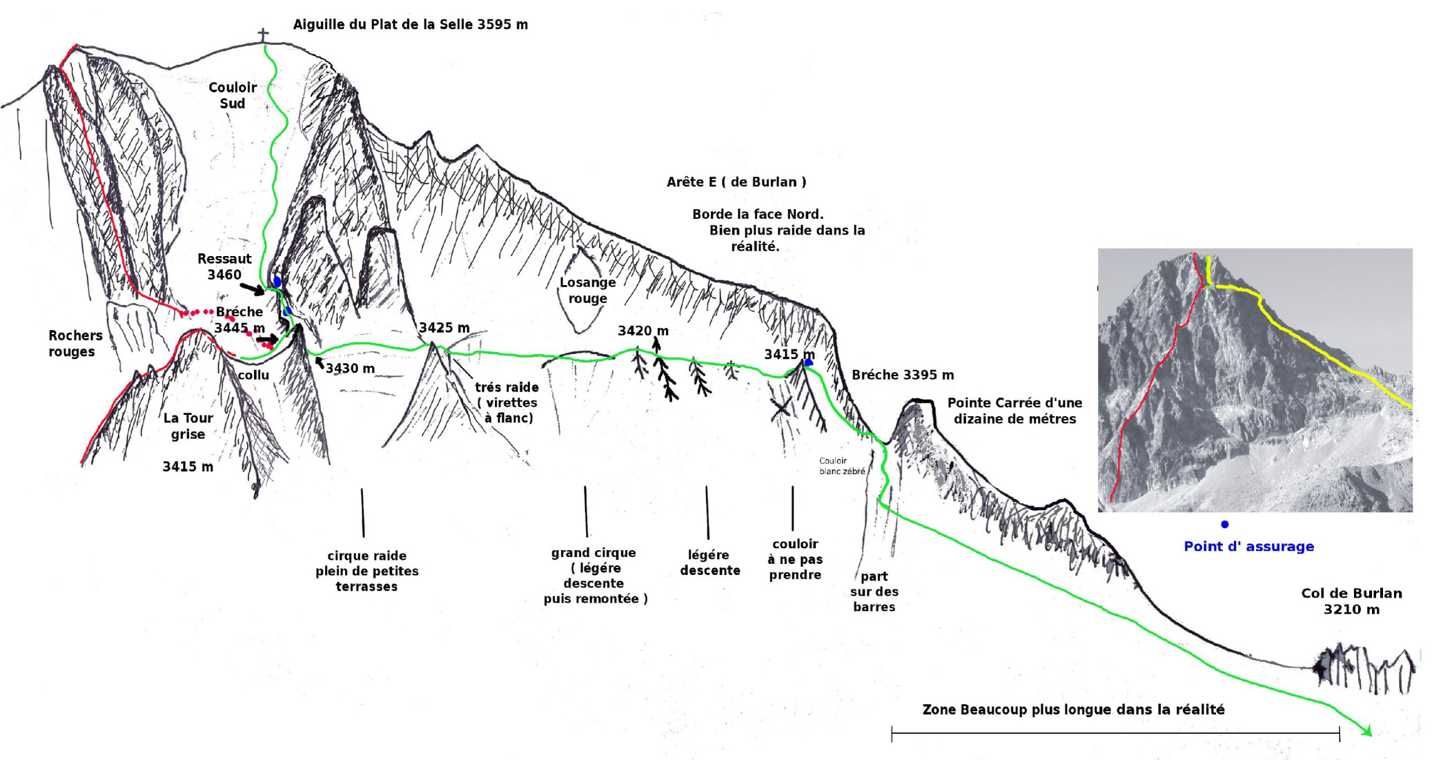2° giorno: dal rifugio prendere la traccia che taglia verso ovest (palo metallico su una crestina). Proseguire in piano fino all’evidente costone successivo, quindi seguire gli ometti che salgono verso nord in direzione dell’Aiguille occidentale de Soreiller, poi piegano verso sx e puntano al Col de Burlan. Salire al colle per ripidi sfasciumi e detriti (2h). Dal colle seguire inizialmente la cresta est (ometti), quindi tagliare verso sx sotto il filo per cenge e rampe (ometti). Si giunge alla base di un canale roccioso che si risale fino ad una forcella a monte di un dentino della cresta. Si sale la paretina sulla sx (30m, II/II+) e si esce su una spalla (sosta per un’eventuale calata al ritorno). Si scende ora qualche metro sul lato opposto quindi si inizia una lunga traversata del versante SE con scavalcamento di numerose crestine (tutto segnato con ometti). Si giunge così sul bordo di un grande canalone (ancora non visibile), si rimonta una 50ina di metri prima in un vago canale, quindi su uno sperone a sx (cordone, 2 fix, II passo di III). Con un breve ma esposto traverso si taglia verso sx (cordino) e si raggiunge il fondo del canalone sopra citato che si risale (sfasciumi alternati a salti di roccia, II) per circa 150 m fino a raggiungere le cresta a breve distanza dalla cima (2h dal colle).