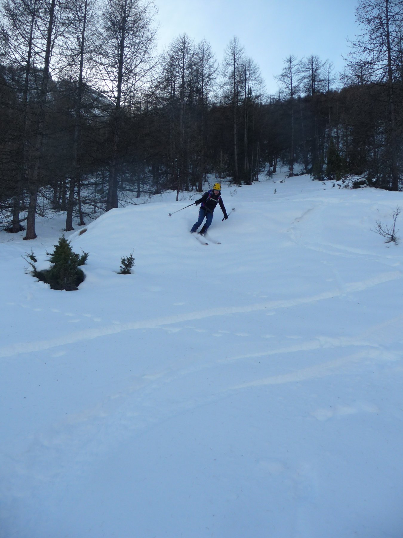 Saliti dal Vallon de Rofre su buona traccia a tratti gelata nella prima parte del bosco. Poi fatto traccia più diretta fino in vetta. Discesa per il vallone di salita su placconi da vento la parte alta, croste abbastanza fastidiose il pianello prima del bosco e farinelle vecchie nel bosco. Scesi per il pendio canale diretto con solo vecchie tracce su bella neve farinosa ma ovviamente qualcosa si tocca. Arrivati in fondo ripello nel Vallon des Vaches fino al limite del bosco e discesa anche qui su vecchie farinelle divertenti.