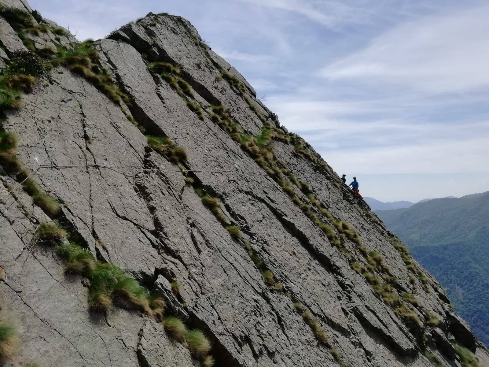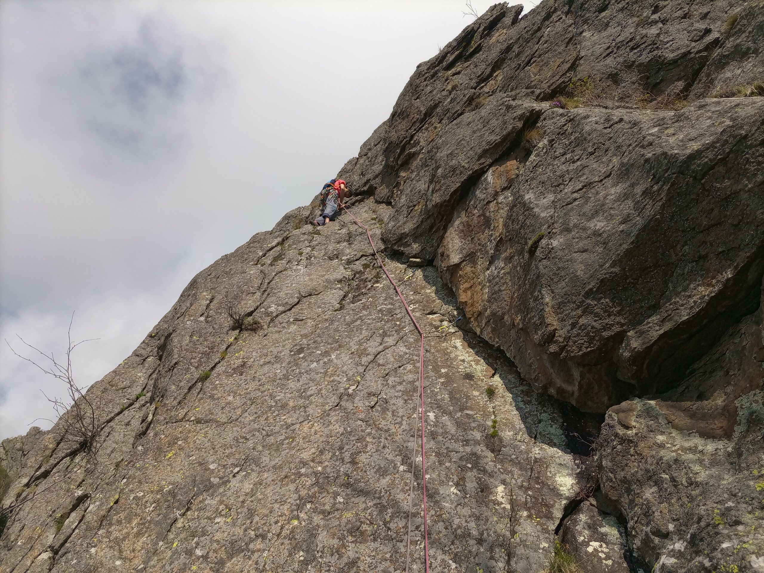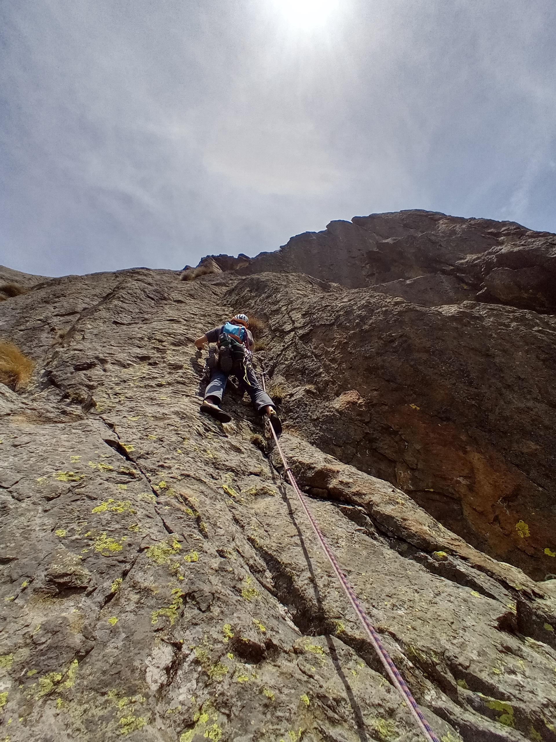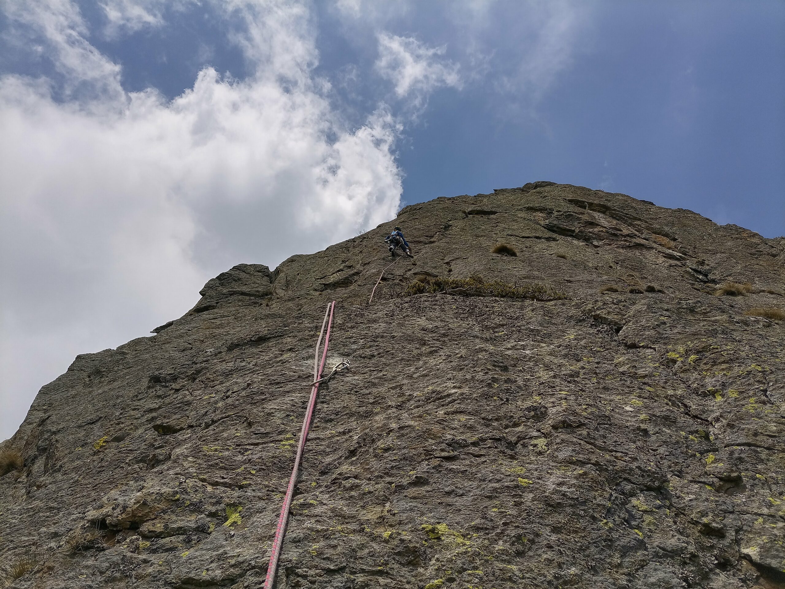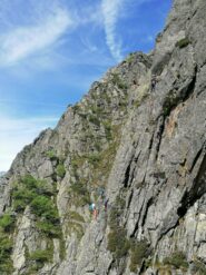 L5 – salire il verticale diedrino su roccia lavorata a tacche e poi traversare a sinistra in placca fino a una lama che permette di uscire su un comodo terrazzo erboso. In tutto 6 spit-fix più la sosta con 2 spit-fix da collegare. Tiro di 25m. Grado 6a.