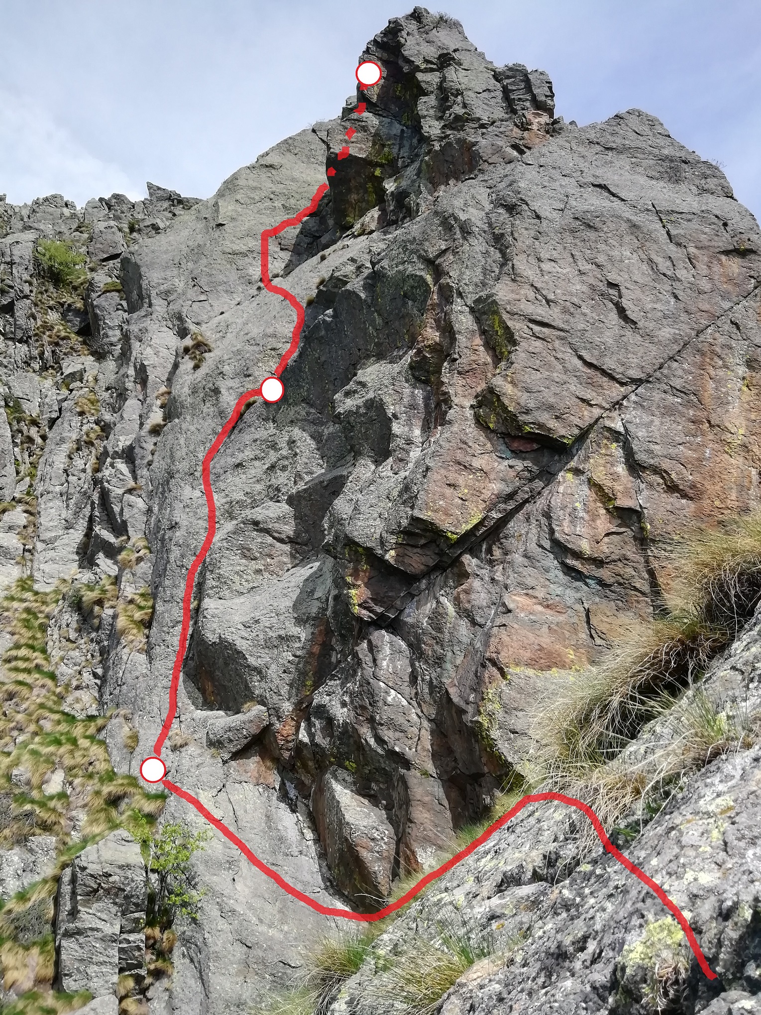 L1 – attaccare nel punto più basso del crestone di sinistra, in corrispondenza di una evidente fessura (non visibile dall’attacco della via Boccalatte). Scritta alla base e spit-fix visibile in alto. Salire la fessura con andamento destra-sinistra (friend di varie misure necessari) fino ad uscirne arrivando allo spit-fix. Salire quindi il pilastrino fino al suo termine, in corrispondenza di un intaglio. Proseguire sul successivo compatto muro (2 spit-fix) fino al terrazzino dove si trova la sosta (2 spit-fix da collegare). Tiro sui 50m. Grado 5b