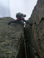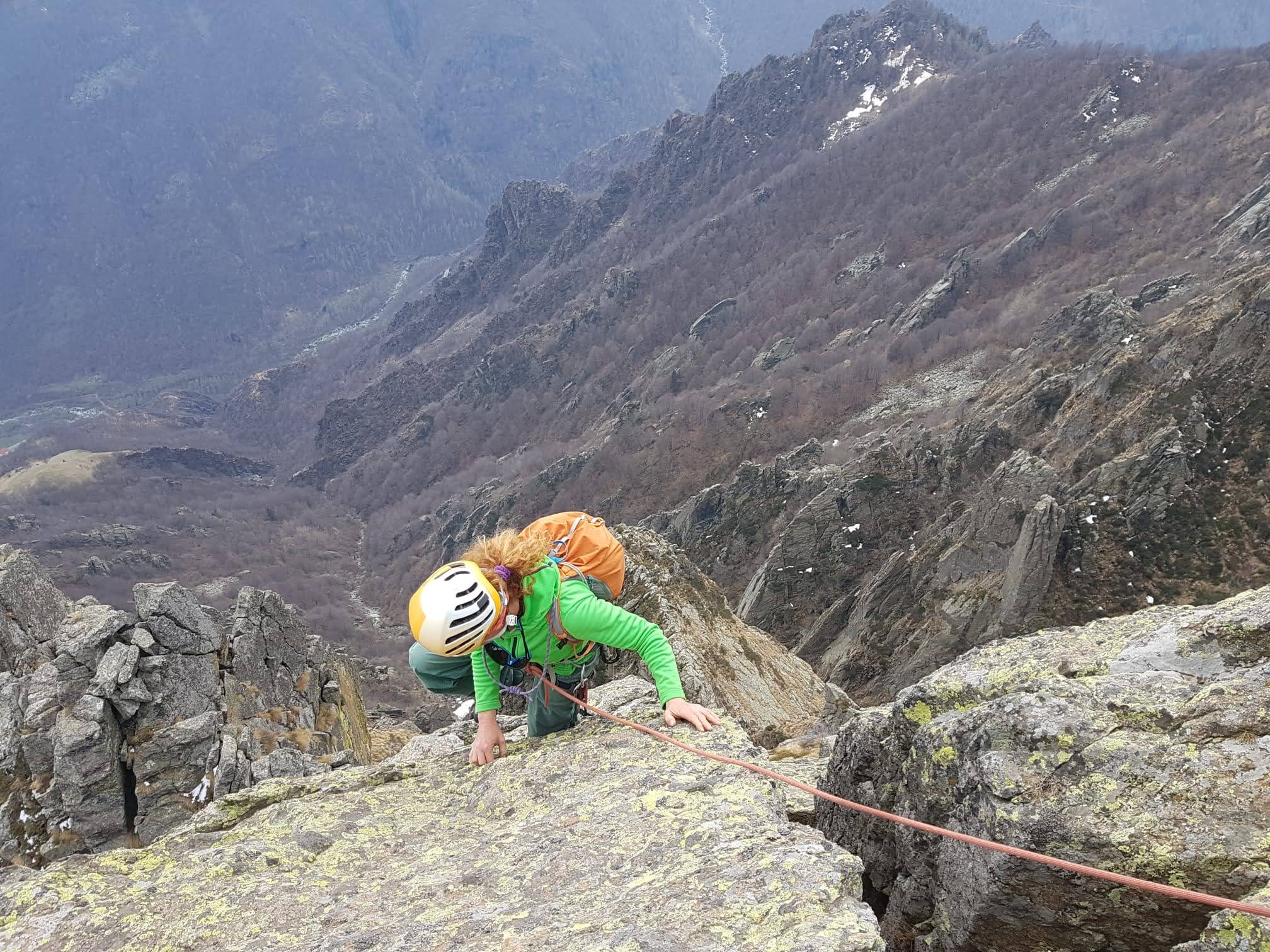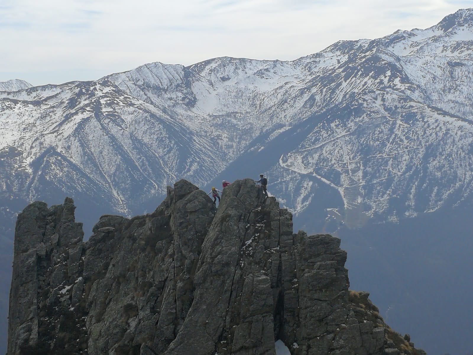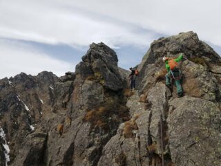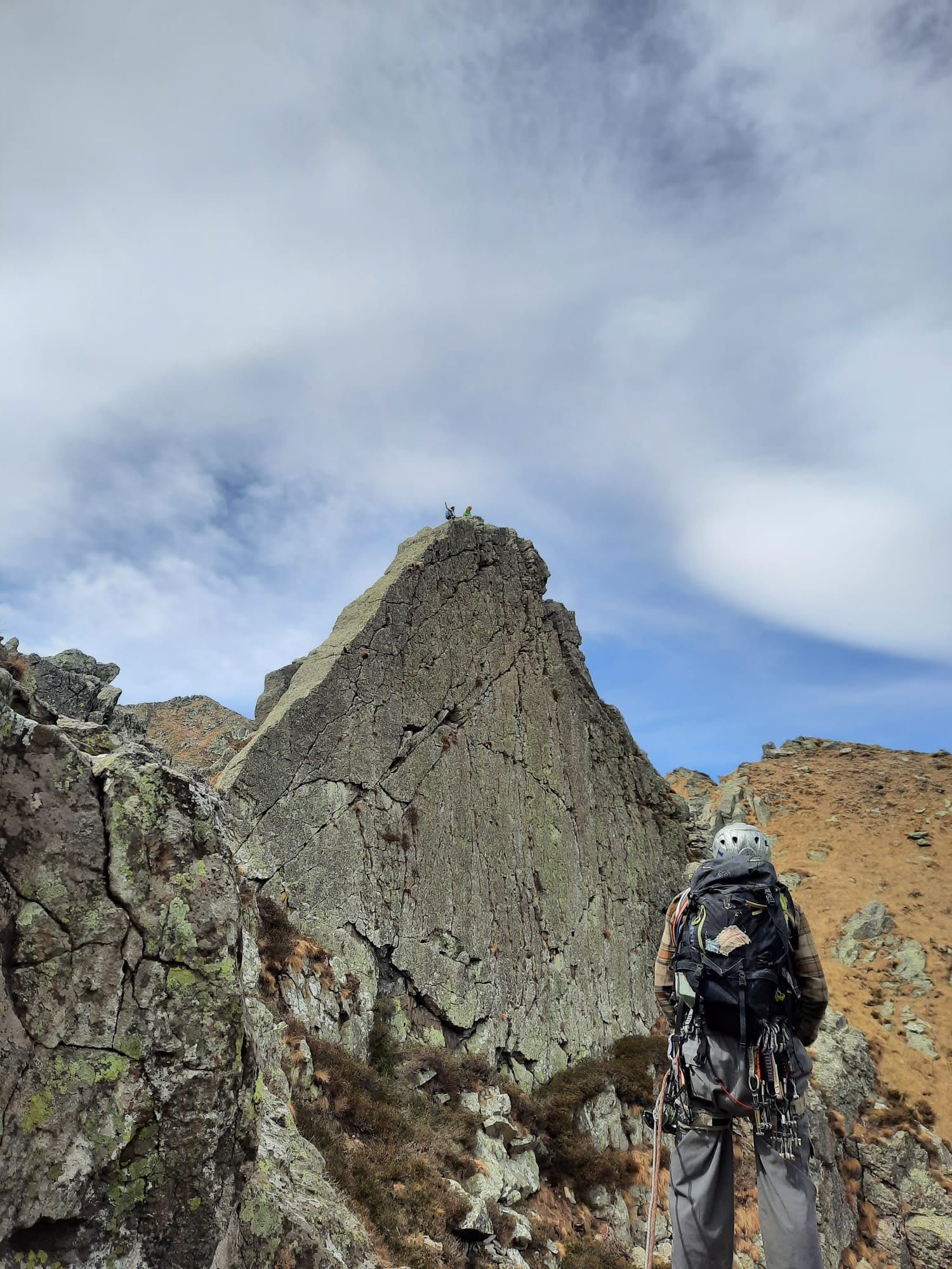 - Lo si supera per il camino appena a sinistra del filo di cresta formato da una ripida placca. Tiro di IV grado.