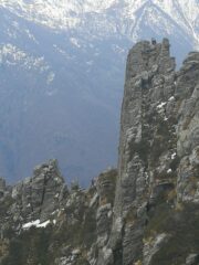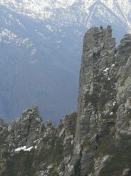 - Dall’intaglio si risalgono facilmente le rocce frammiste ad erba (II-III) fino alla base di un salto più ripido. 1 chiodo di sosta. Si è ora alla base di uno dei tiri più difficili della via. Si sale dritti fino a 1 chiodo e 1 nut incastrato e si prosegue con arrampicata delicata spostandosi verso sinistra alla base di una lama con vecchio cuneo in legno. La si supera (attenzione ad alcune lame mobili) fino a un buon punto di sosta. Tiro di V grado.