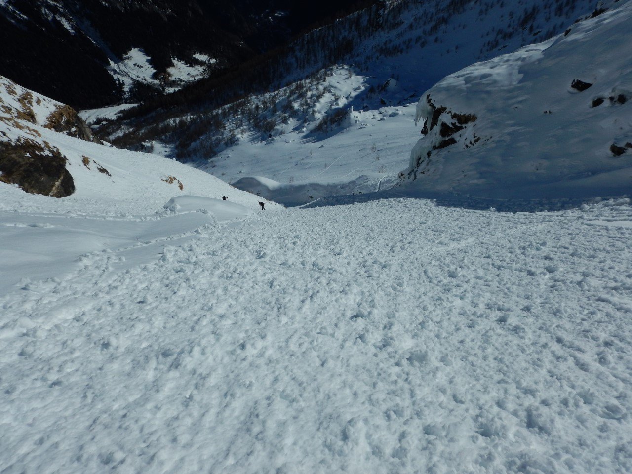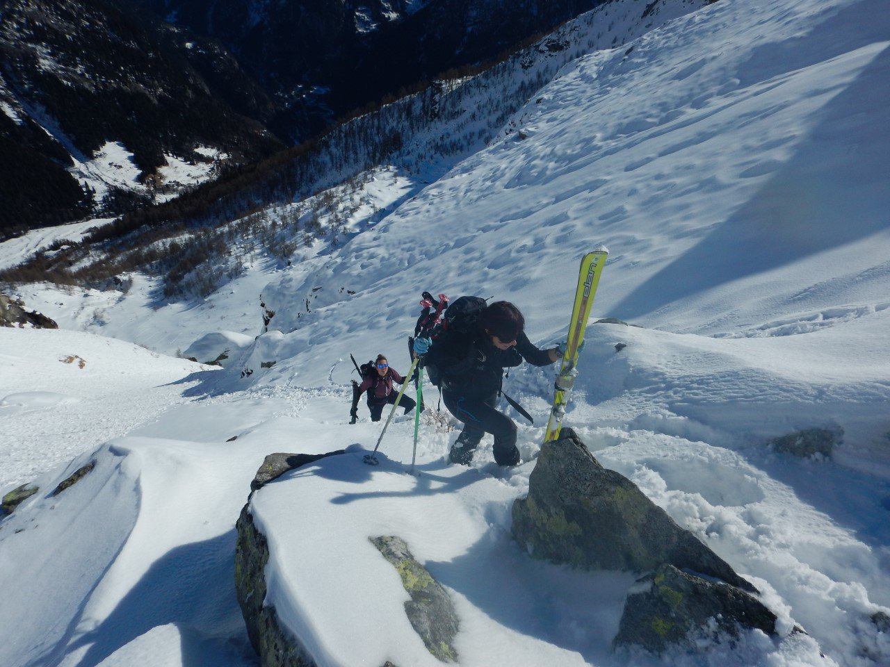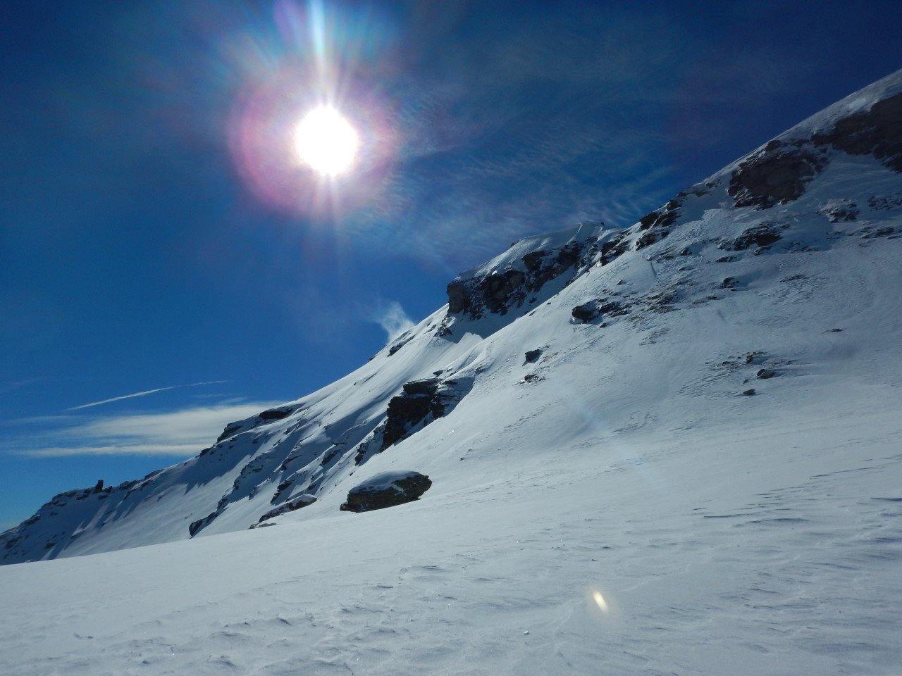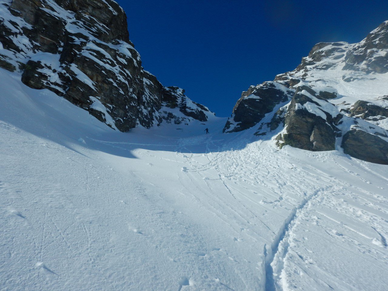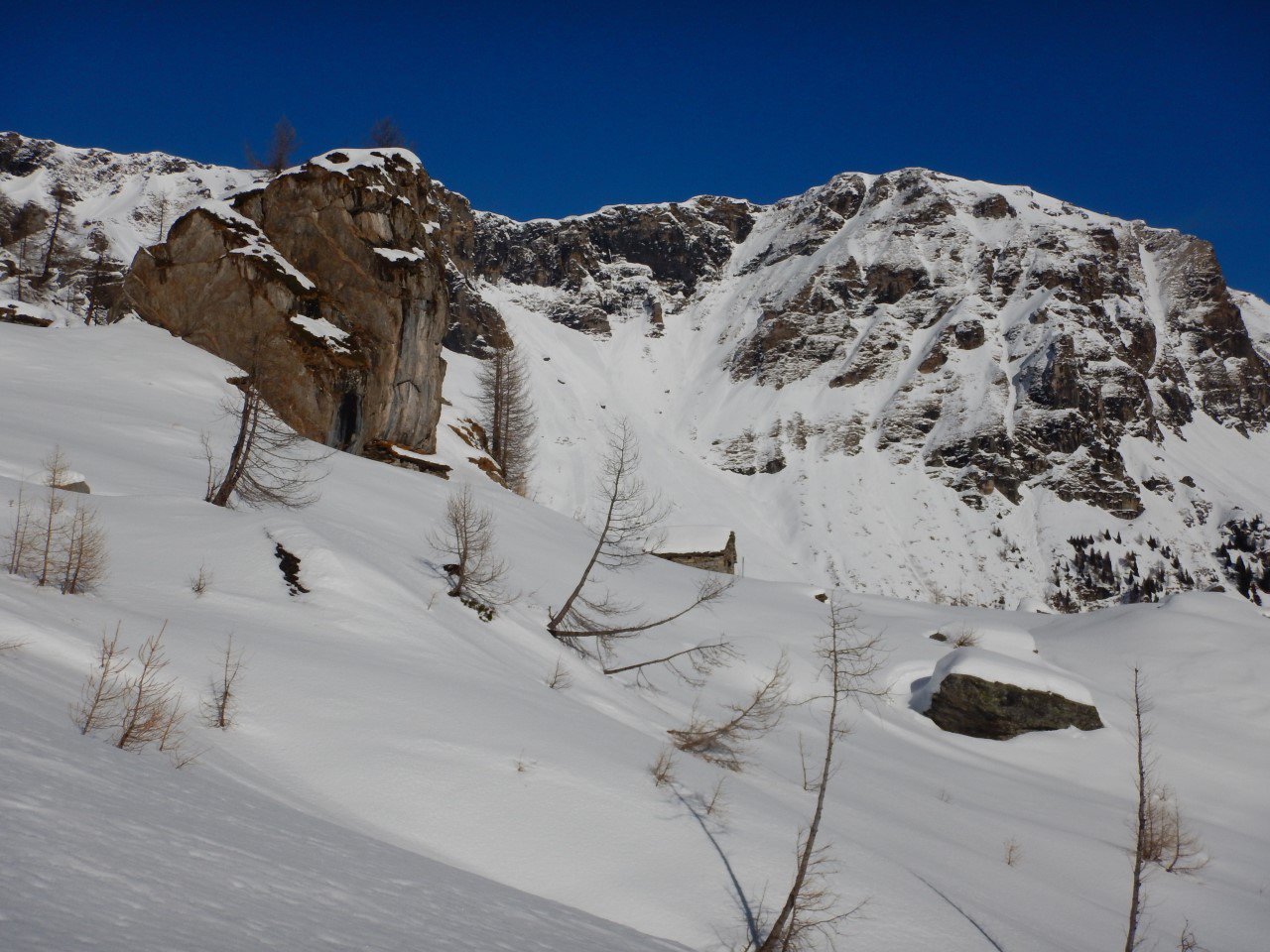 Con un traverso a mezza costa raggiungere un secondo canale (100 mt 35°) che collega al Passo di Pojala (mt 2650) prima del quale si traversa sotto cresta una serie di risalti portandosi all’attacco del breve parete NE del Pojala (50mt 40°) facendo attenzione a possibili accumuli di neve.