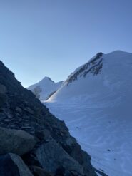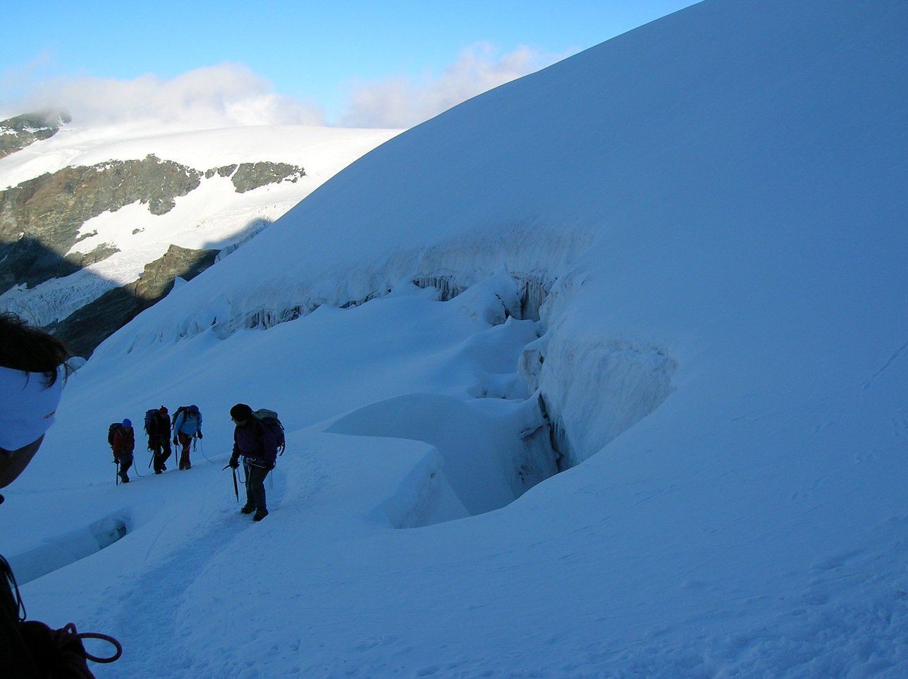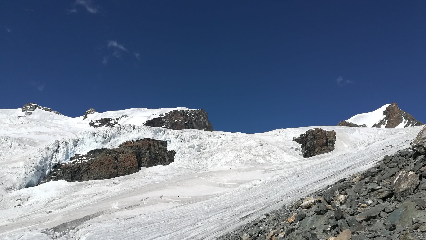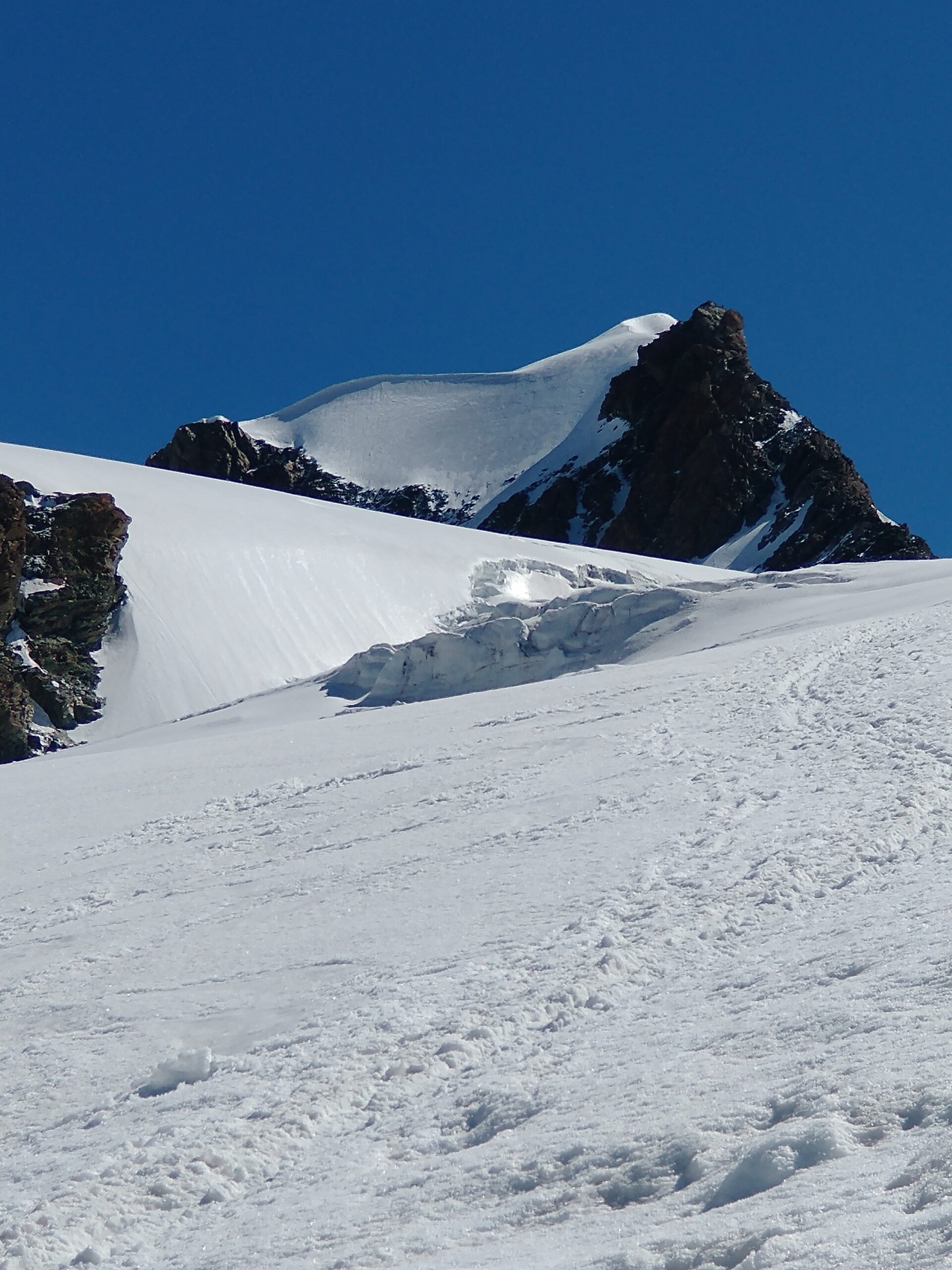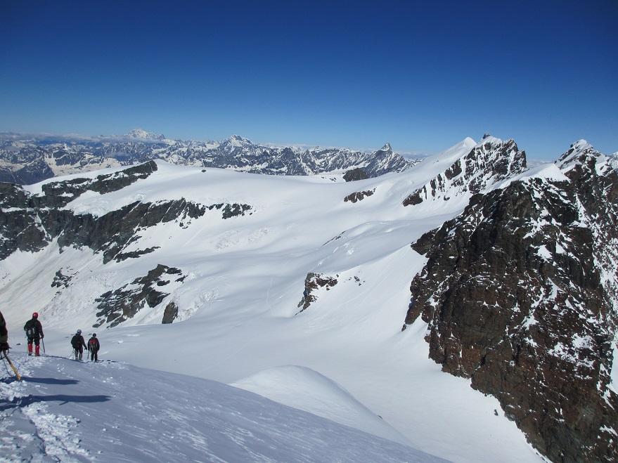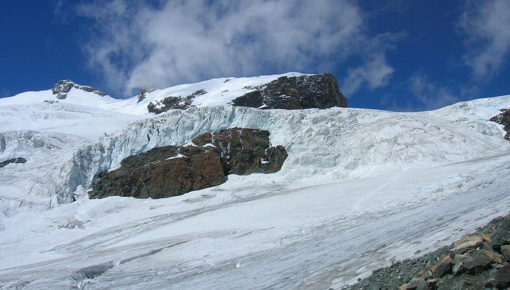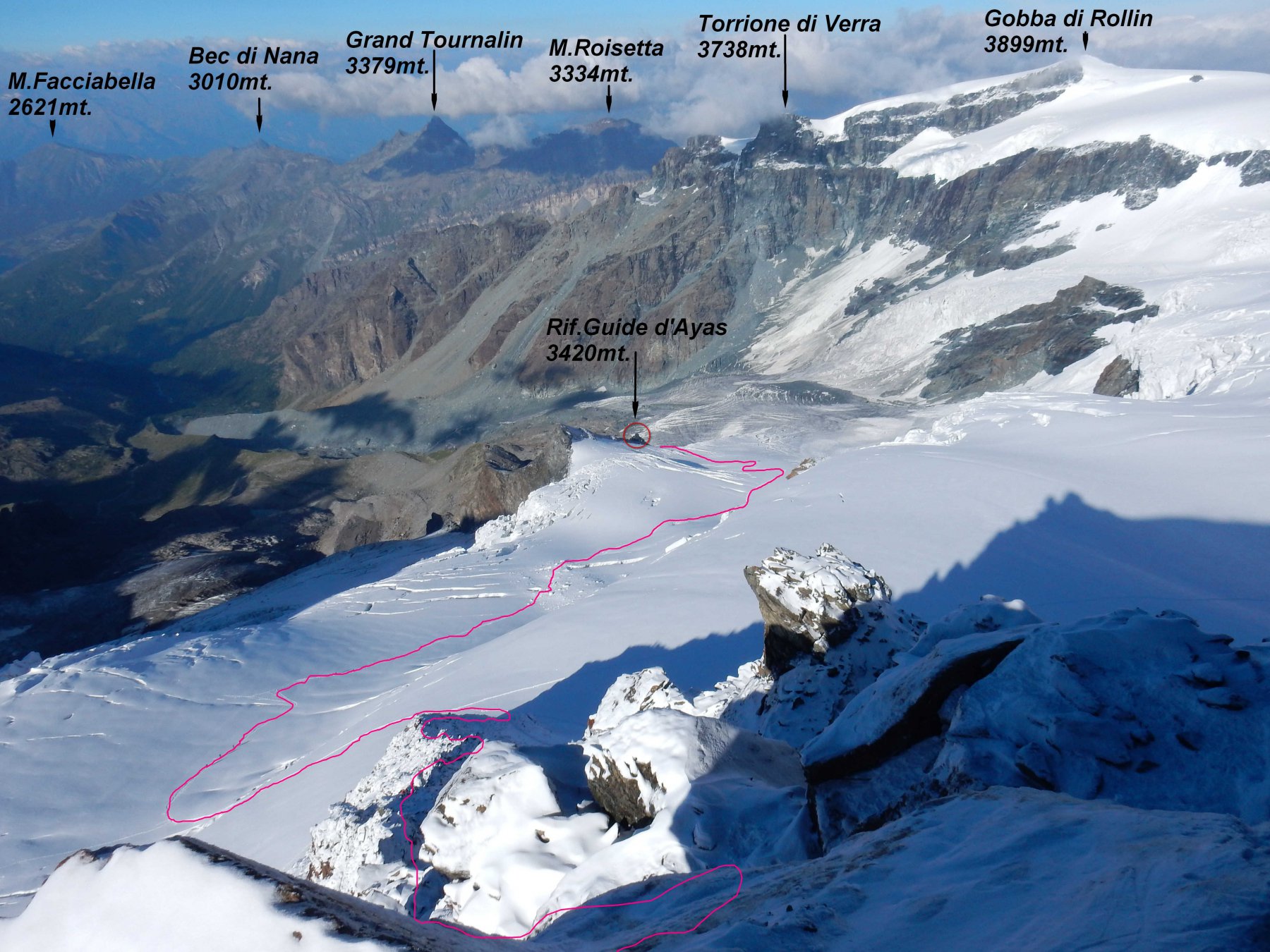 Dal rifugio Guide della Val d’Ayas si raggiunge il lungo avvallamento formato dal ghiacciaio delimitato a sinistra dalla seraccata della parte superiore del ghiacciaio di Verra.