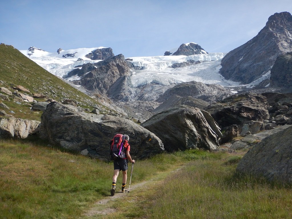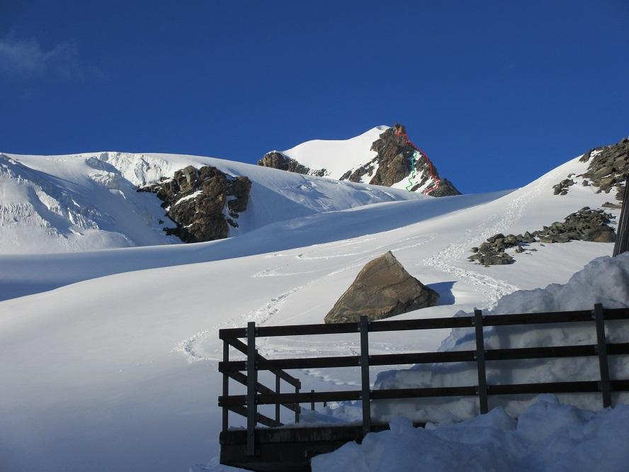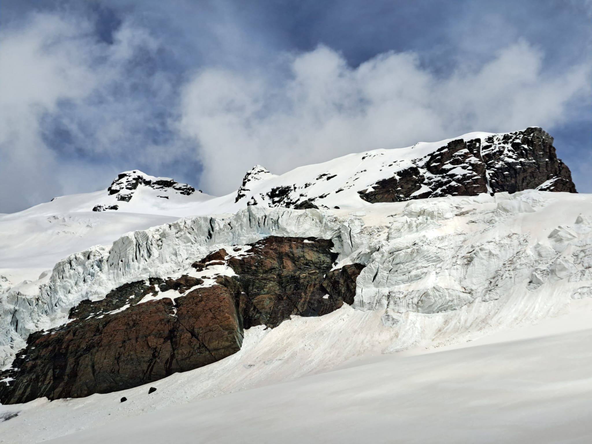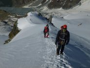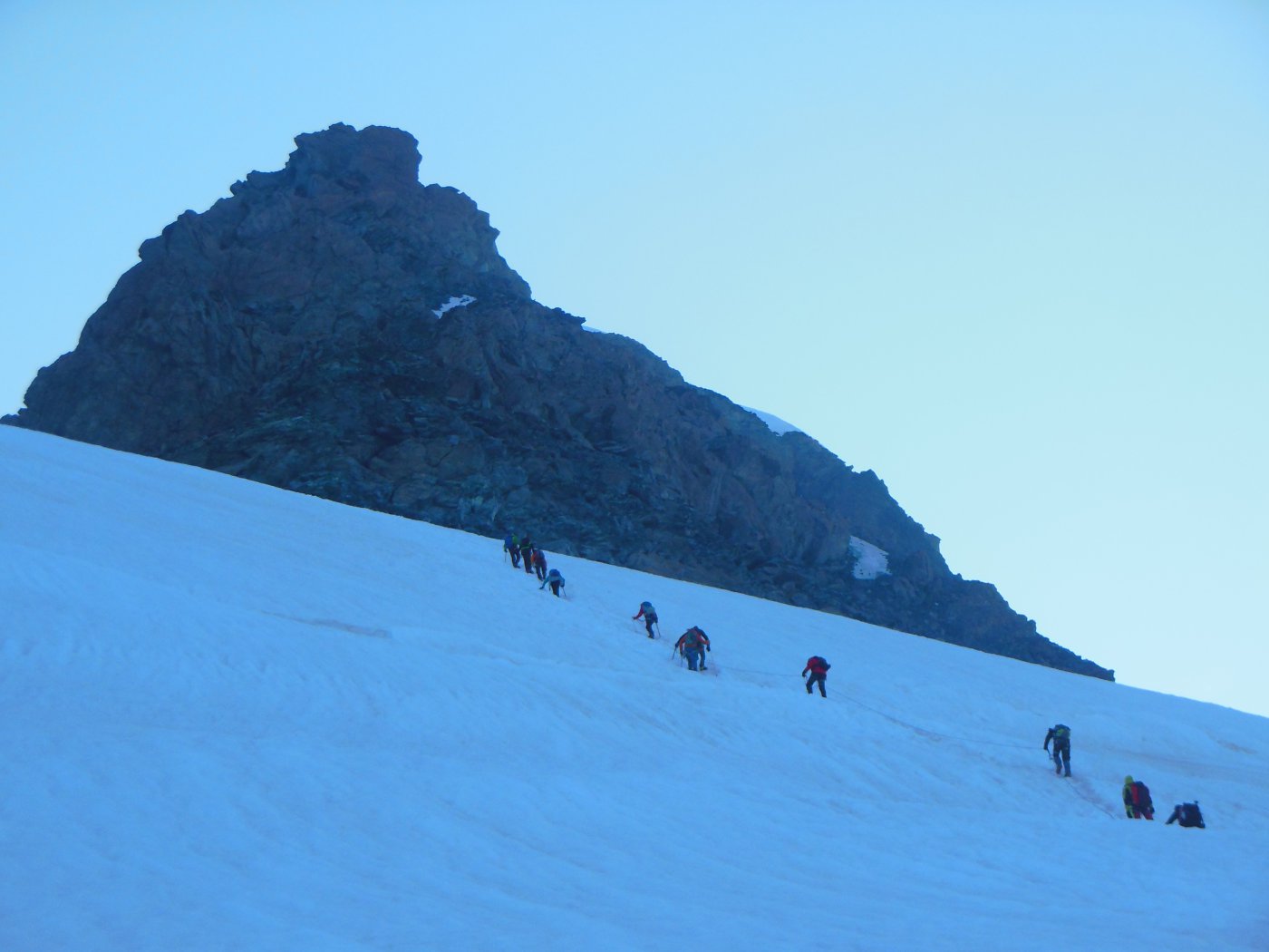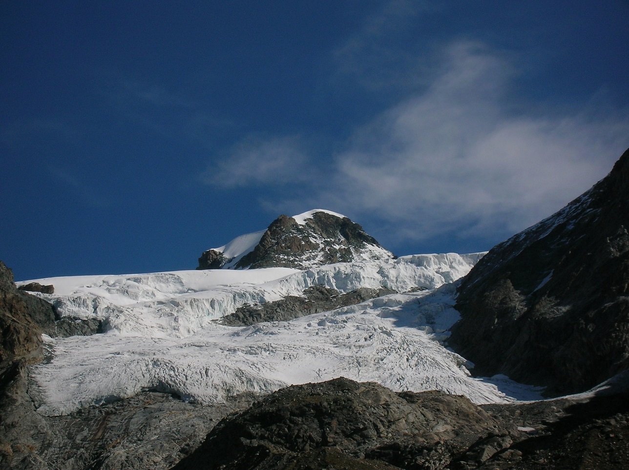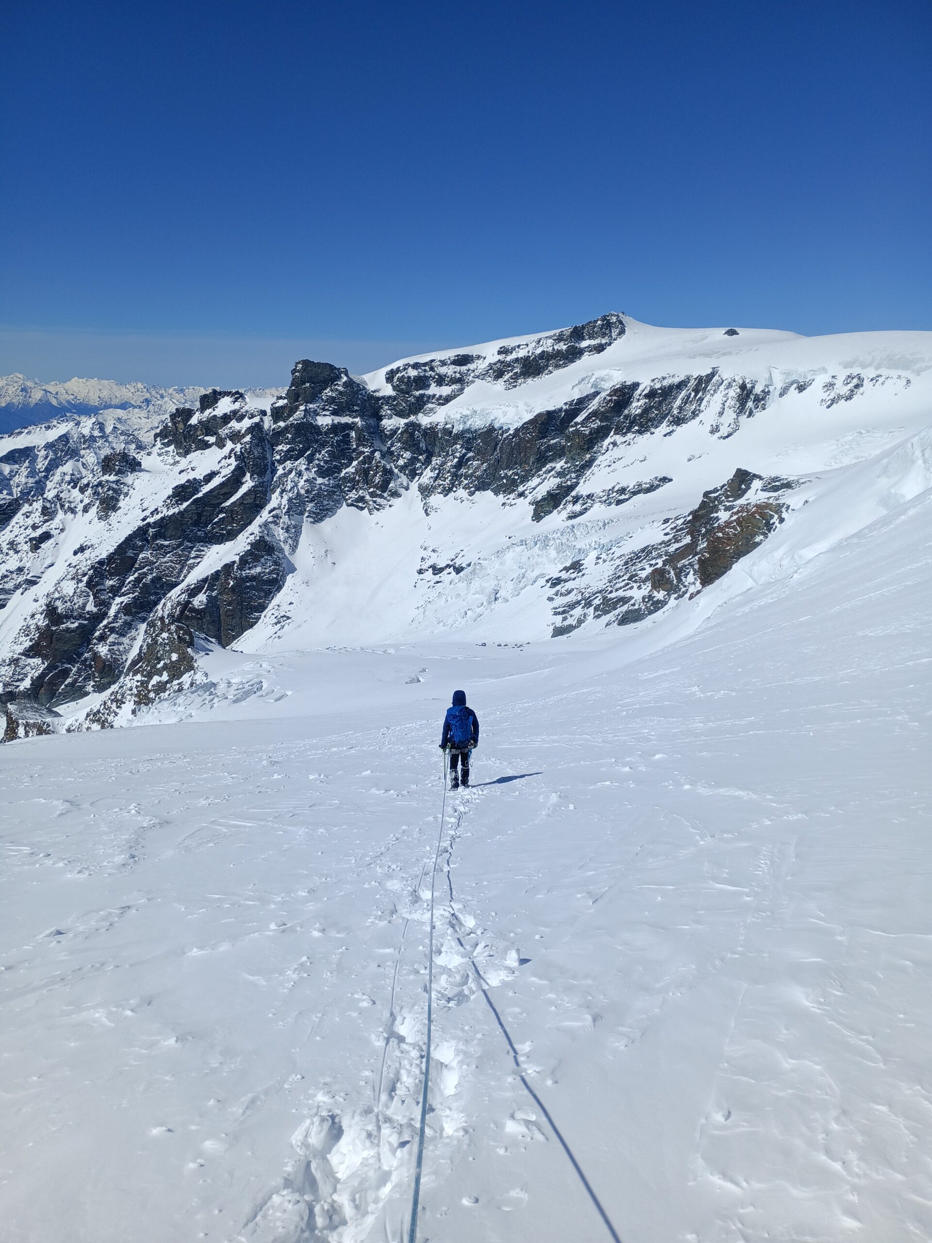 Dal rifugio Guide della Val d’Ayas si raggiunge il lungo avvallamento formato dal ghiacciaio delimitato a sinistra dalla seraccata della parte superiore del ghiacciaio di Verra.