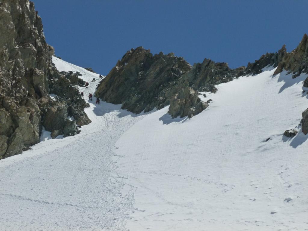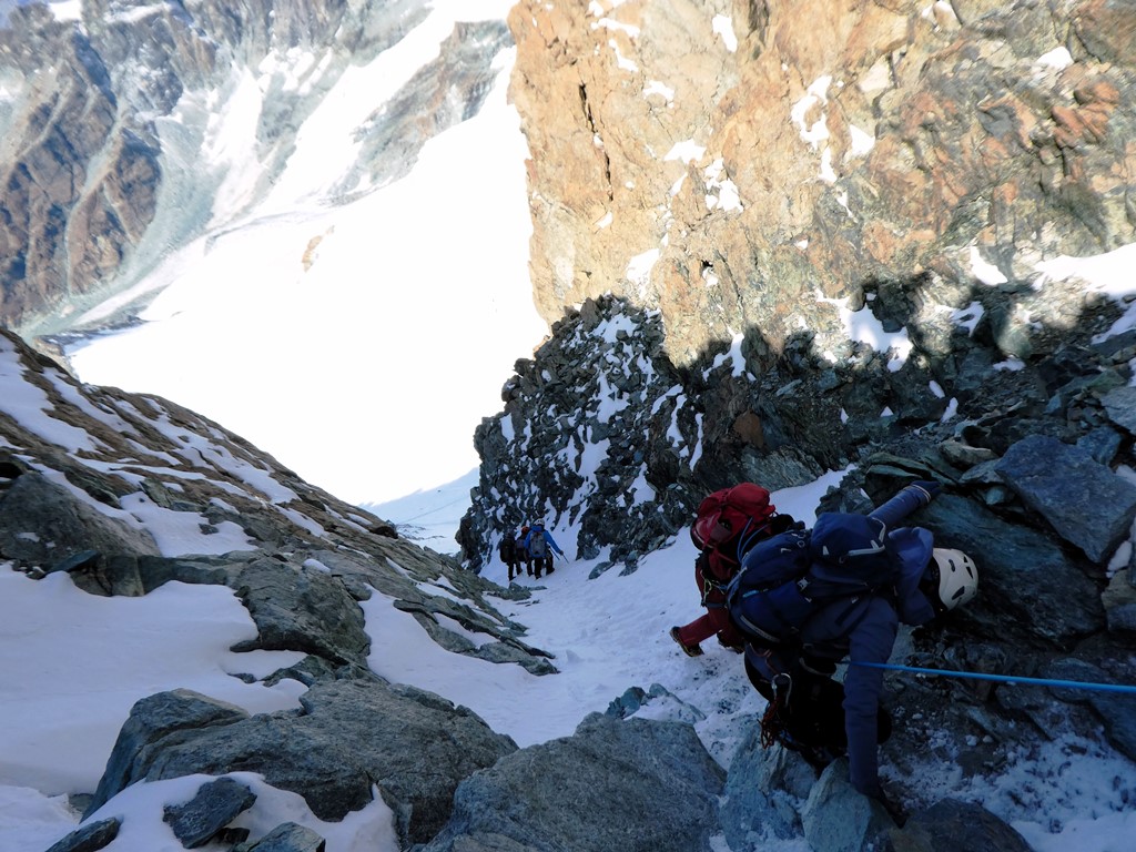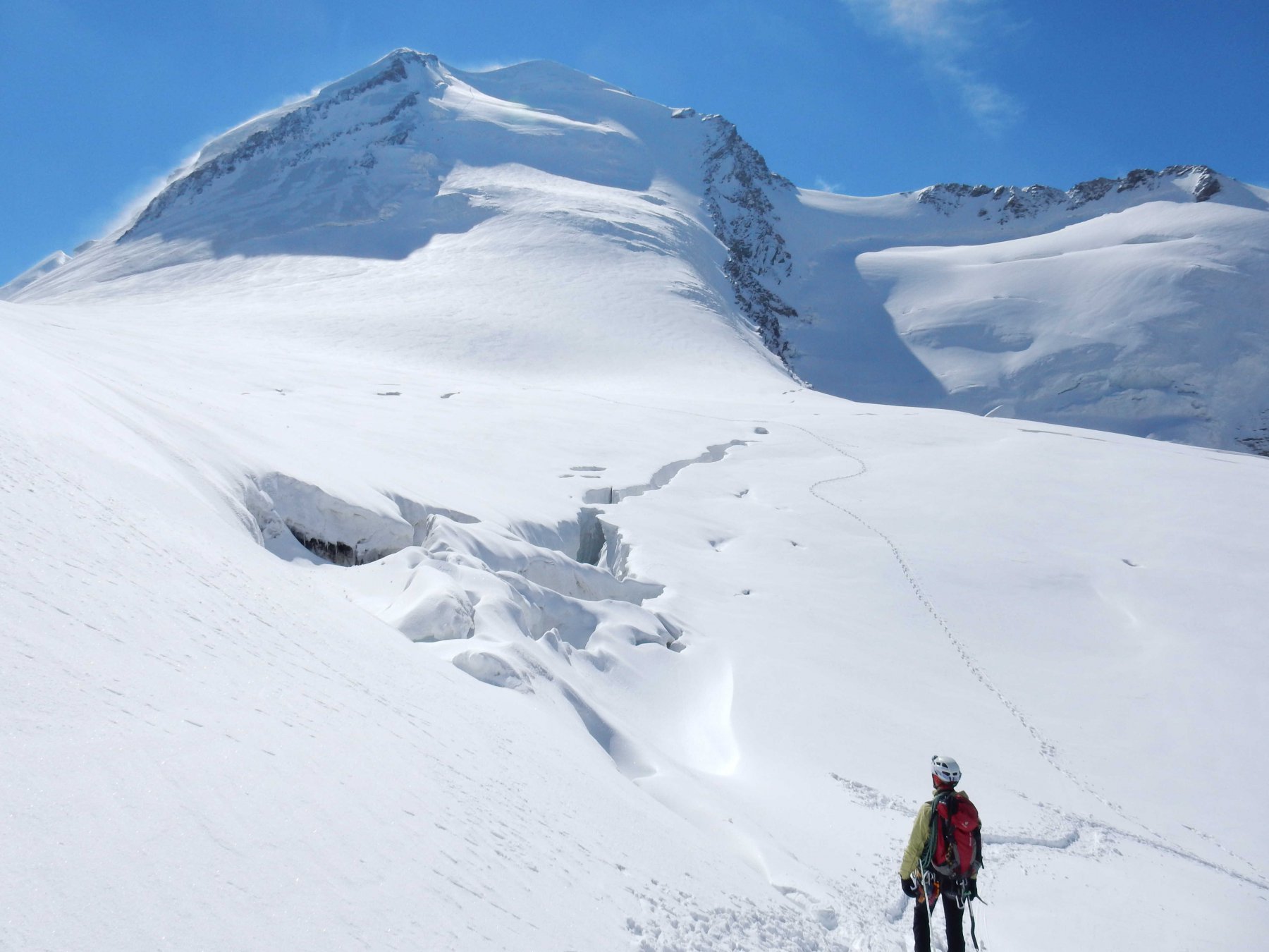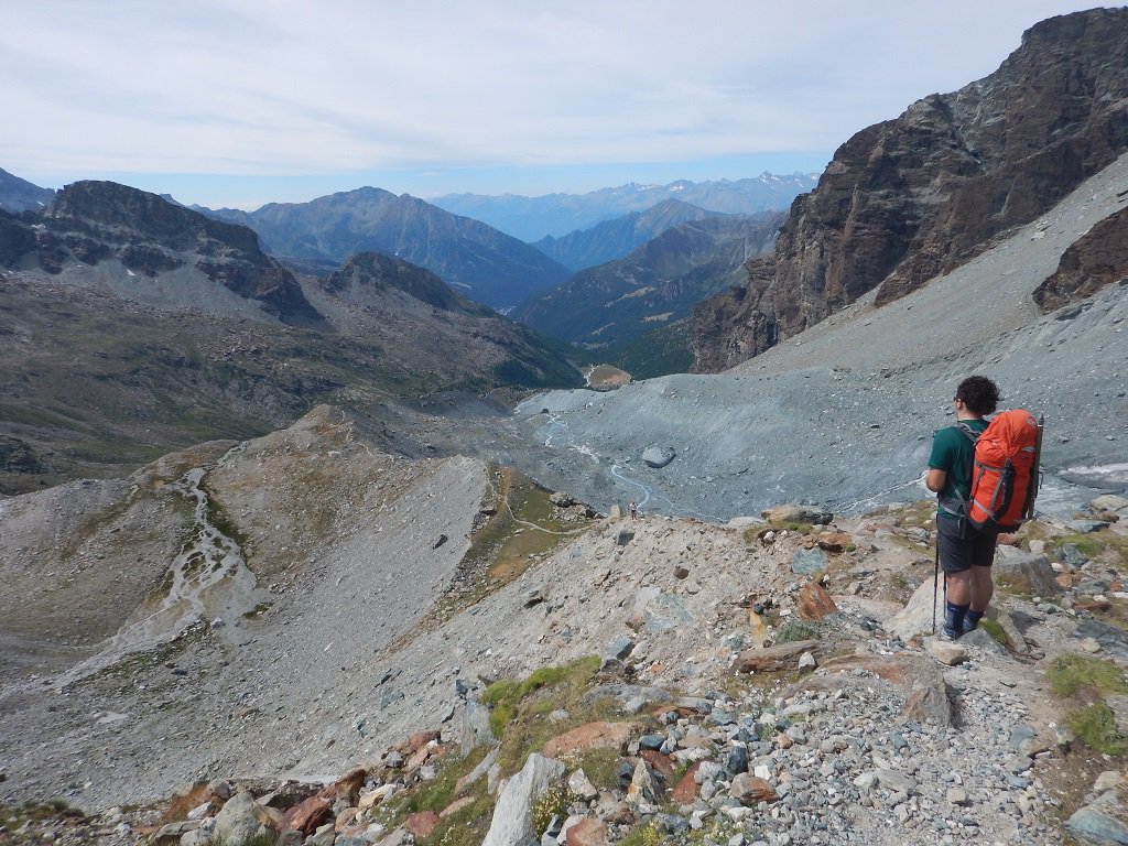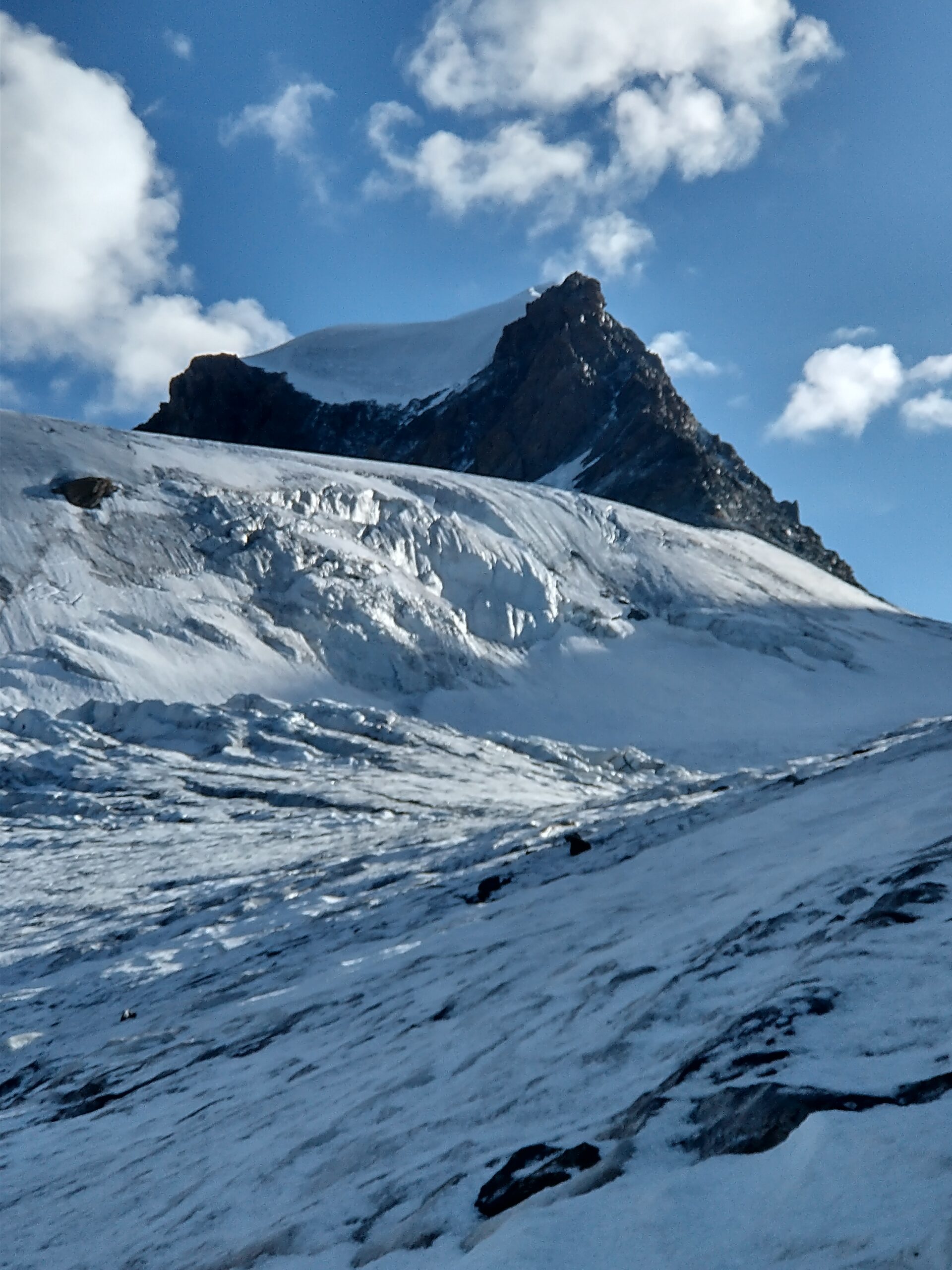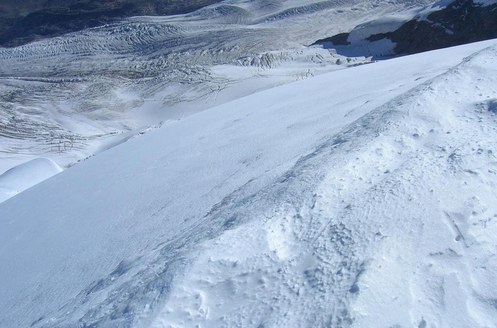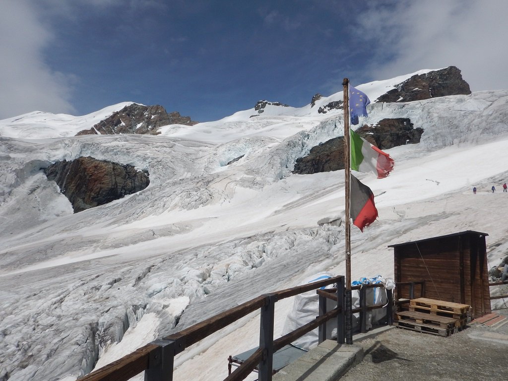 Dal rifugio Guide della Val d’Ayas si raggiunge il lungo avvallamento formato dal ghiacciaio delimitato a sinistra dalla seraccata della parte superiore del ghiacciaio di Verra.