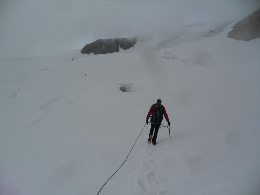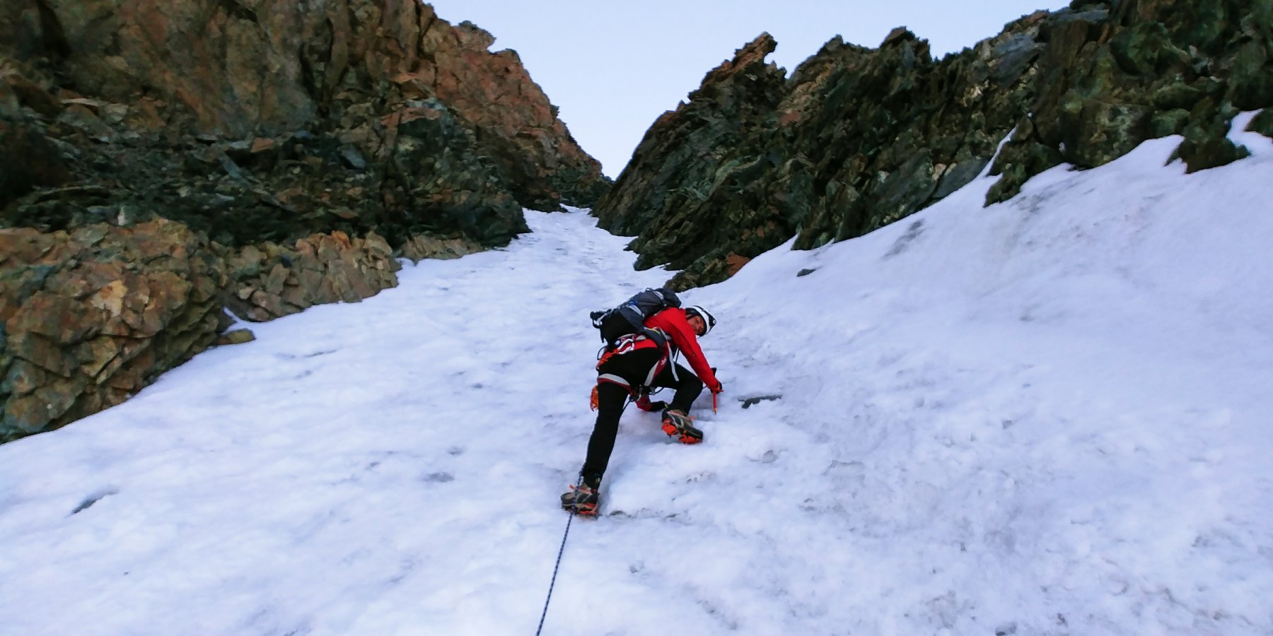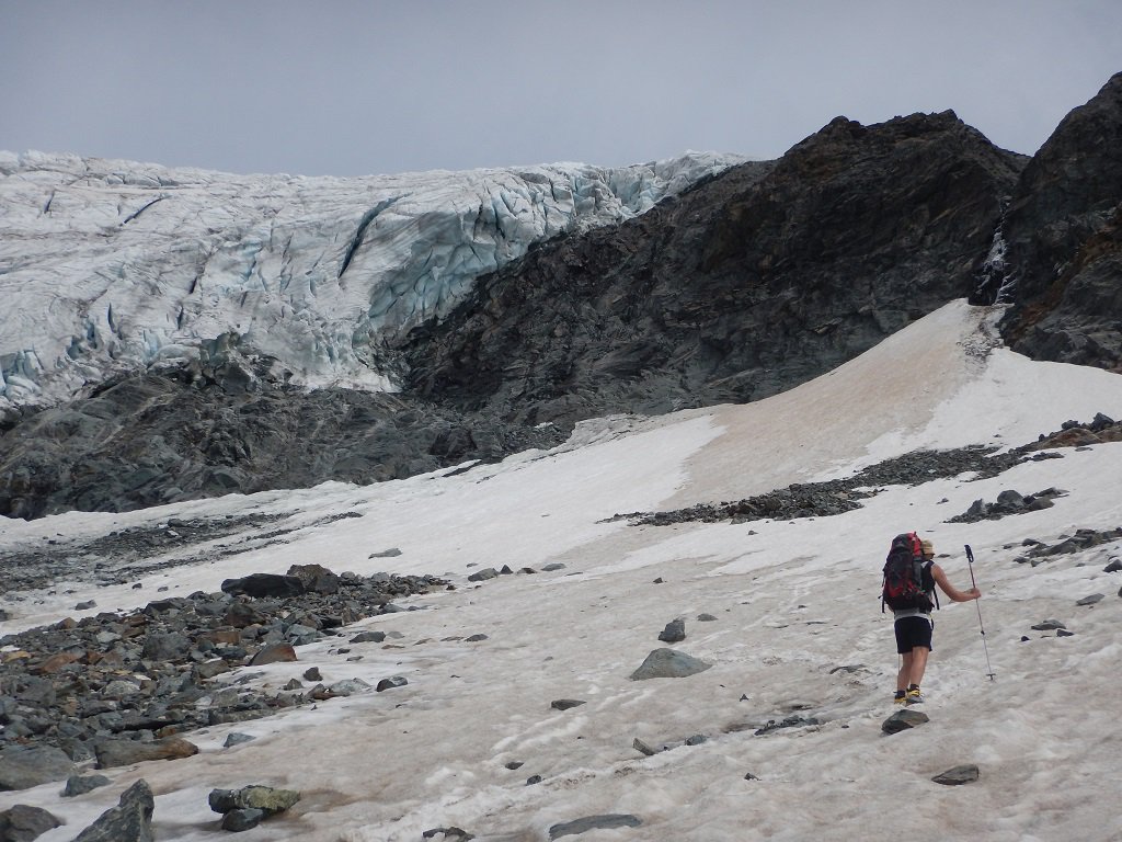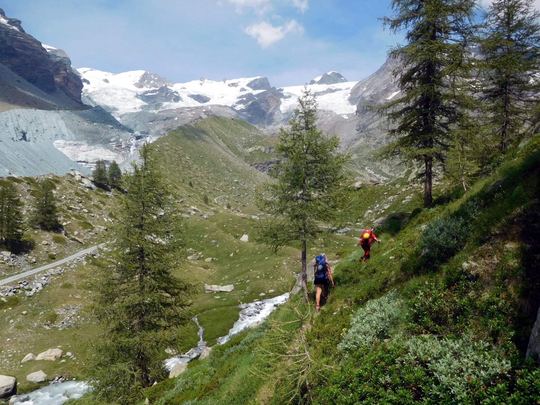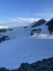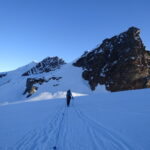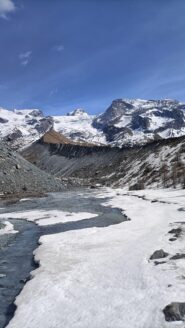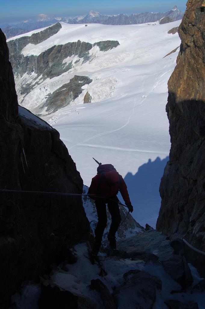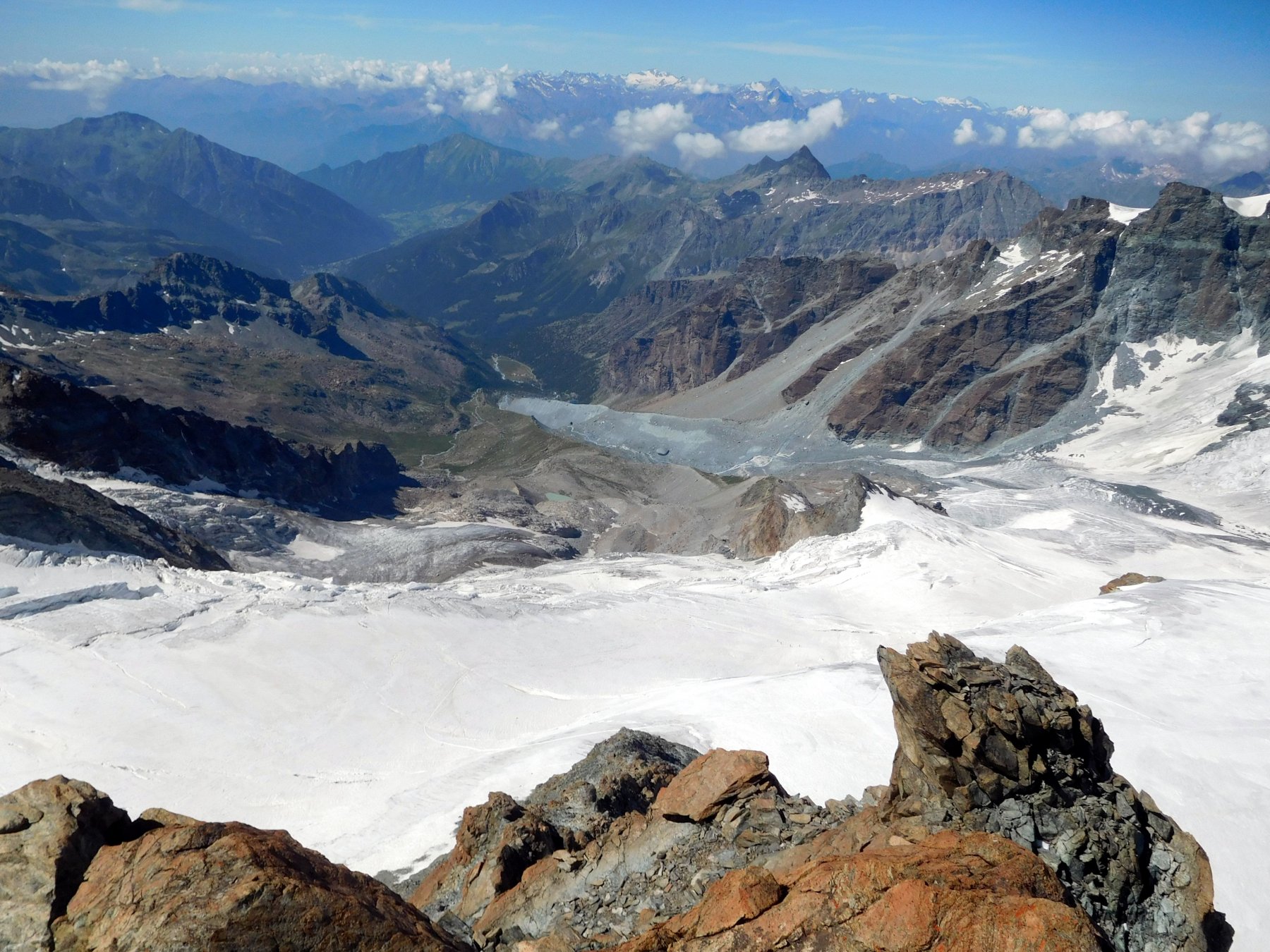 Dal rifugio Guide della Val d’Ayas si raggiunge il lungo avvallamento formato dal ghiacciaio delimitato a sinistra dalla seraccata della parte superiore del ghiacciaio di Verra.