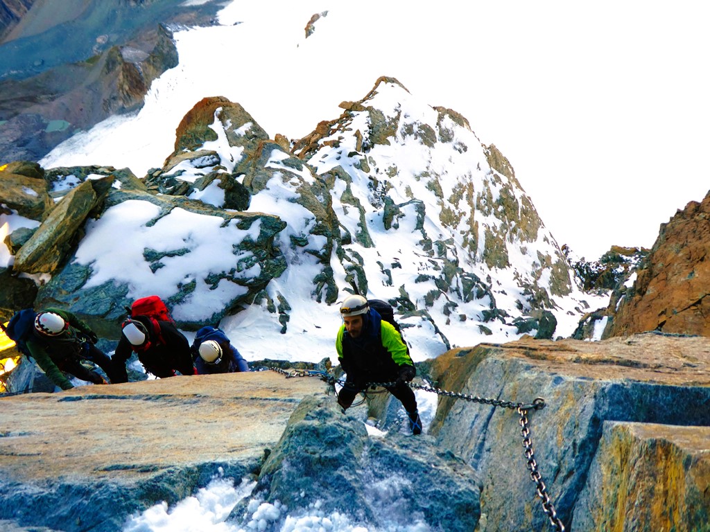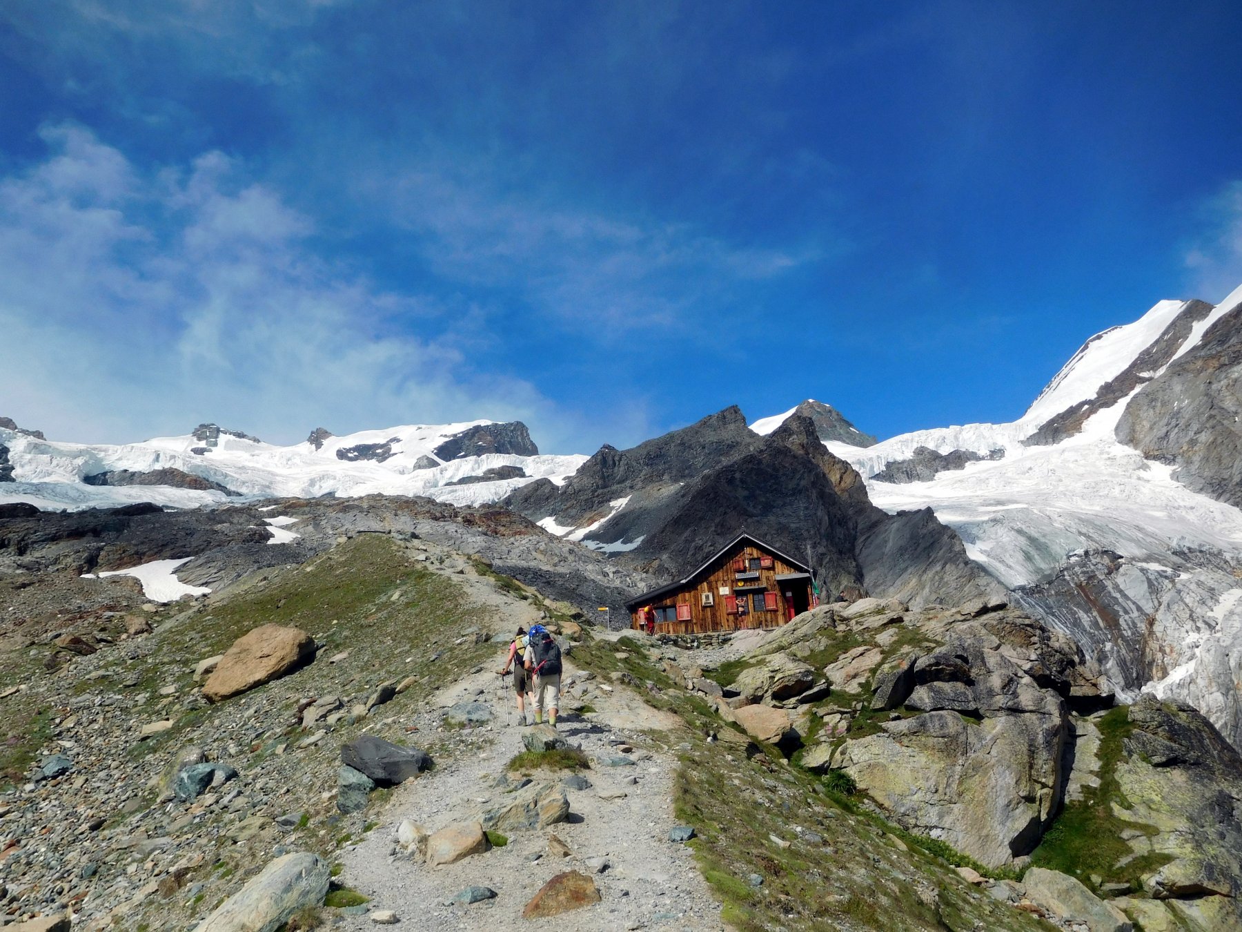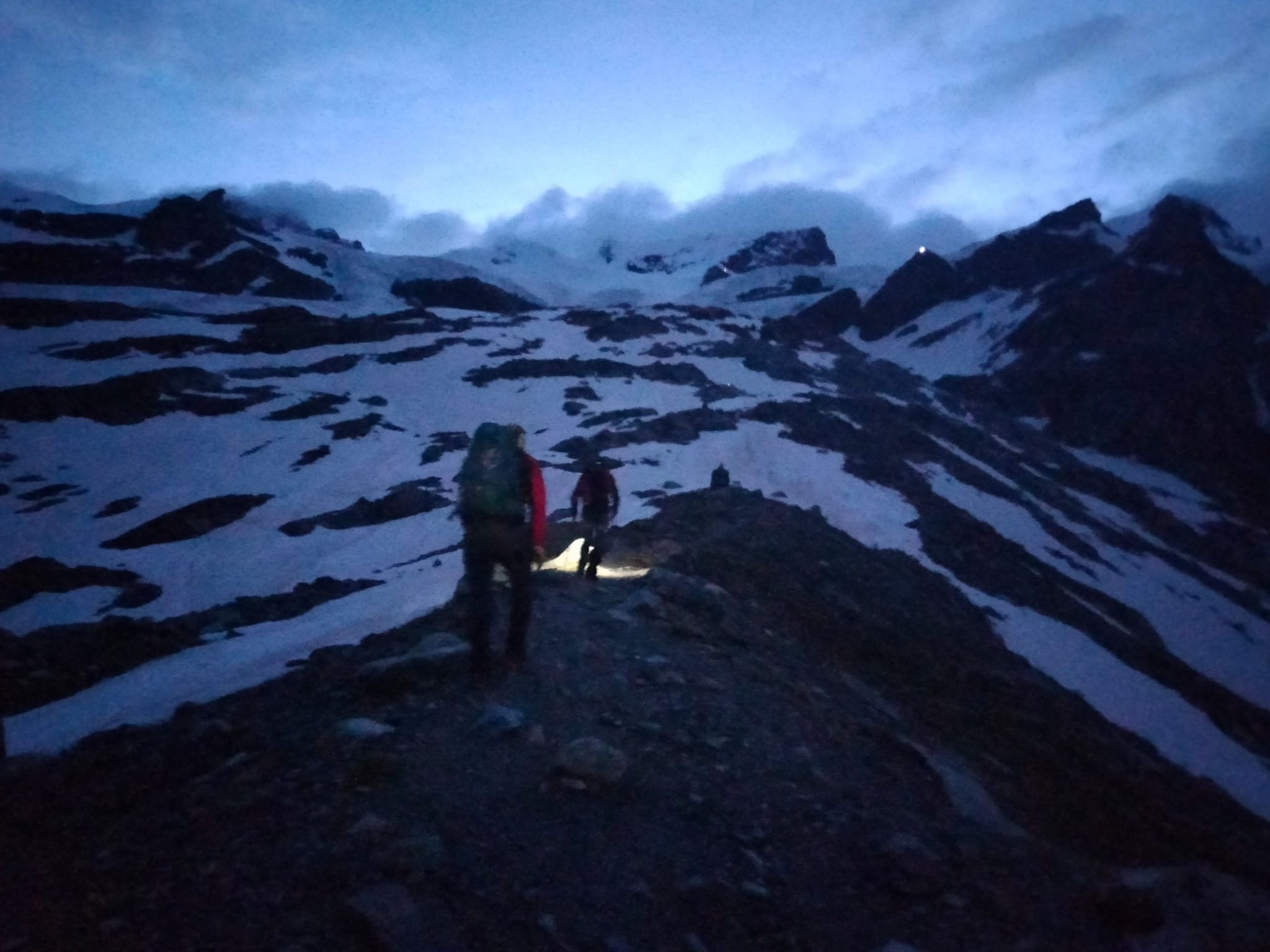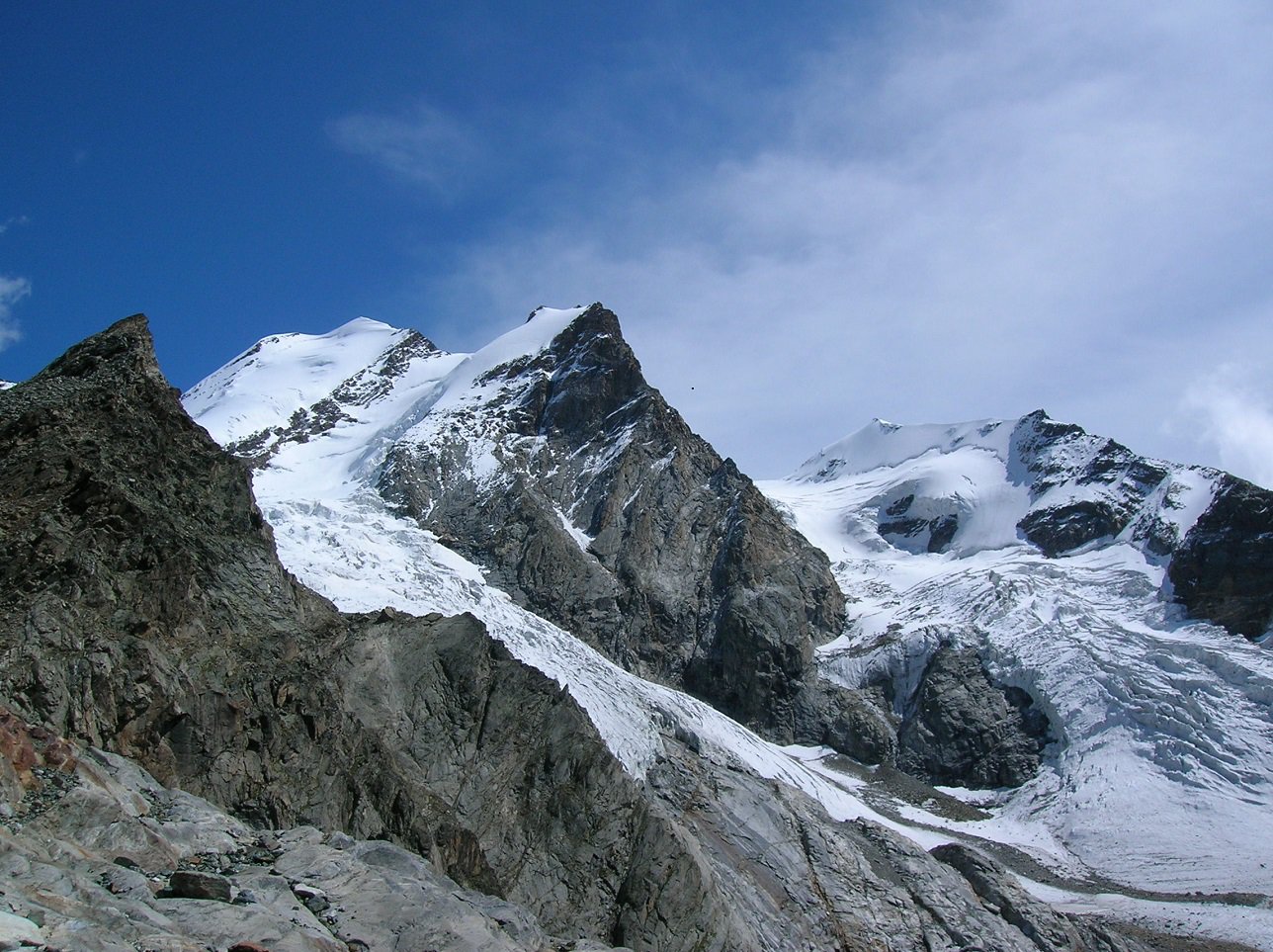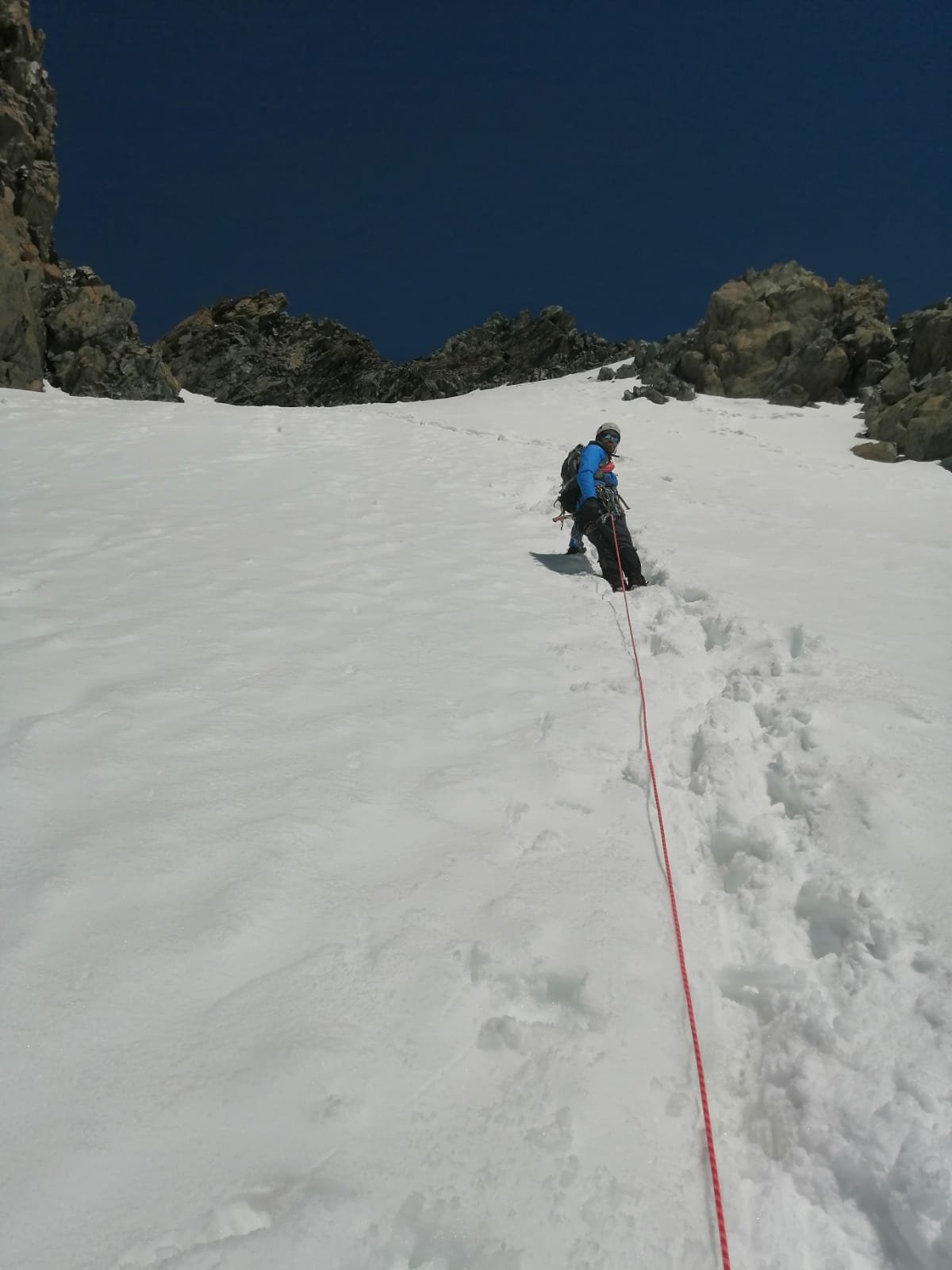 Dal rifugio Guide della Val d’Ayas si raggiunge il lungo avvallamento formato dal ghiacciaio delimitato a sinistra dalla seraccata della parte superiore del ghiacciaio di Verra.