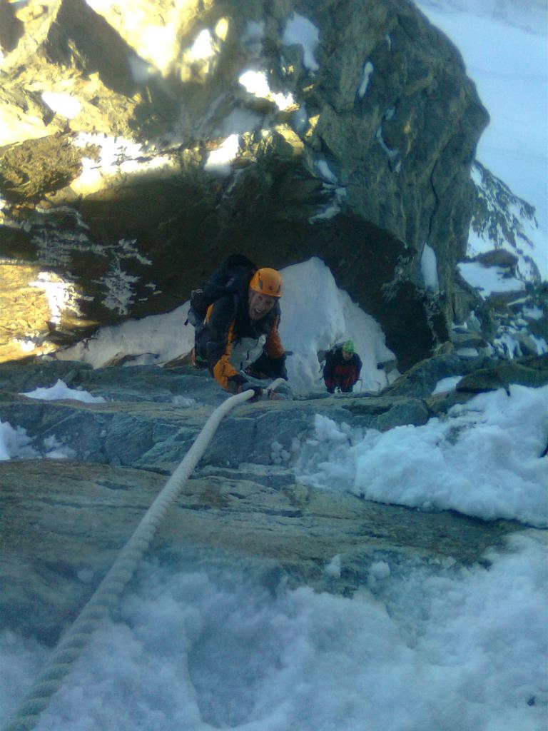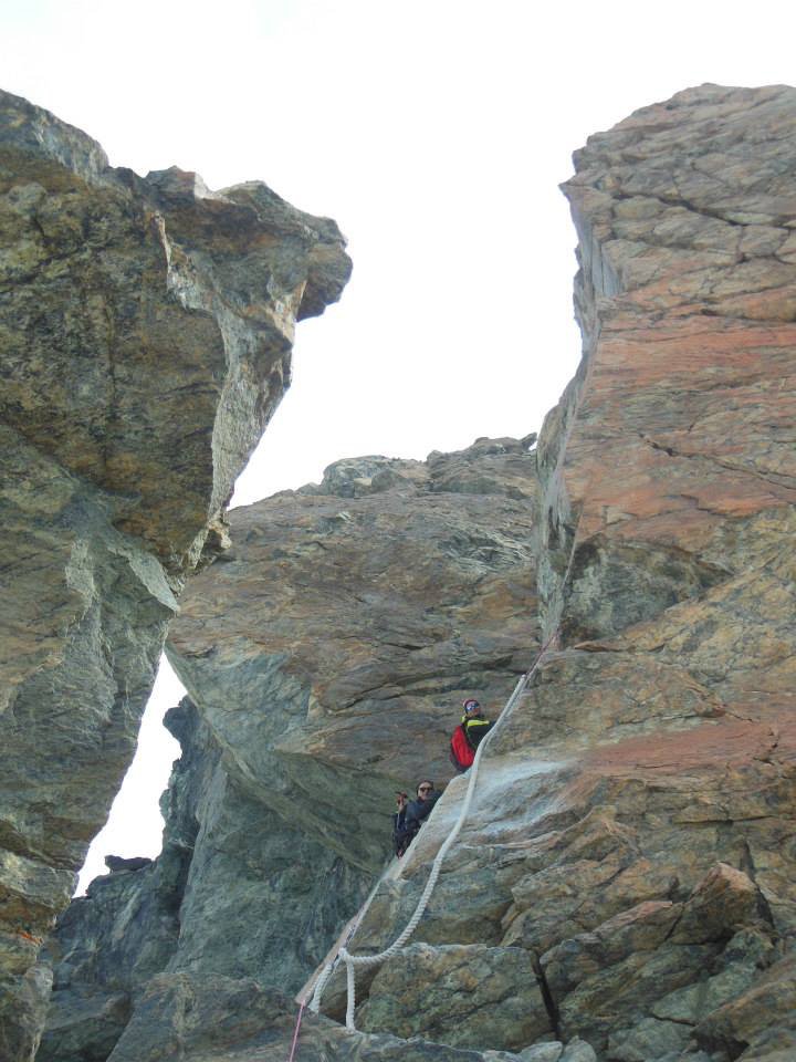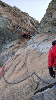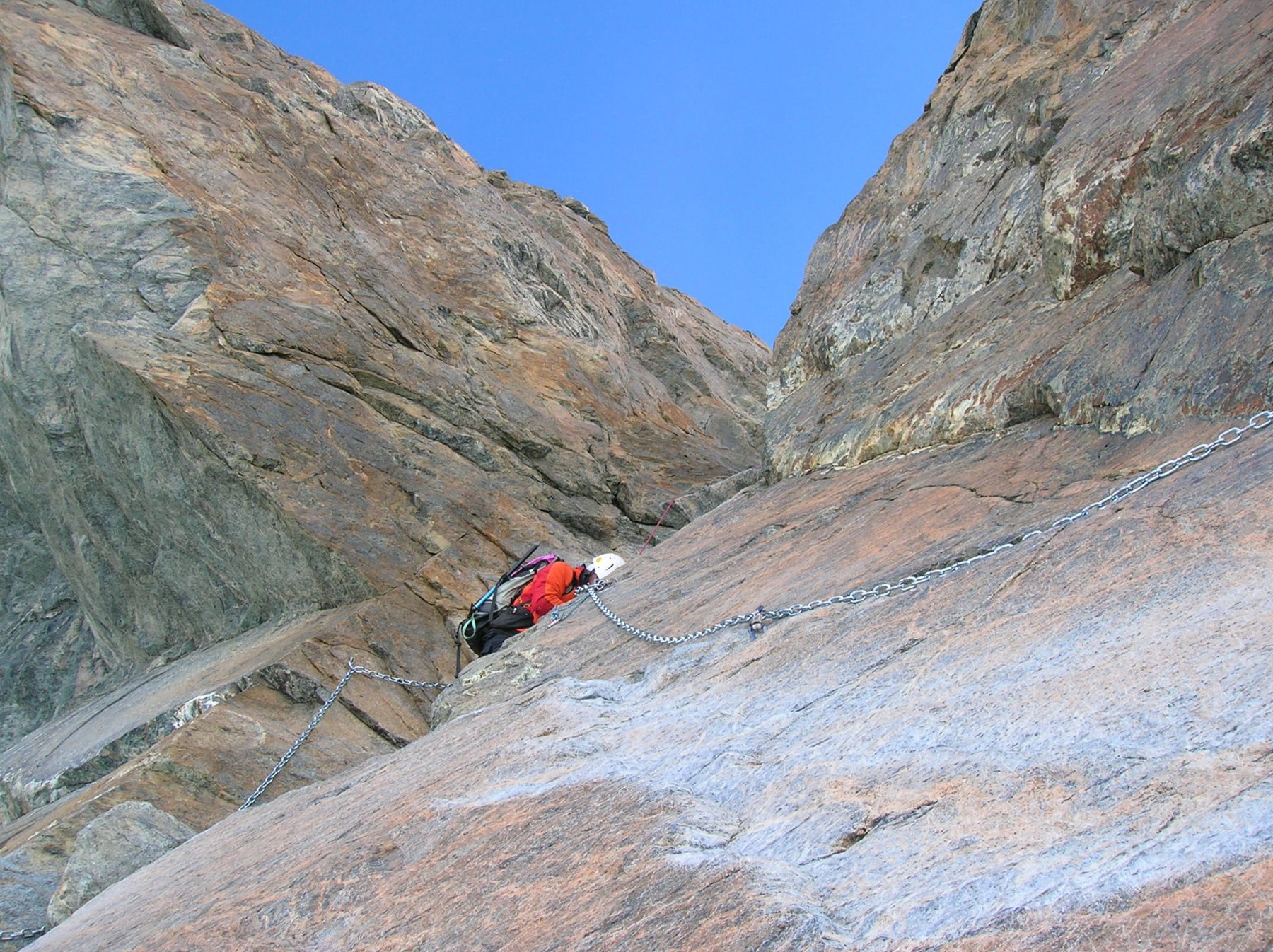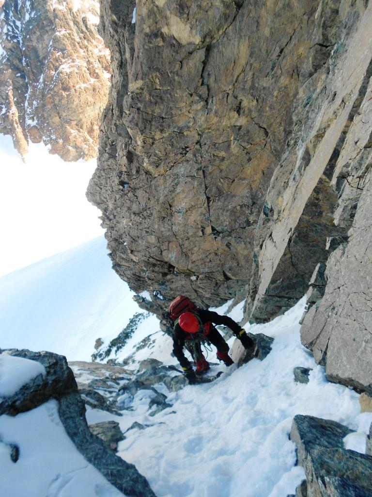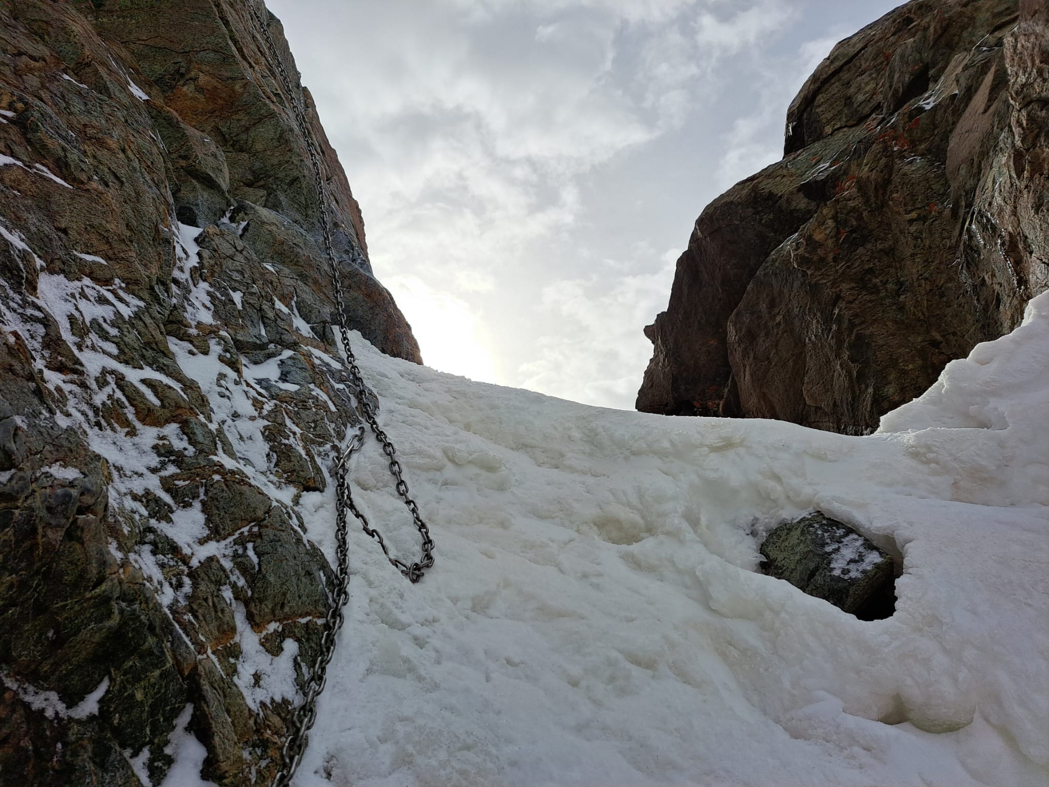 Si risale poi un profondo camino (III, spesso ghiacciato, canapone) e si supera un masso incastrato fino a raggiungere una piccola selletta che divide i due tratti con i canaponi.