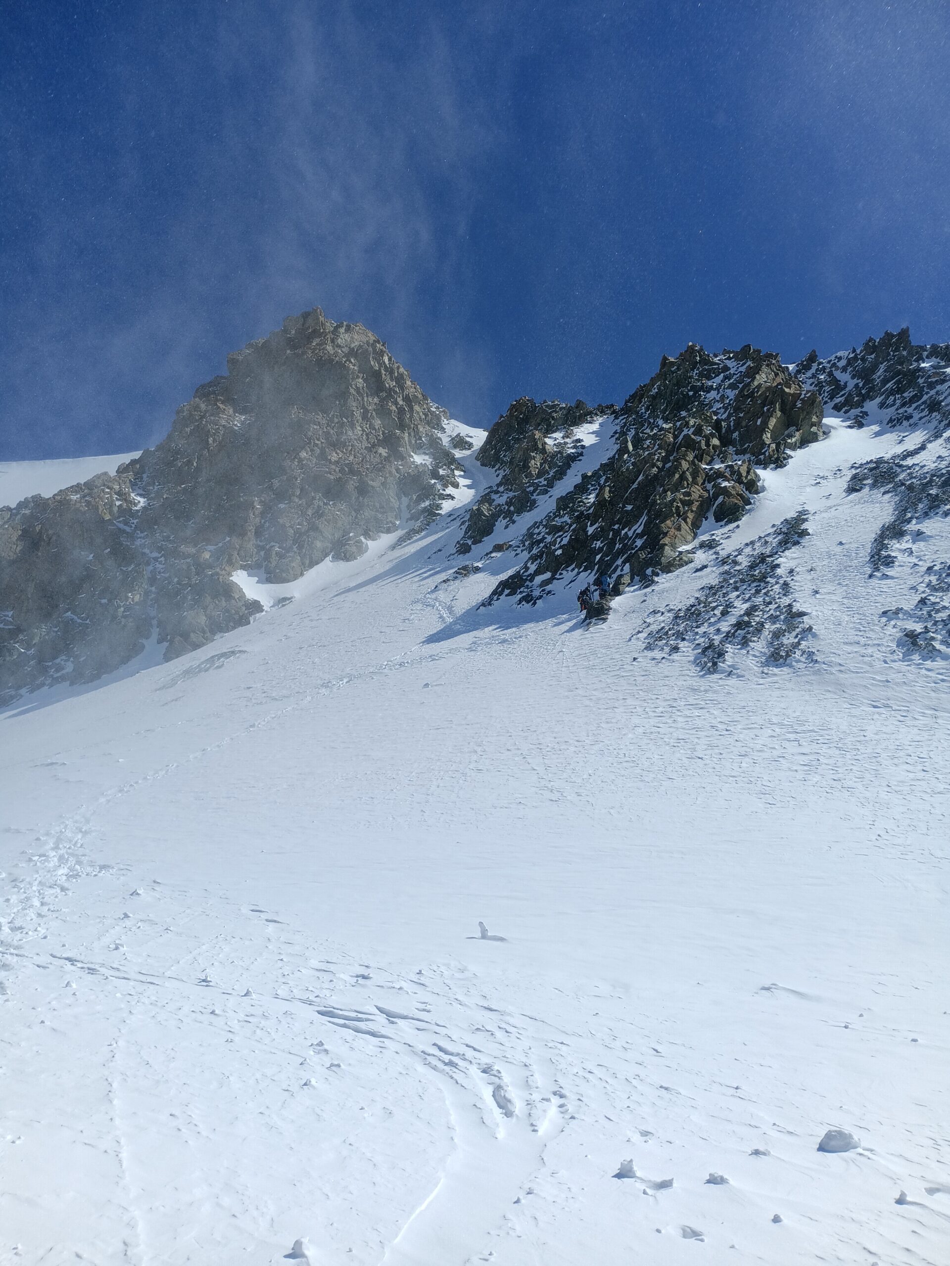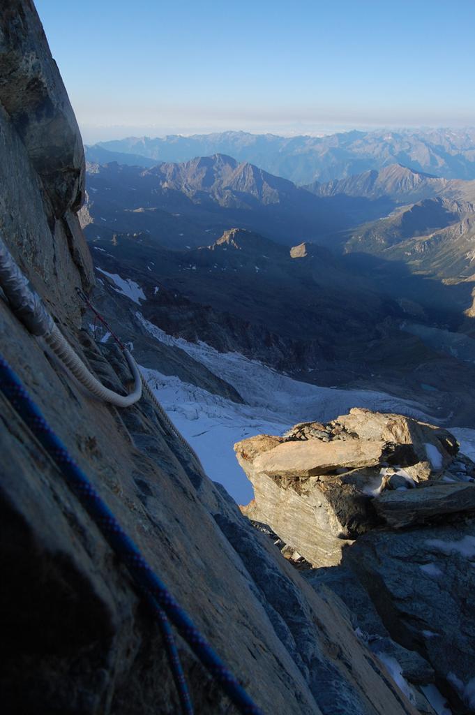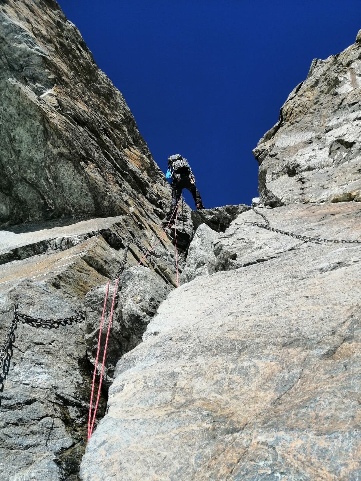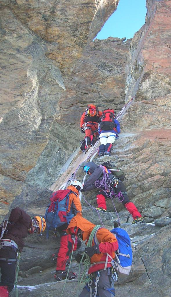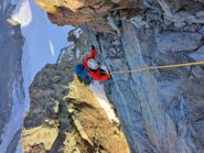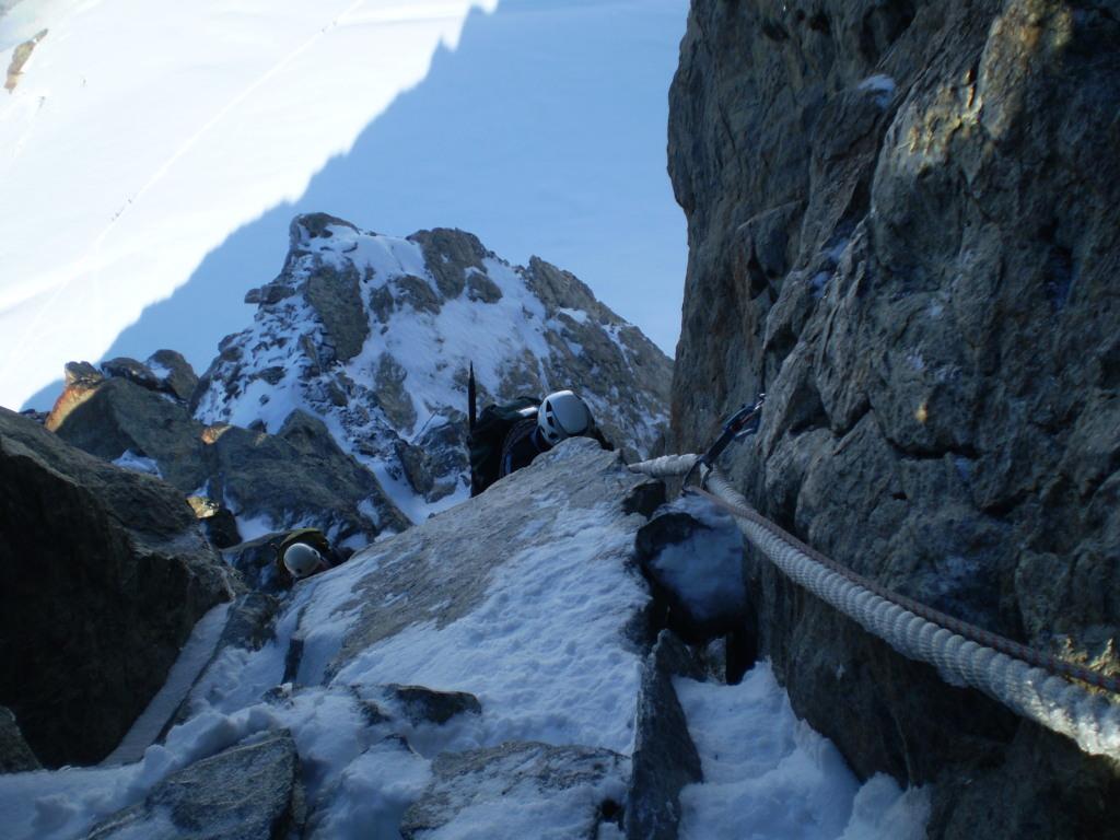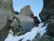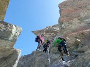 Si risale poi un profondo camino (III, spesso ghiacciato, canapone) e si supera un masso incastrato fino a raggiungere una piccola selletta che divide i due tratti con i canaponi.