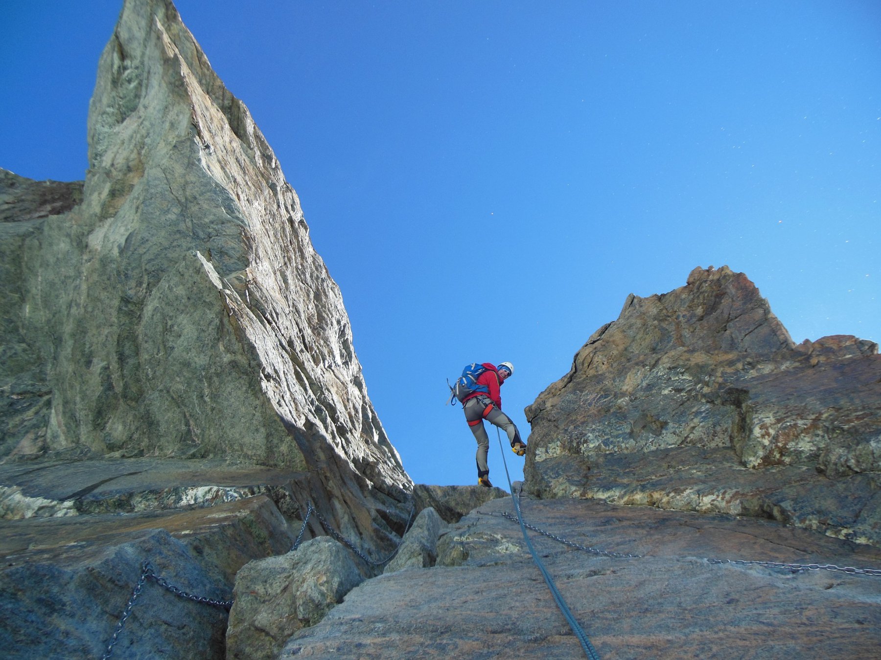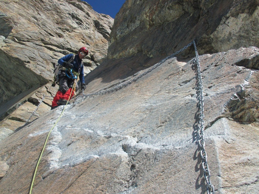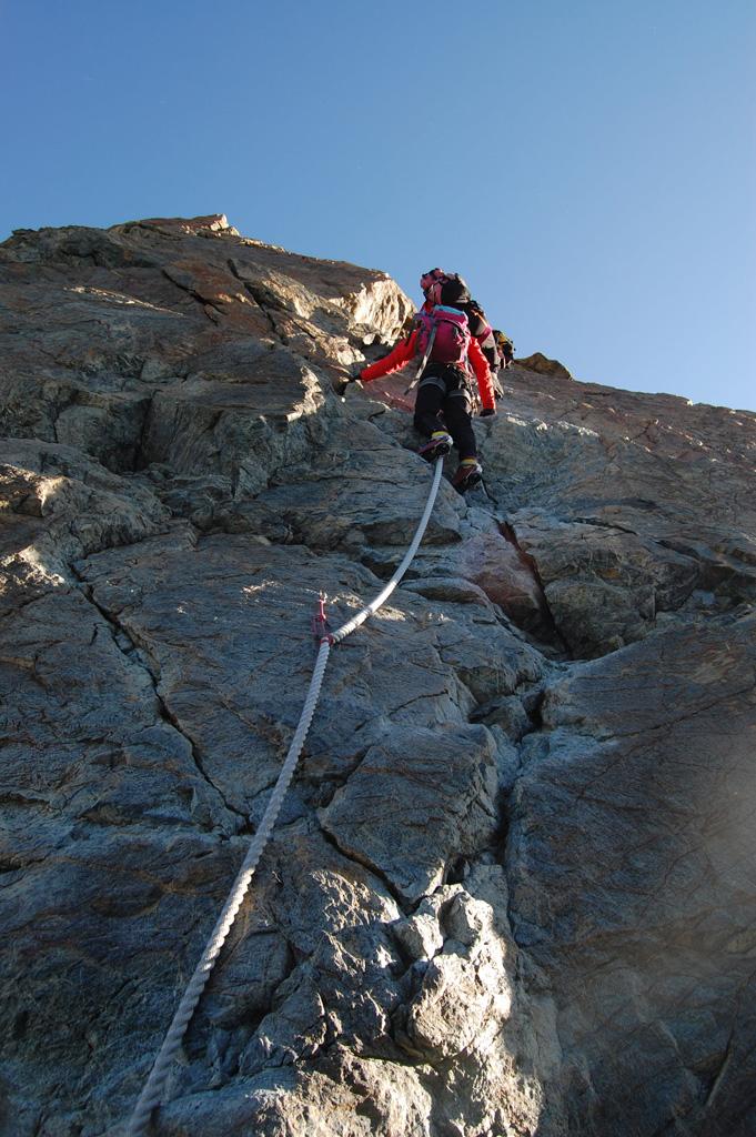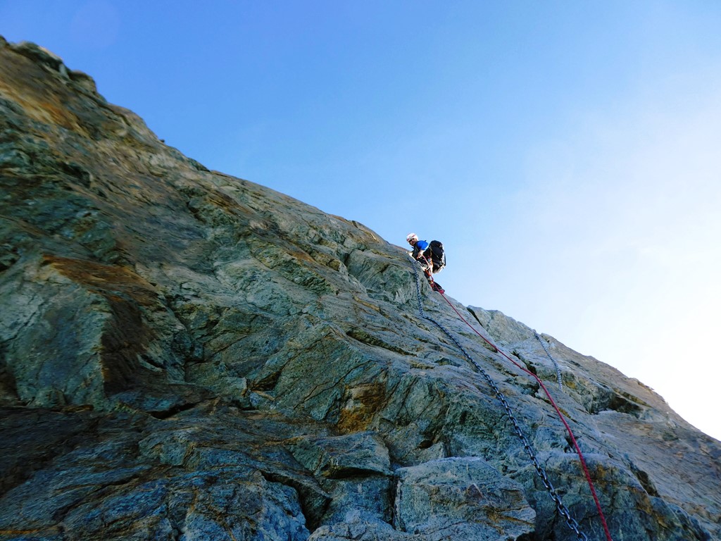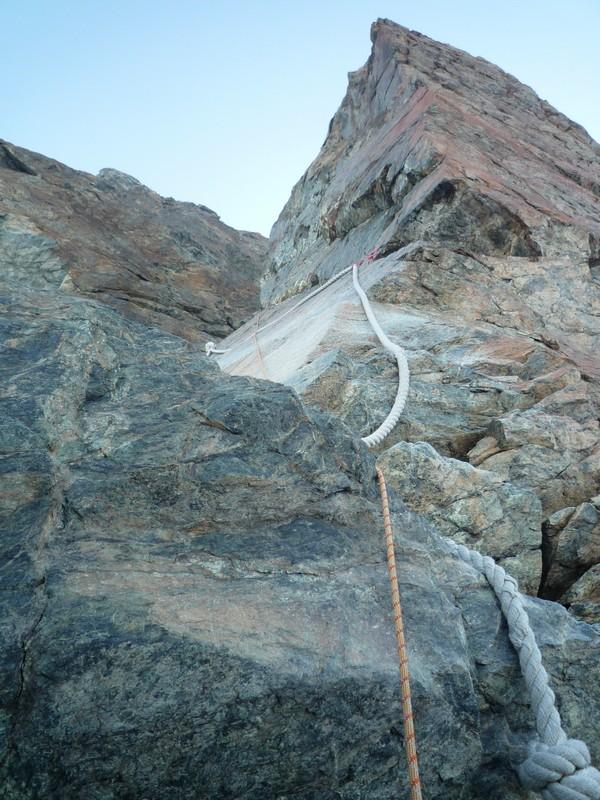 Da qui il percorso è in comune. Per blocchi e sfasciumi si giunge fino ad un risalto. Lo si può evitare a sinistra o a destra, poi si arriva al tratto con i canaponi. Dapprima si traversa a sinistra su placche lisce.