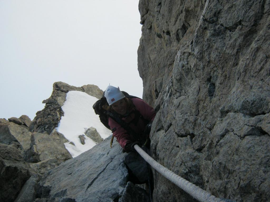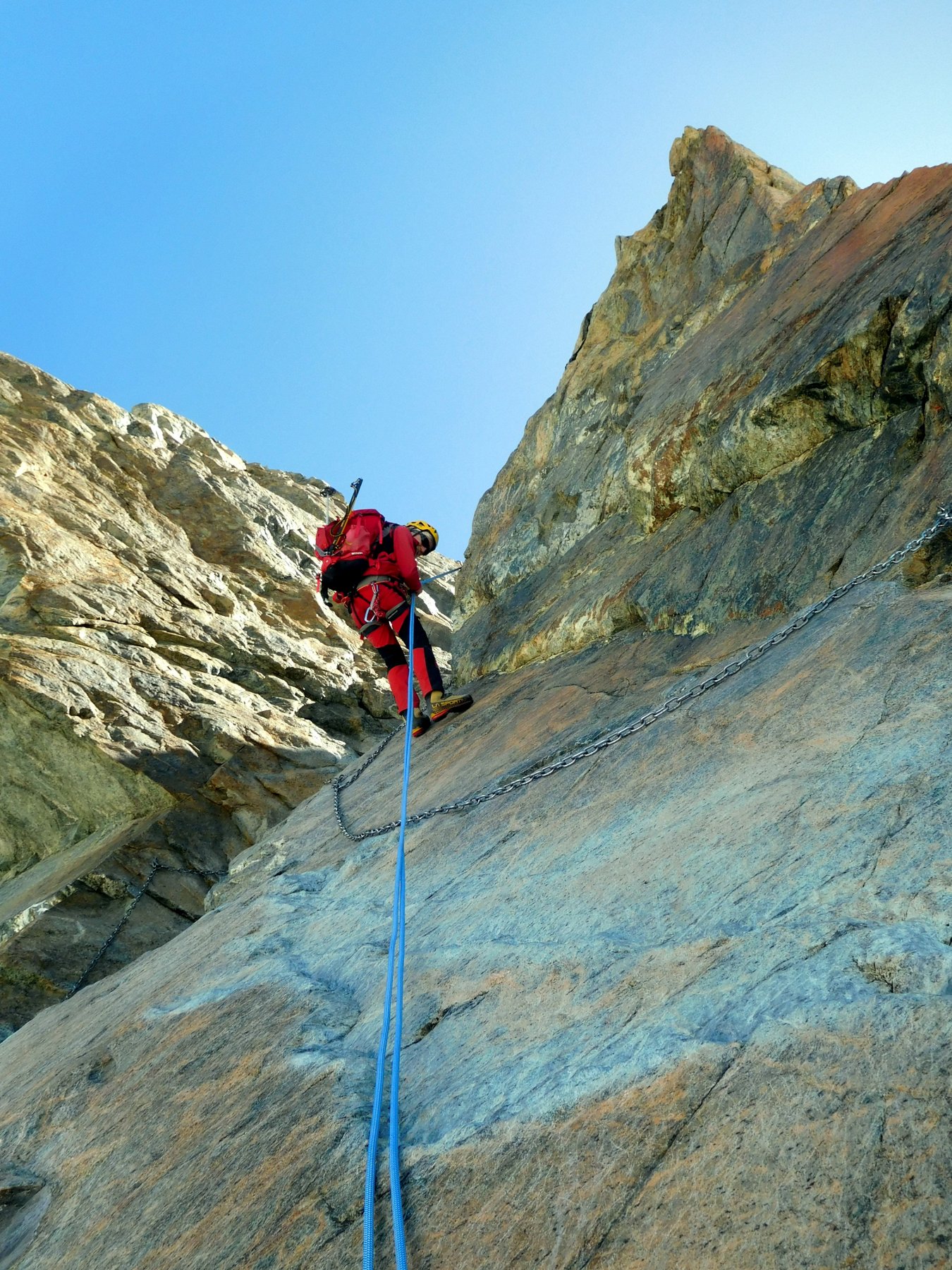 Si supera dunque la parete rocciosa a sinistra (canapone, 20m tot., doppia per la discesa) per uscire sulla spalla SO, dove è posizionata una Madonnina.