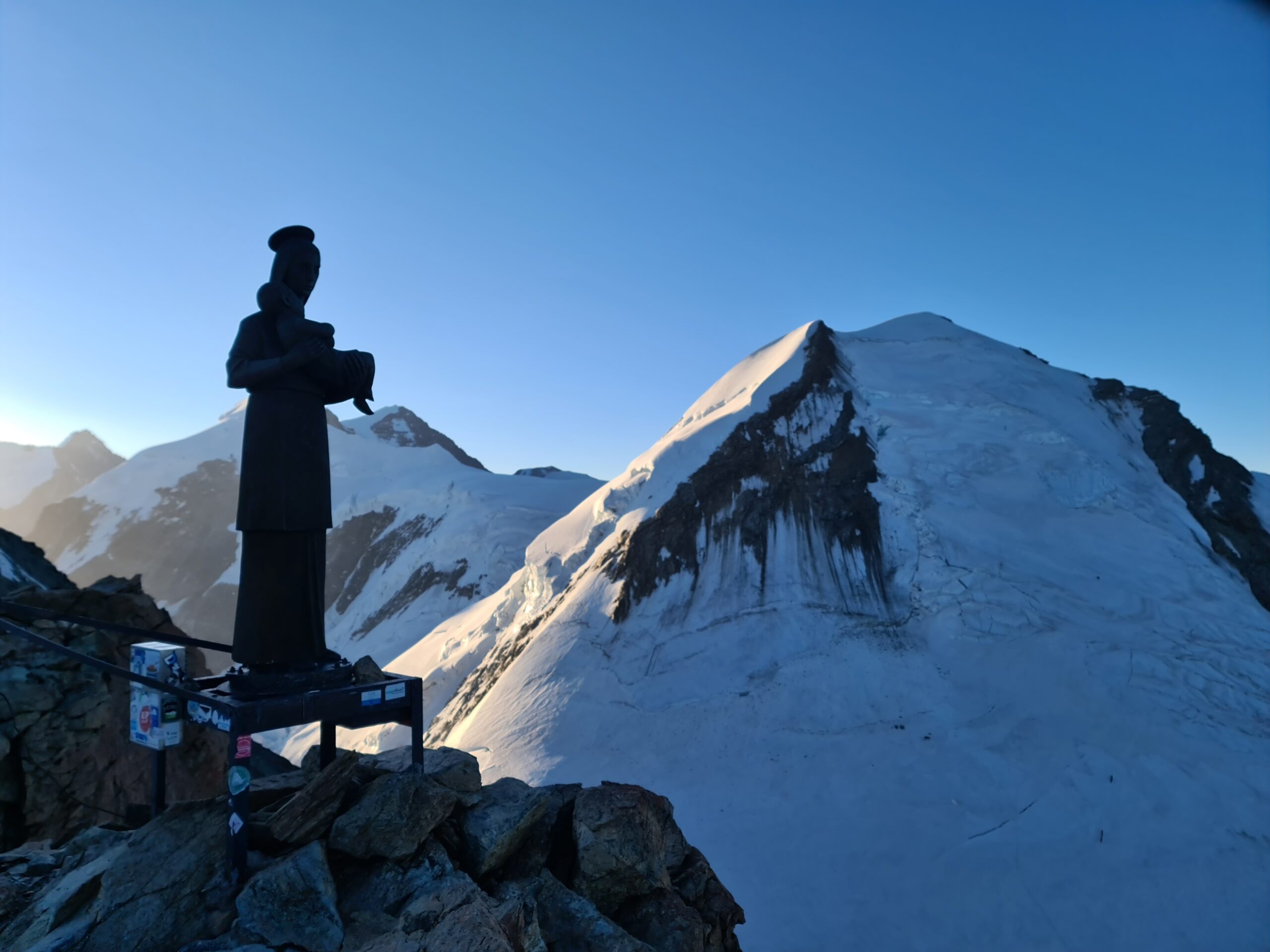 Giorno 2: partiti per primi alle 3.30 dal Rifugio per salire sia Polluce che Castore; in 1h circa di percorso glaciale abbiamo raggiunto il Colle tra I Gemelli e siamo saliti a sinistra per ghiaccio duro e detriti fin sotto il Polluce (seguire la traccia con testa, i creppi si aprono talmente velocemente che non è detto che dove passavano il giorno prima si possa passare il giorno dopo, in ogni caso tenere sempre la sinistra). Purtroppo, essendo al buio e non conoscendo la zona, dopo mezz’ora di ricerca non abbiamo trovato l’attacco della cresta e siamo saliti per un ripido canale di ghiaccio e detriti (credo quello da fare in primavera, anche se ora completamente asciutto) che per la sua delicatezza ci ha ritardato di ben 1h e passa, sbucando poi direttamente all’inizio delle ultime catene per arrivare alla madonnina: qui i passaggi più fisici ma comunque sempre ben ammanigliati e con buoni piedi. Una volta dalla madonnina, in 10 min si è in Vetta per facile ma ripida cresta nevosa. Rientro più facile per il percorso di cresta, che dall’alto e col sole invece si individua facilmente, fino a circa 50mt dalla basa dove abbiamo, stavolta volontariamente, deviato sugli sfasciumi lato Castore perché il nostro intento, riuscito, era poi scalare anche questo.