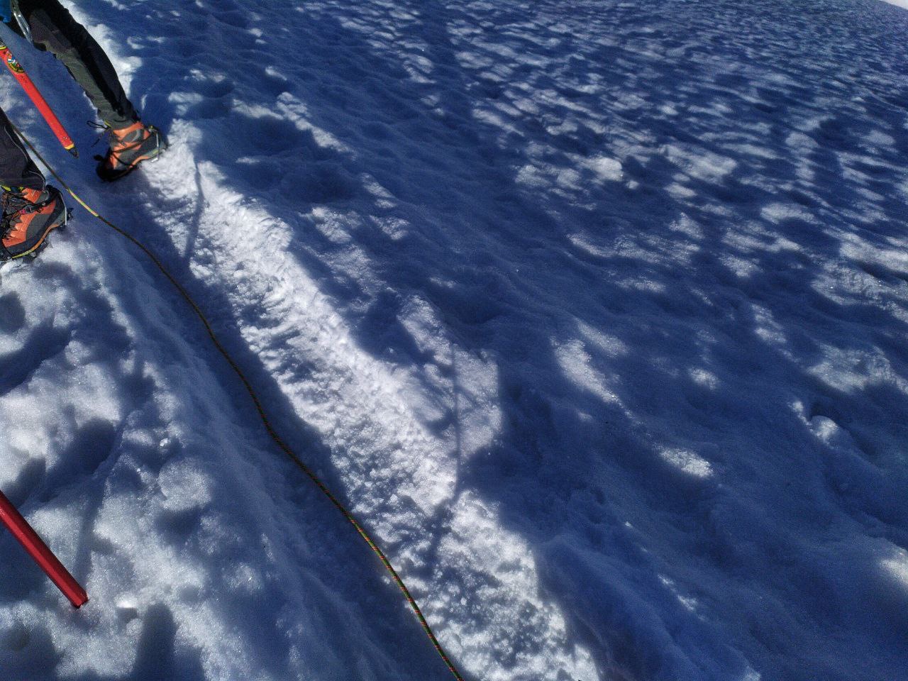 Al ritorno (in cima alle 08:50 ritornati al guide d’ayas alle 11:20) naturalmente la neve molla ed i ponti diventano pericolosi. Non troppi crepacci brutti, ne avrò contati al