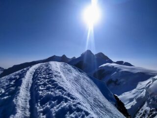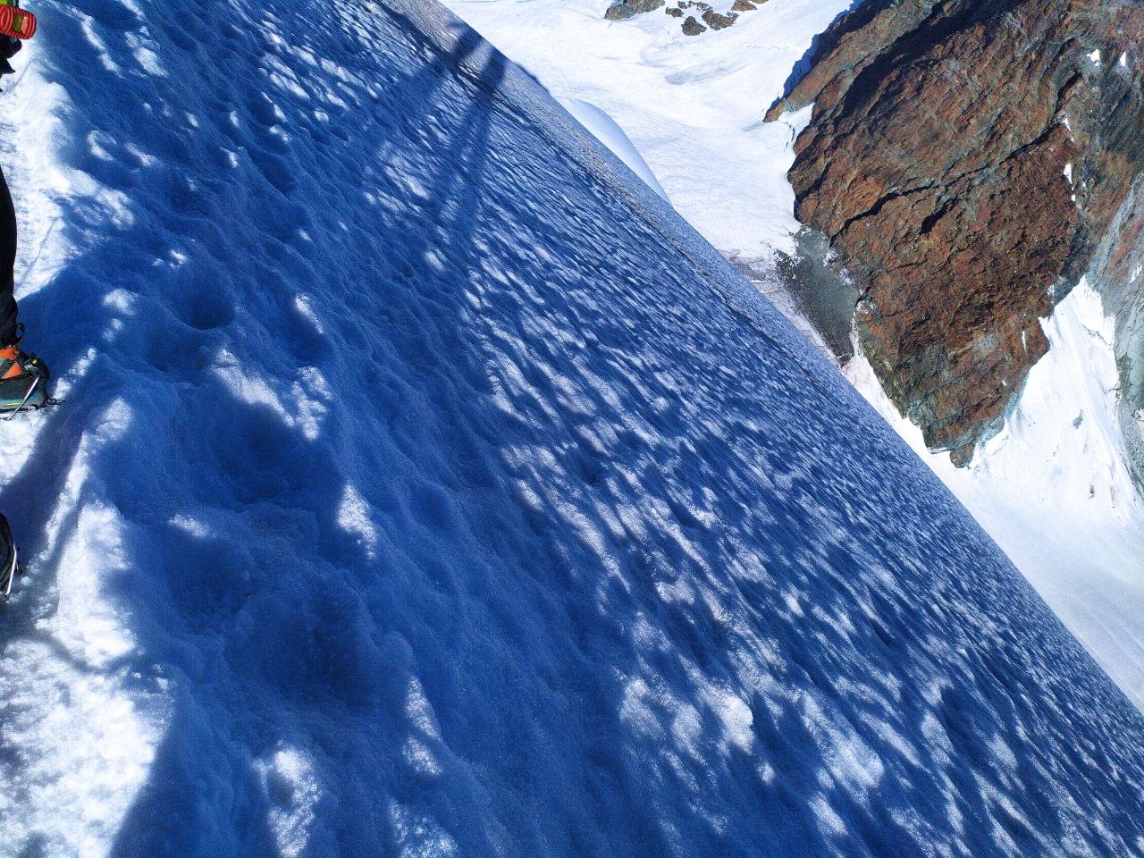 Traccia ben visibile dopo i primi 200 metri di dislivello ovvero appena usciti dalla parte iniziale del ghiacciaio che è senza copertura nevosa ed appunto di difficile interpretazione al buio, poi nessun problema ed impossibile sbagliare. Roccia pulita da affrontare senza ramponi. Cresta finale panoramica e in ottime condizioni, larga e tracciata perfettamente.