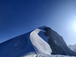 Cima completa e veramente divertente. C’è tutto, ghiacciaio con pendenze fino a 30-35 gradi (il canalino non era innevato quindi non lo abbiamo fatto altrimenti sarebbero stai altri 45 gradi) parte rocciosa divertente anche perché non ben segnata quindi abbiamo dovuto “esplorare” ed interpretare. Le placche attrezzate con catene bellissime, facili e assolutamente fattibili anche senza catene, non era nelle mie possibilità ma per un alpinista piu esperto è sicuramente meglio farle senza catene, forse addirittura meno faticoso. Cresta molto bella, siamo arrivati in cima tardi, da quasi ultimi ed eravamo soli, pertanto ce la siamo goduta veramente tanto.