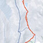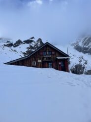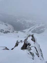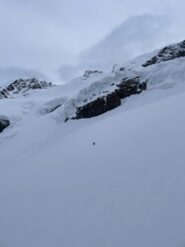 Si sale poi entrando nel ghiacciaio (seguendo il sentiero estivo con ometti e segni gialle sulle rocce se sgombre da neve) con un largo giro prima verso sinistra e poi a destra al rifugio guide d’ayas, subito visibile in alto su un grosso sperone roccioso.